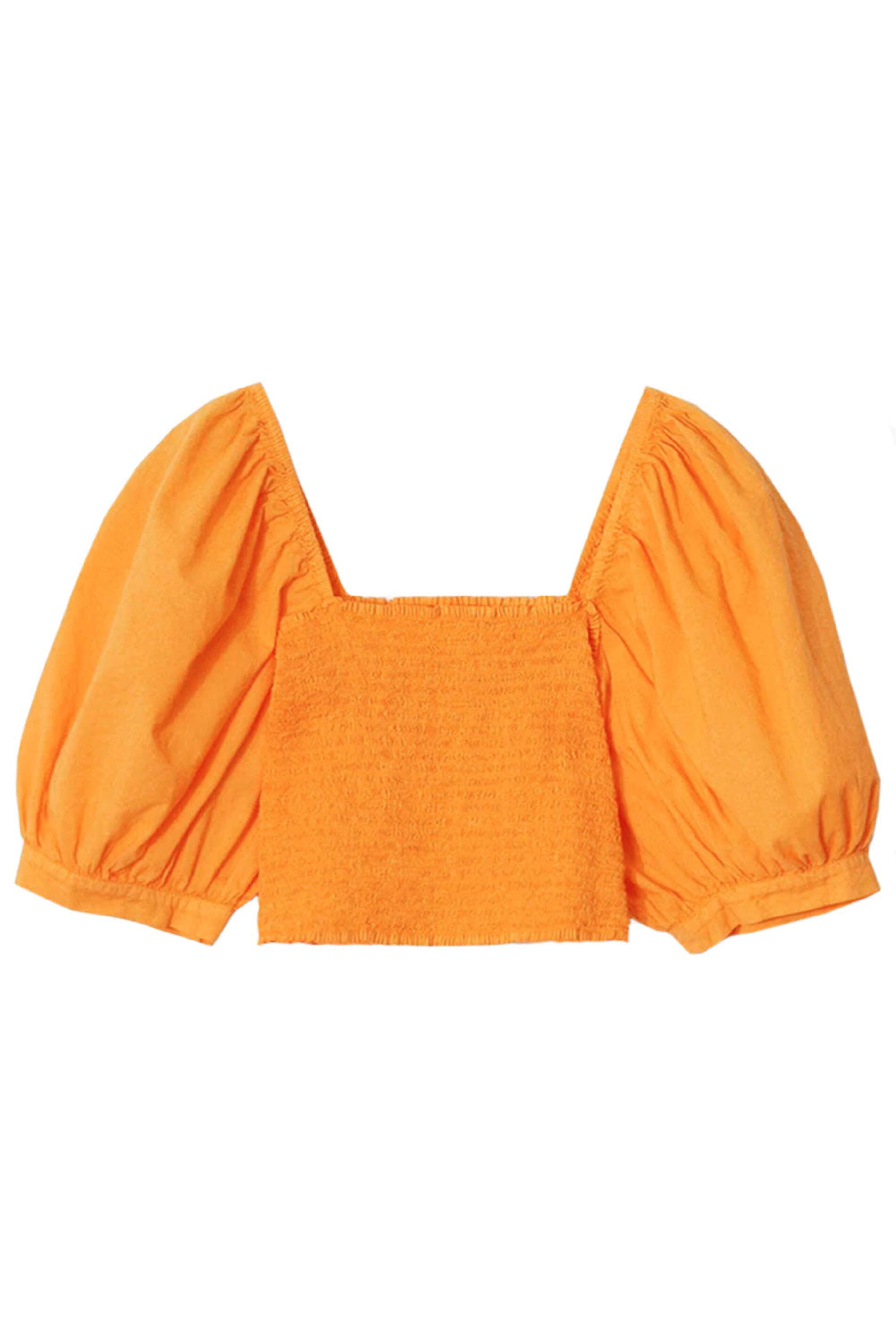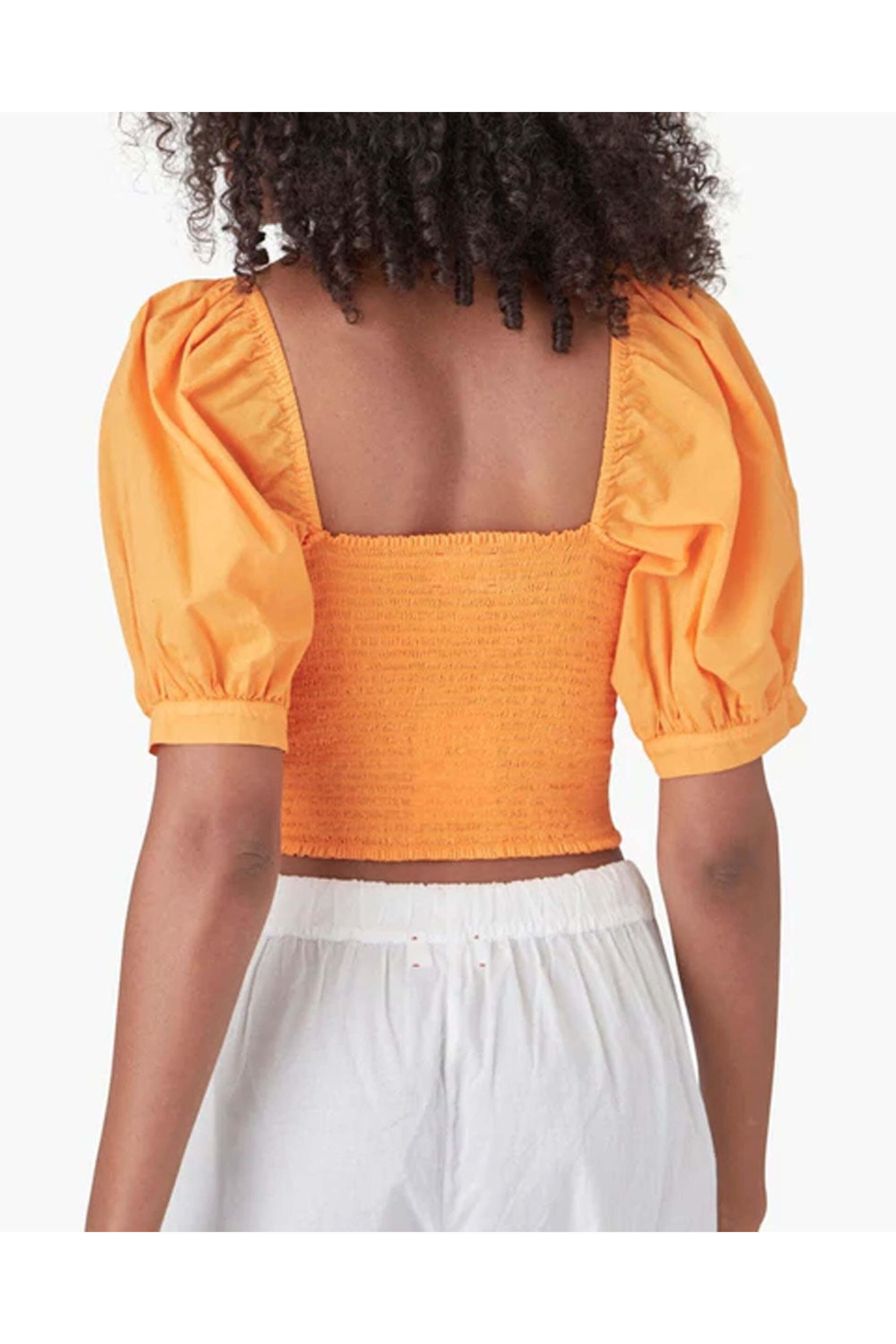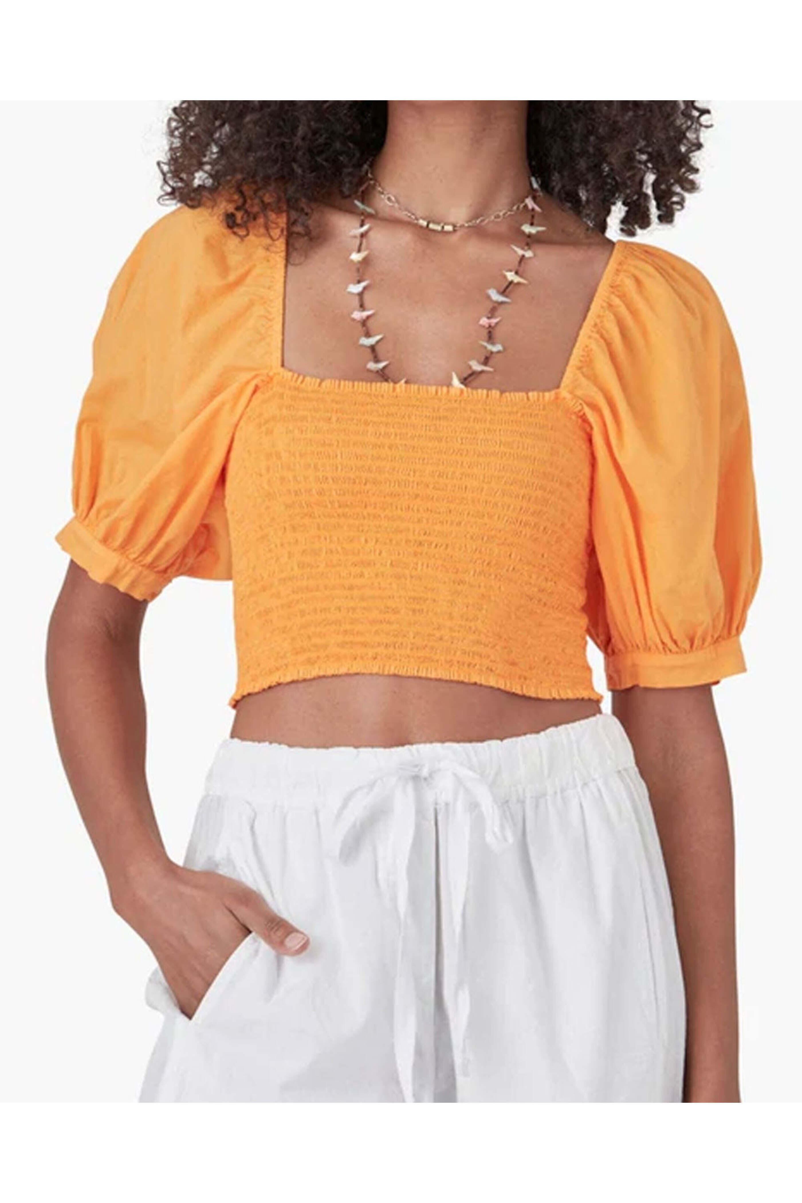 Xirena Apricot Issa Top. Square neck. Square back. Elbow length puff sleeves; banded cuffs. Smocked bodice. Cropped length. Slim fit. 100% cotton.