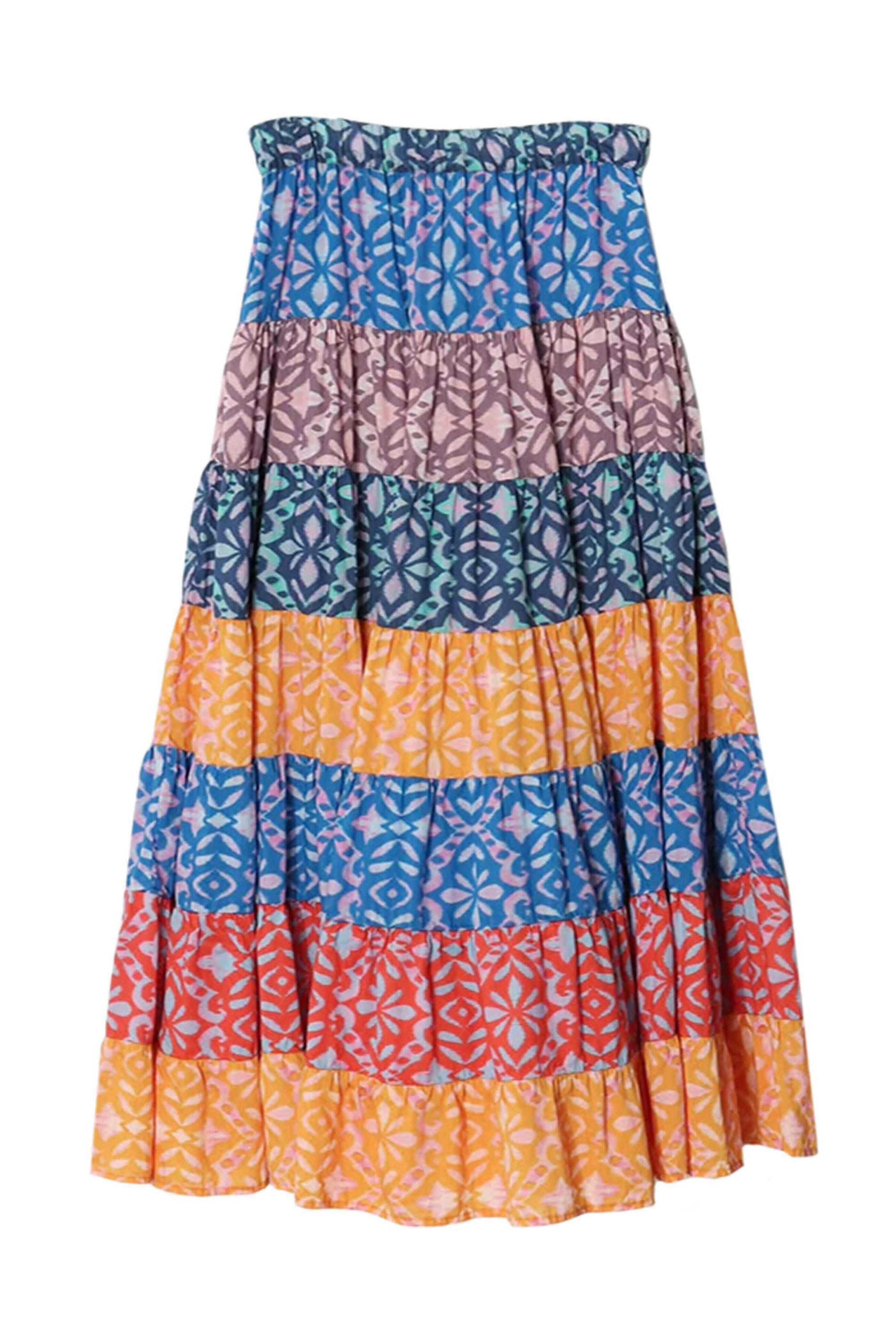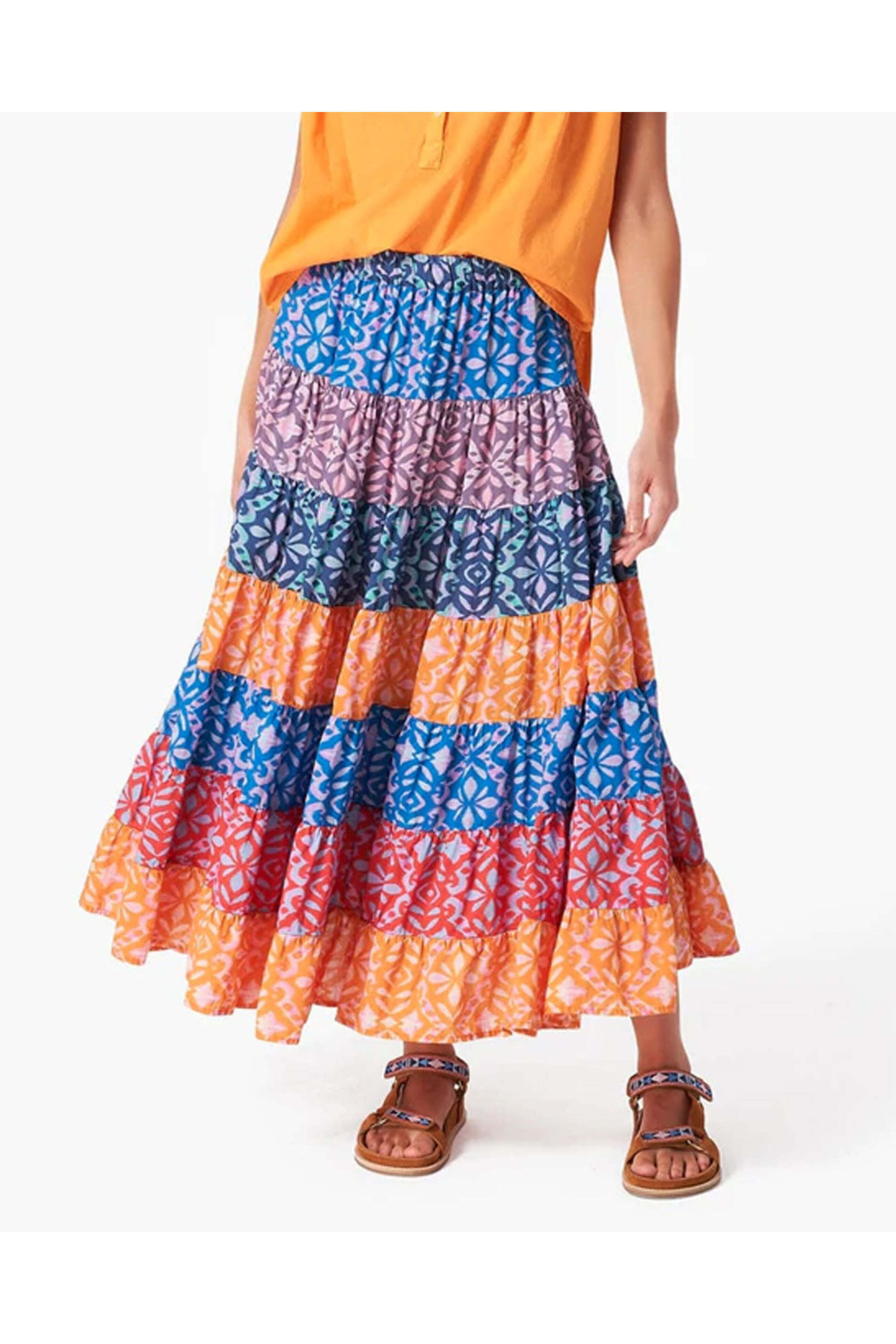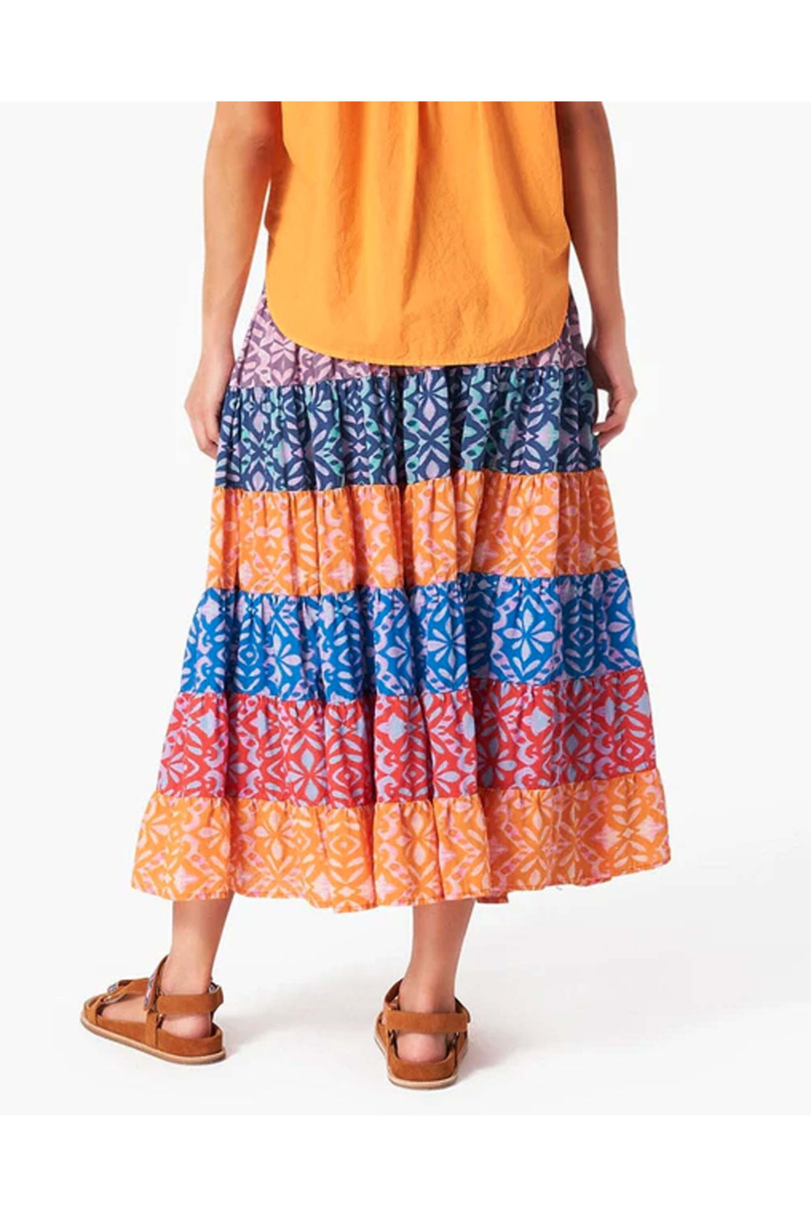 Xirena Fiesta Sera Skirt. Elastic waist. Side slip pockets. Tiered silhouette. Midi length. 75% cotton, 25% silk.
