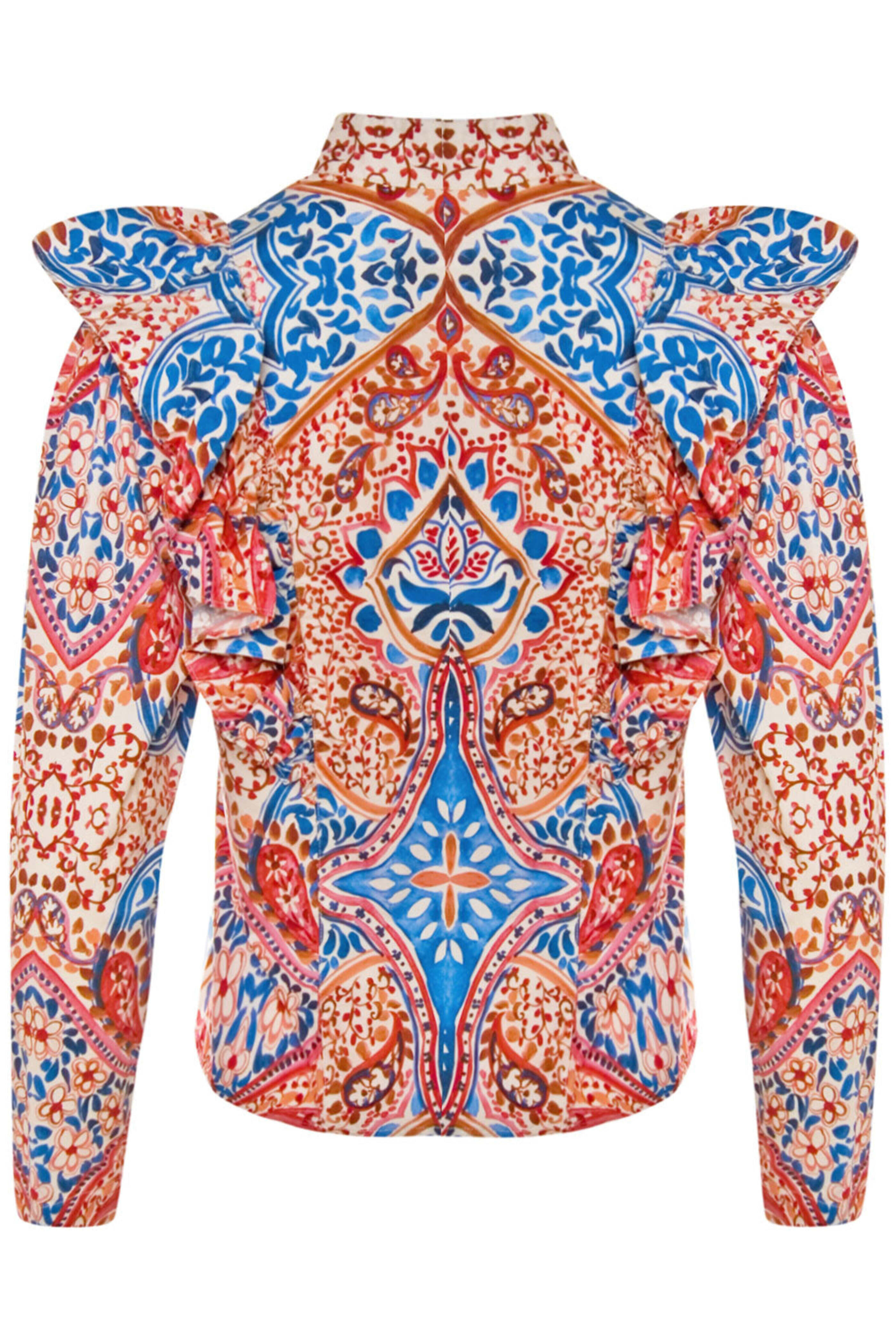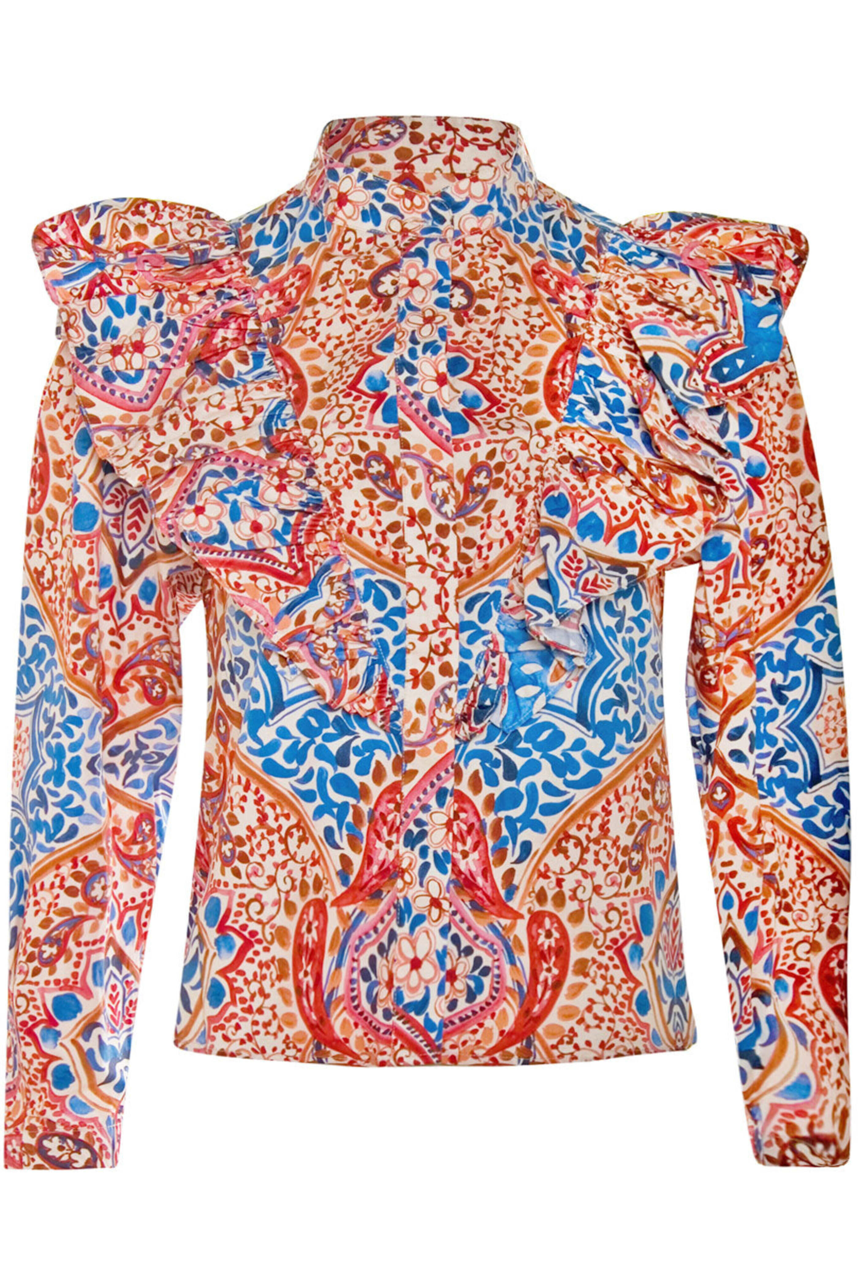 Xirena Terra Mosaic Callie Top. Banded collar. Ruffle shoulder detail. ¾ length sleeves; button cuffs. Concealed button down front closure. Relaxed fit. Straight hem. 100% cotton.