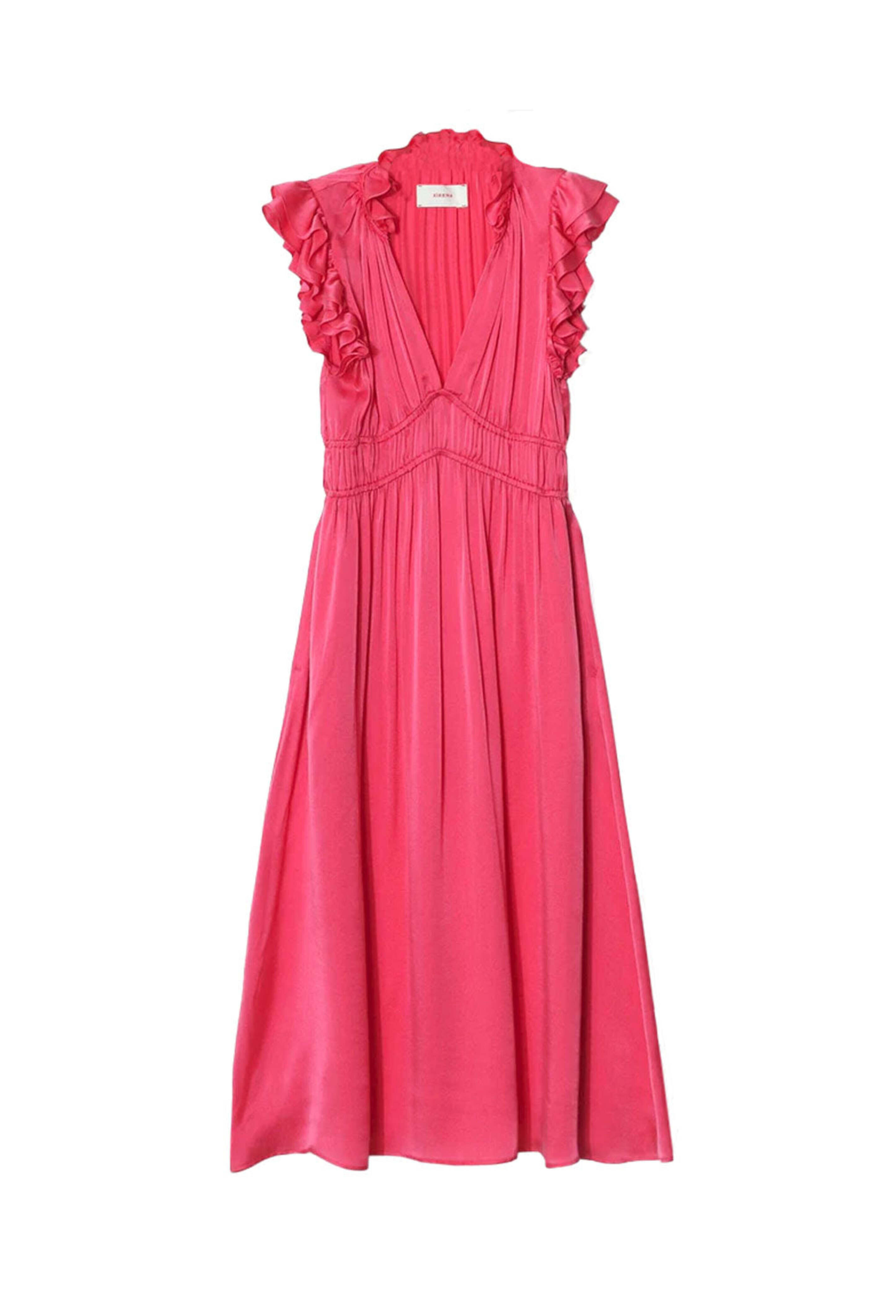 Xirena Pink Ruby Posey Dress. Deep V Neck. Sleeveless; ruffle trim detail. Gathered waist. Side seam pockets. Midi length. Shirring detail throughout. Relaxed fit. 100% Silk.