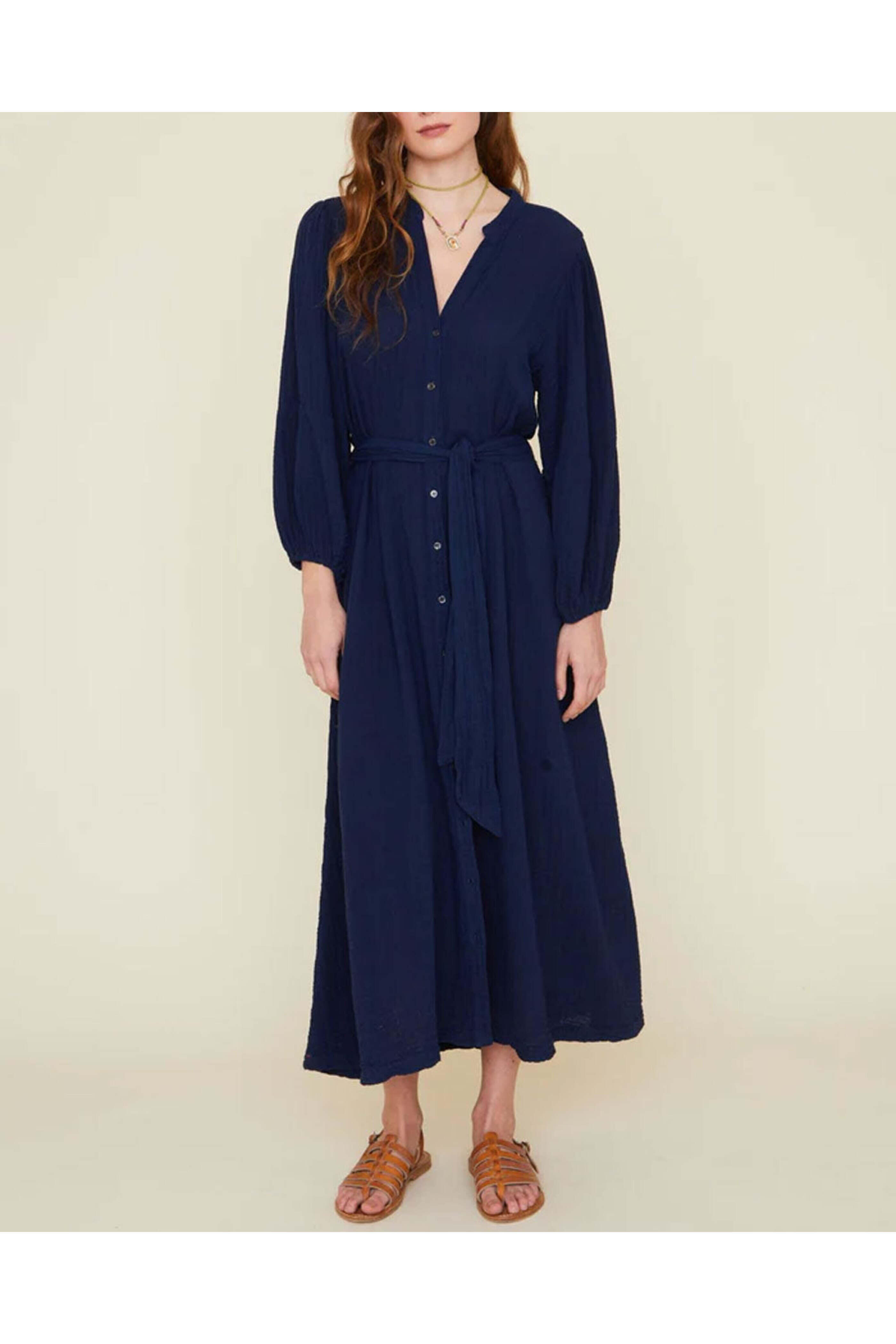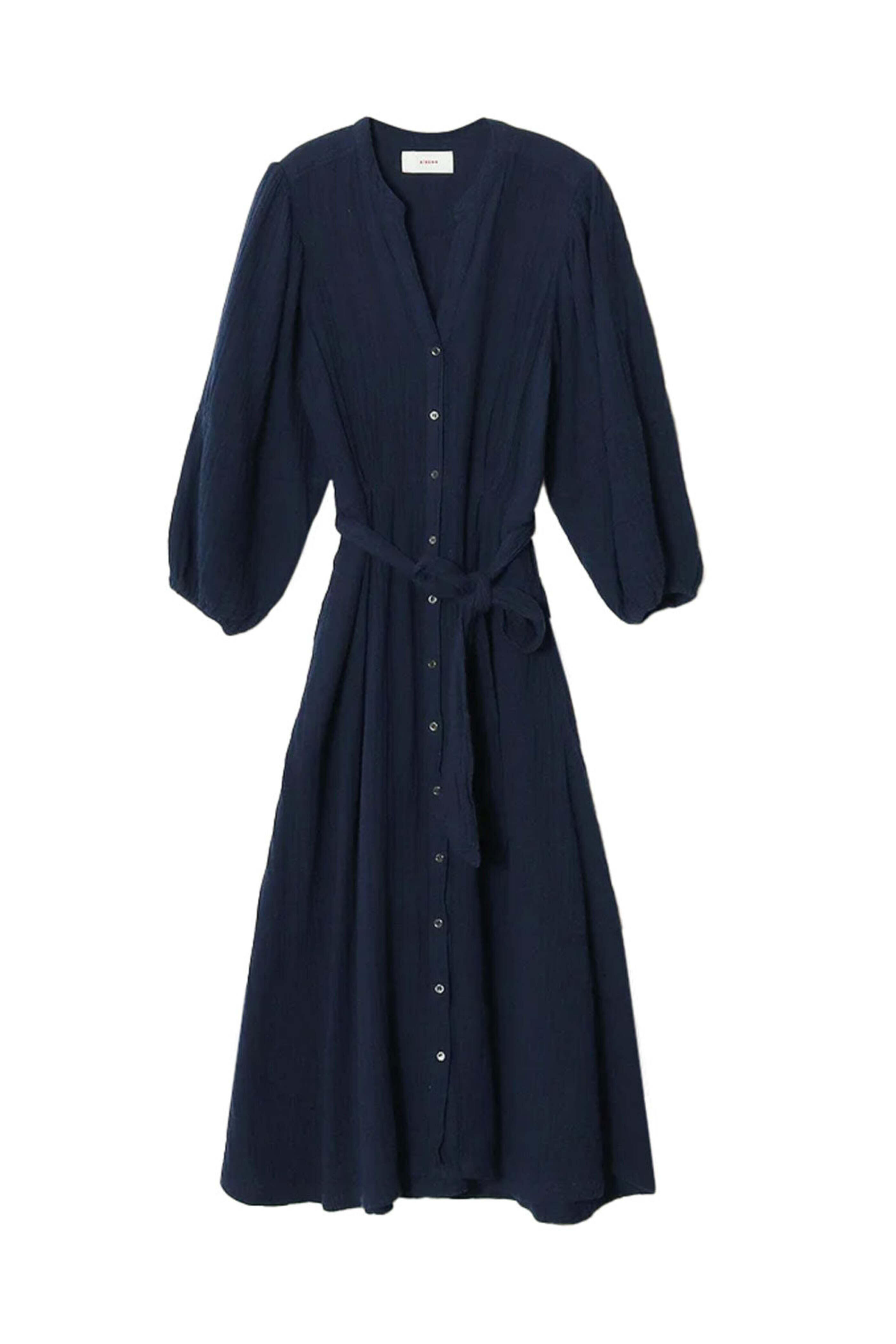 Xirena Midnight Selene Dress. Split v neck. Bracelet length sleeves; elastic cuffs. Button down front closure. Removable self-tie belt at waist; self-fabrication. Side slip pockets. Relaxed fit. Midi length. Chelsea gauze fabrication. Made in LA.