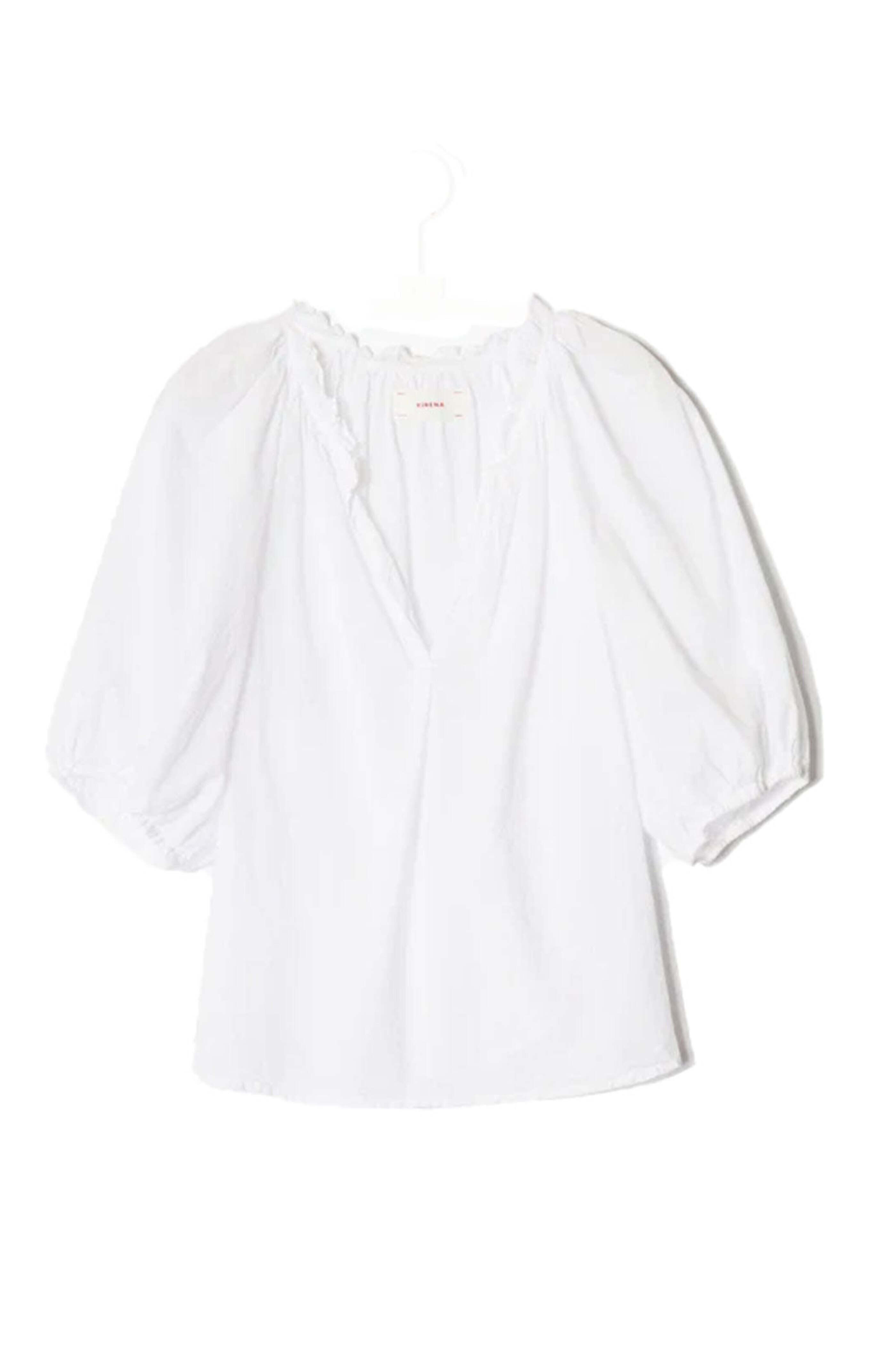 Xirena White Jules Top. V neck. Ruffled neckline. Bubble sleeves; elastic cuff. High-low hem. Relaxed fit. 100% cotton.