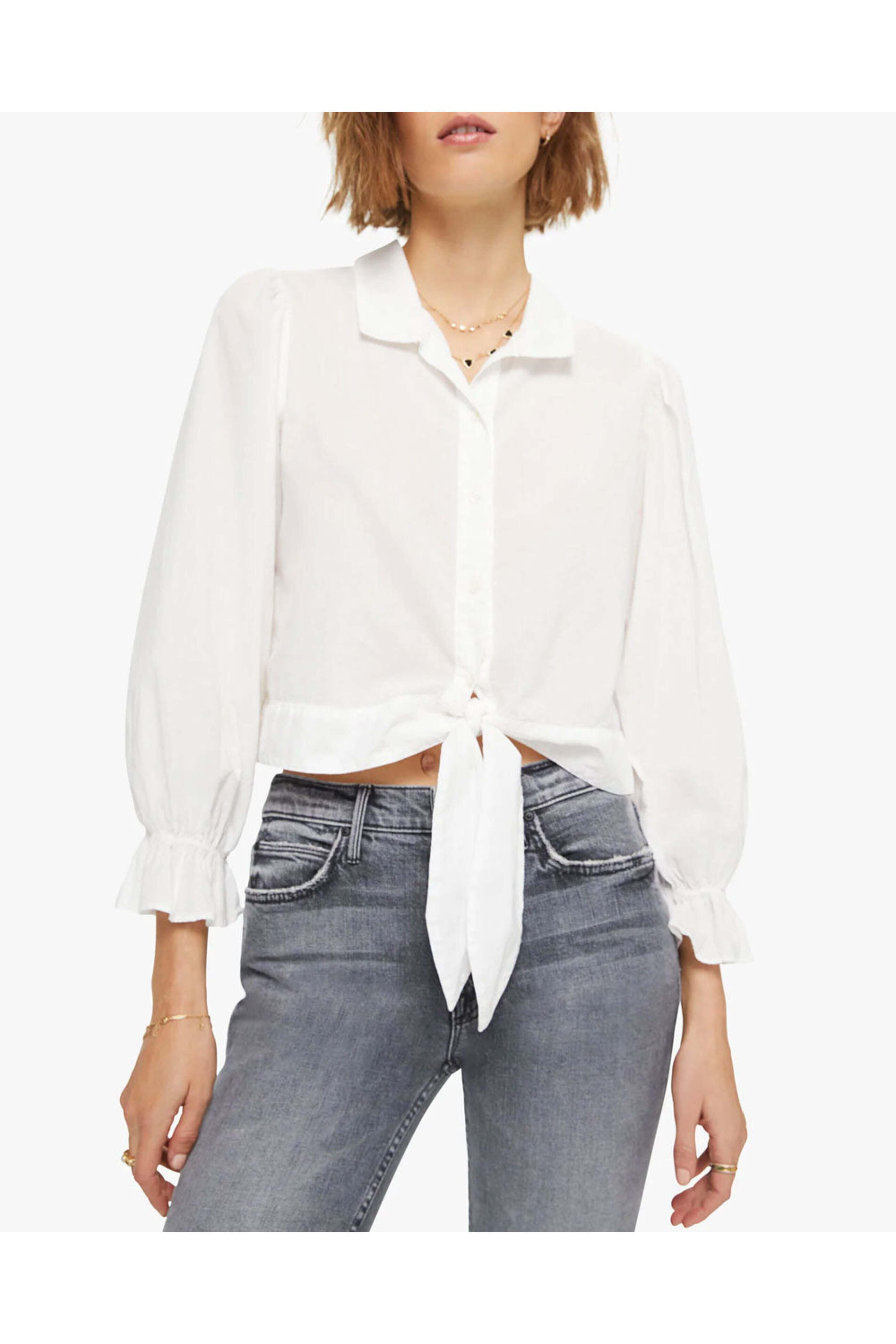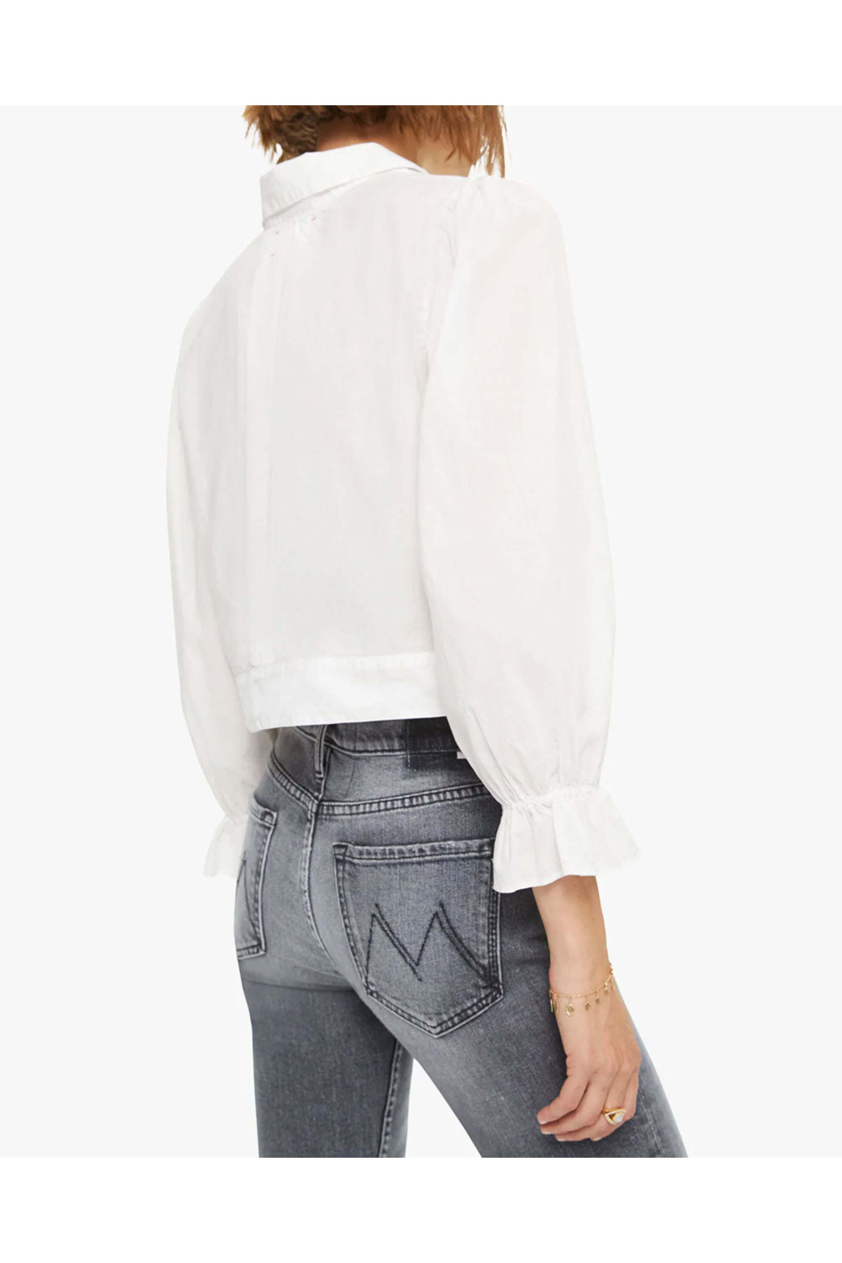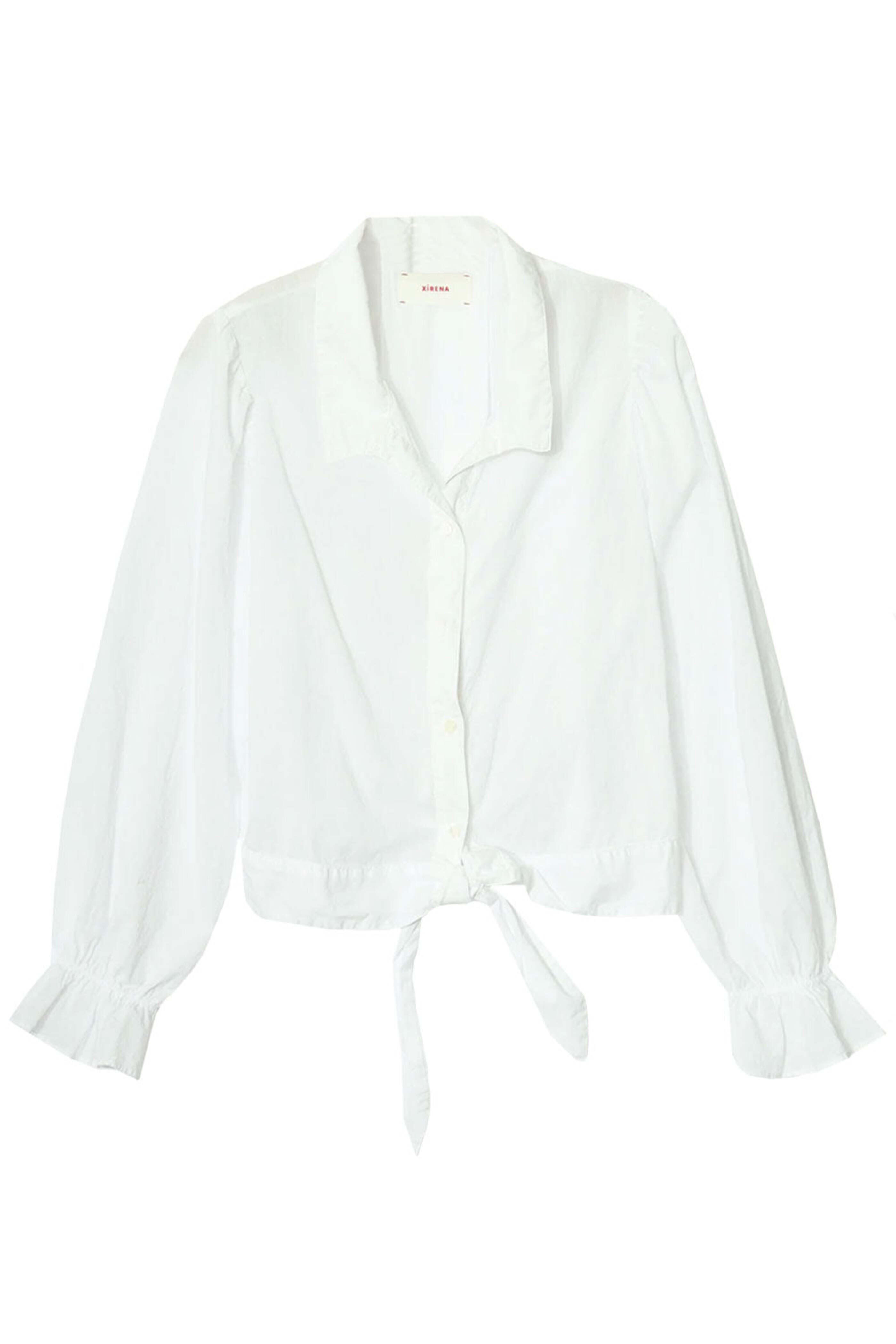 Xirena White Elsie Shirt. Collar. ¾ length sleeves; elastic ruffle cuffs. Button down front closure. Boxy fit. Self-tie at hem. Slightly cropped length. Cotton poplin fabrication. Made in LA. 100% cotton.