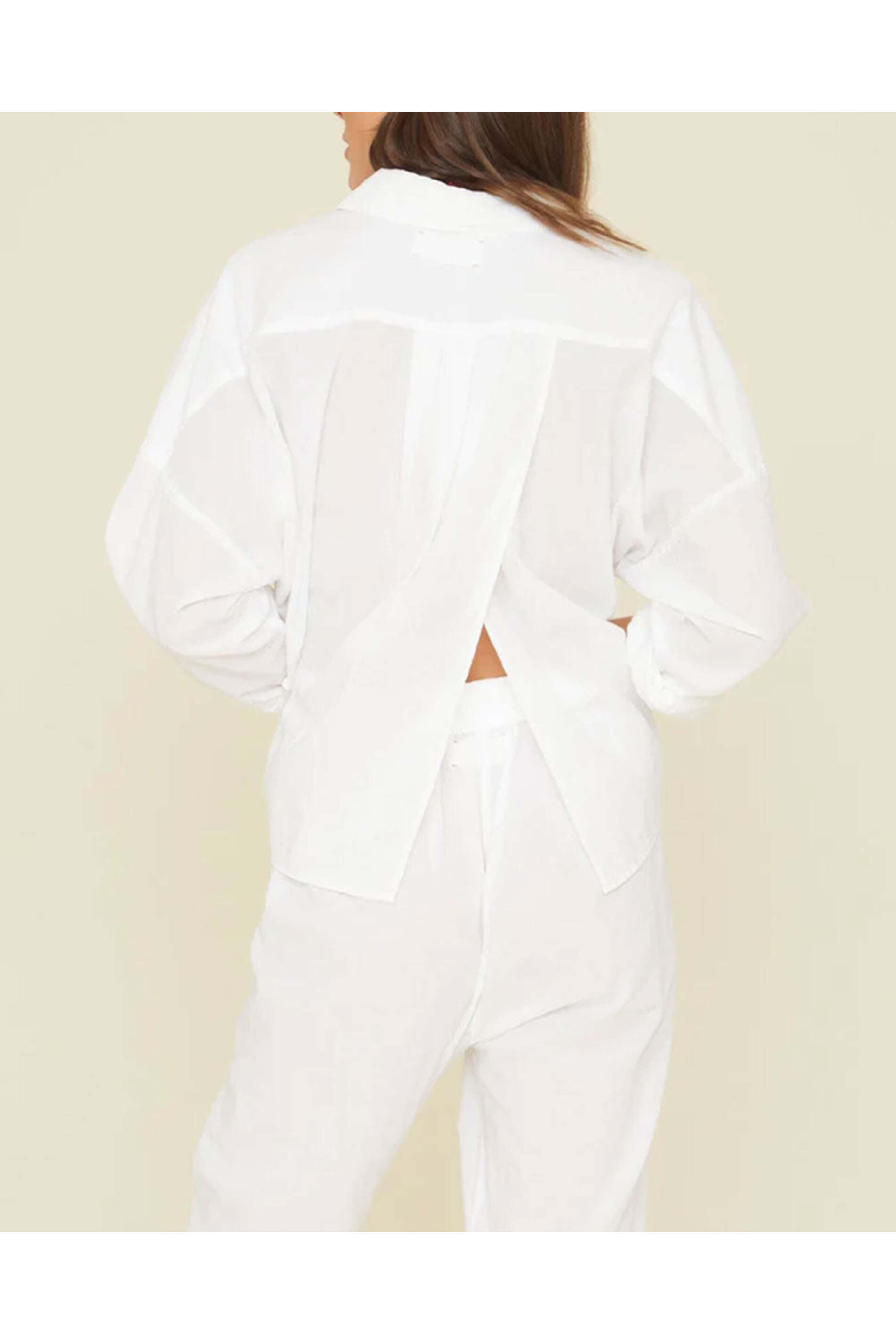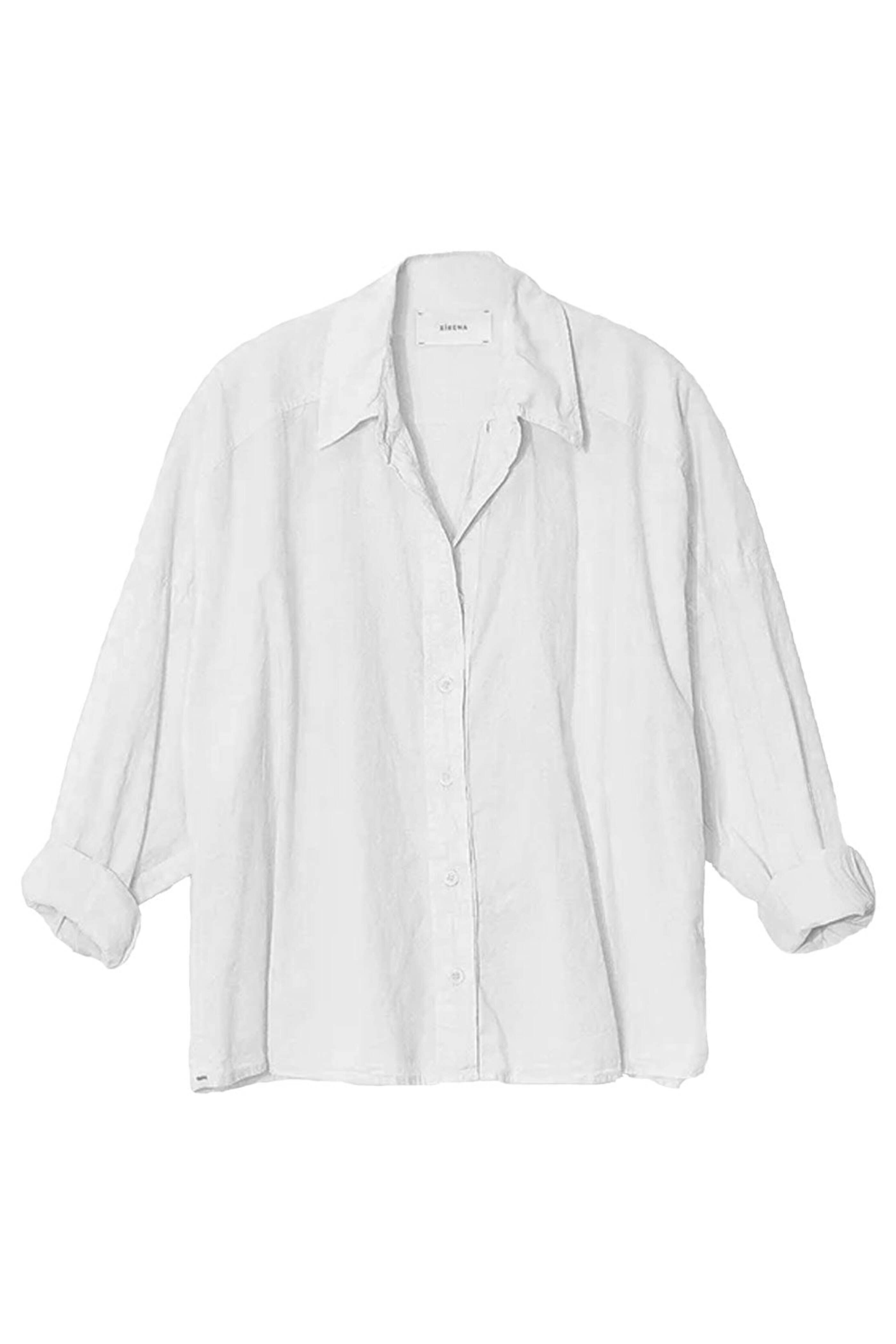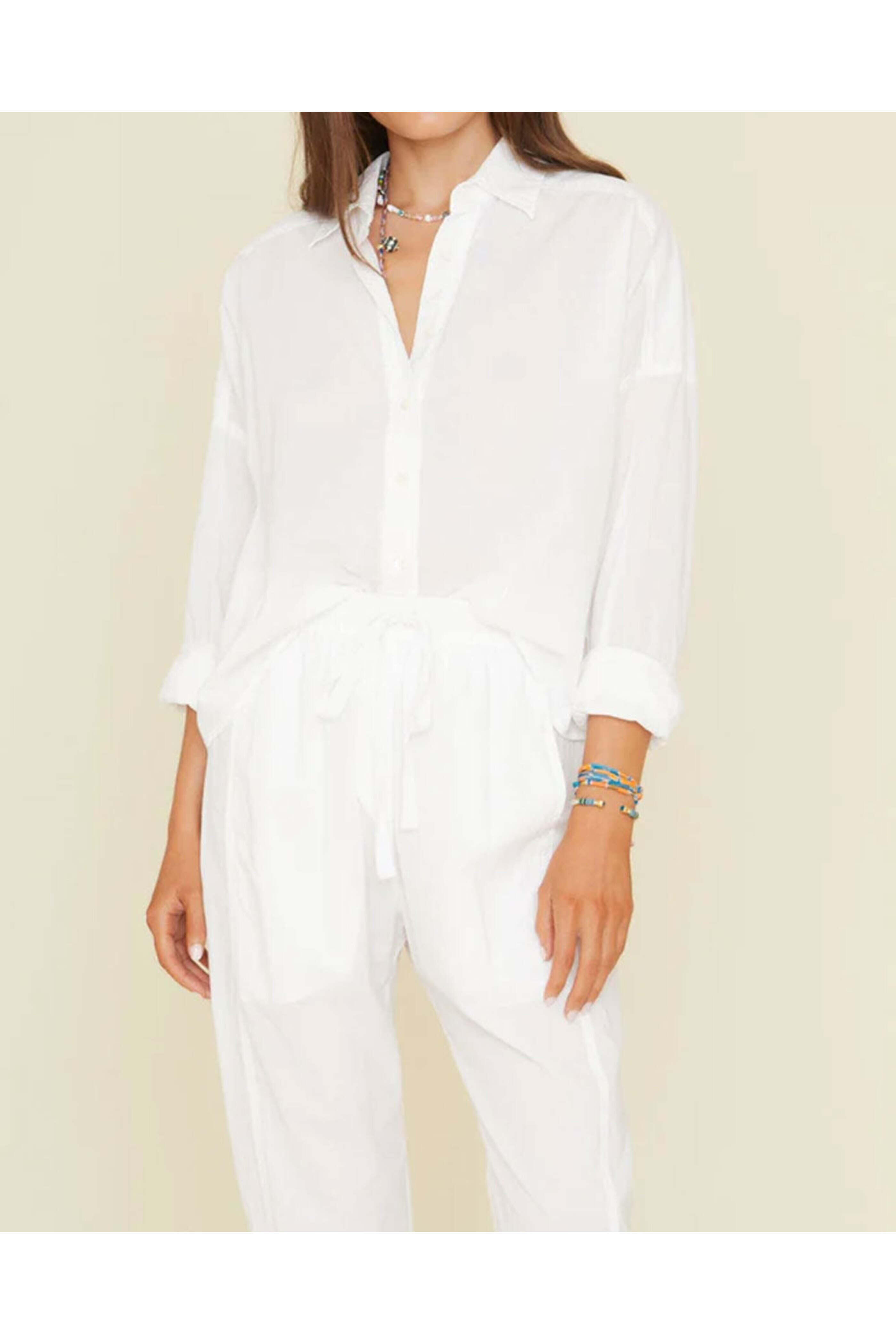 Xirena White Riley Shirt. Convertible collar. Front wide button closure. Roll up quarter length sleeves. Box pleat back yoke. Flyaway back. Relaxed fit. Unlined. 100% cotton.