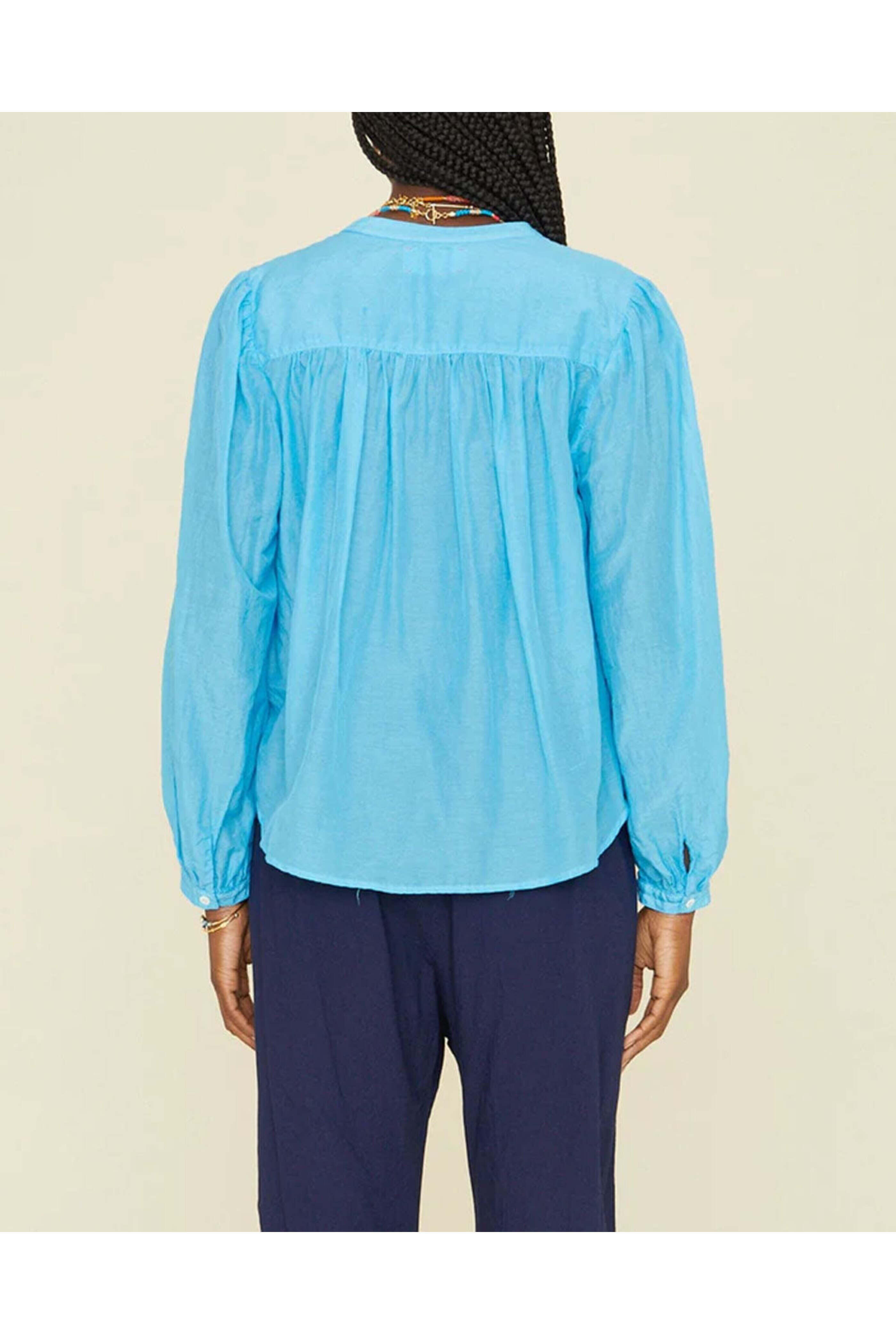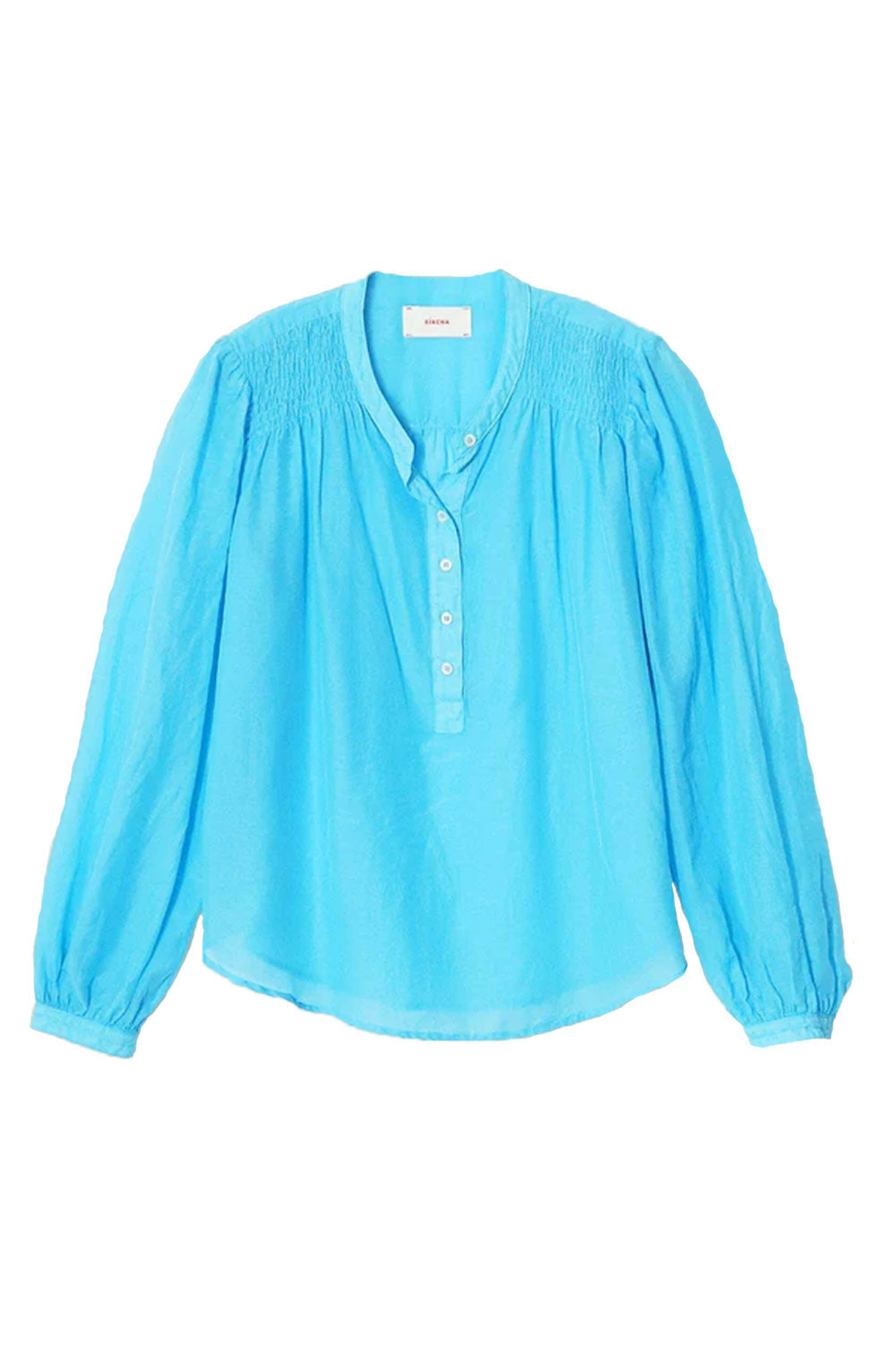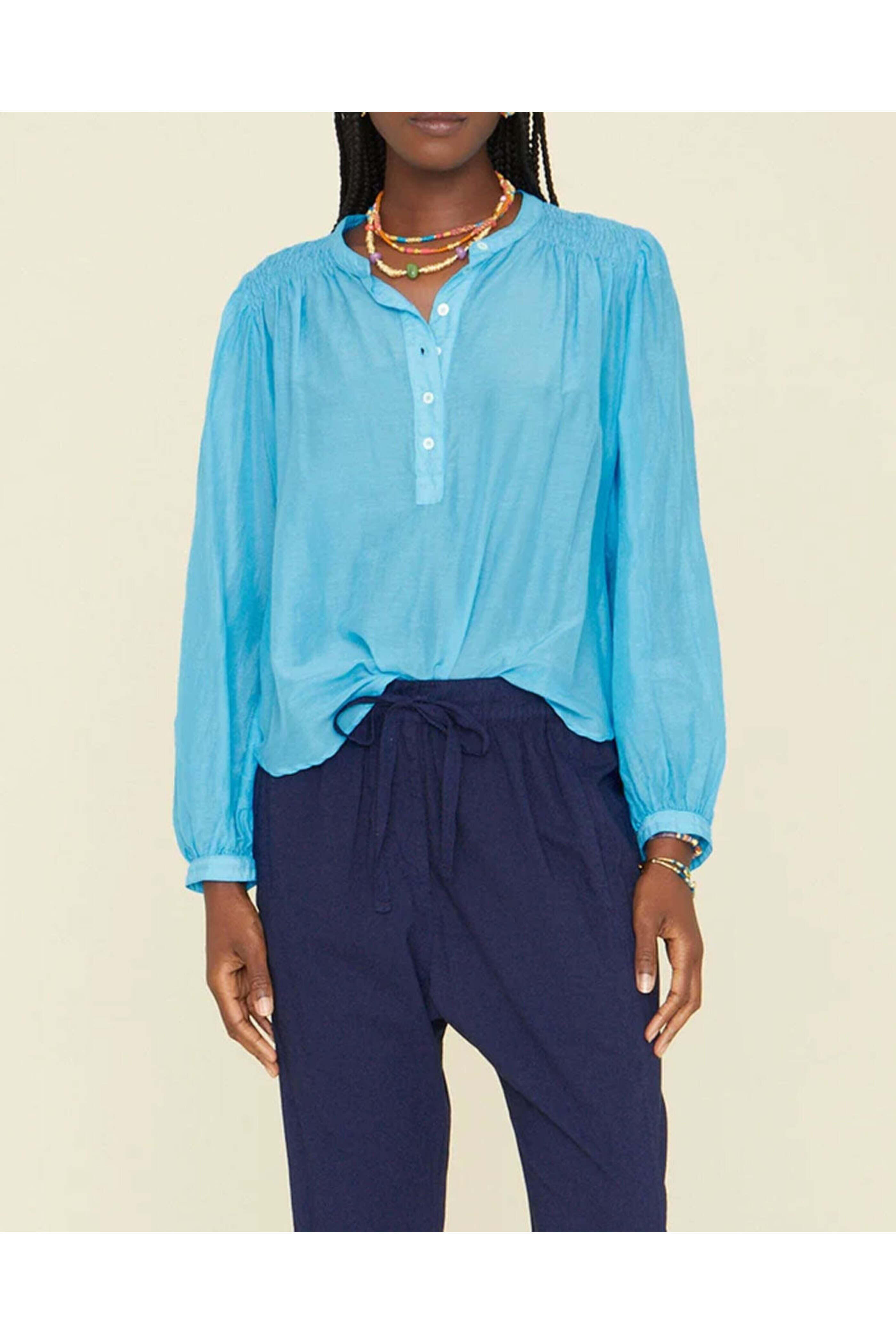 Xirena Aquaria Hattie Top. V neck. Front button henley closure. Top smocking detail. Blouson sleeves. Back yoke detail. Relaxed fit. Unlined. 70% cotton, 30% silk.