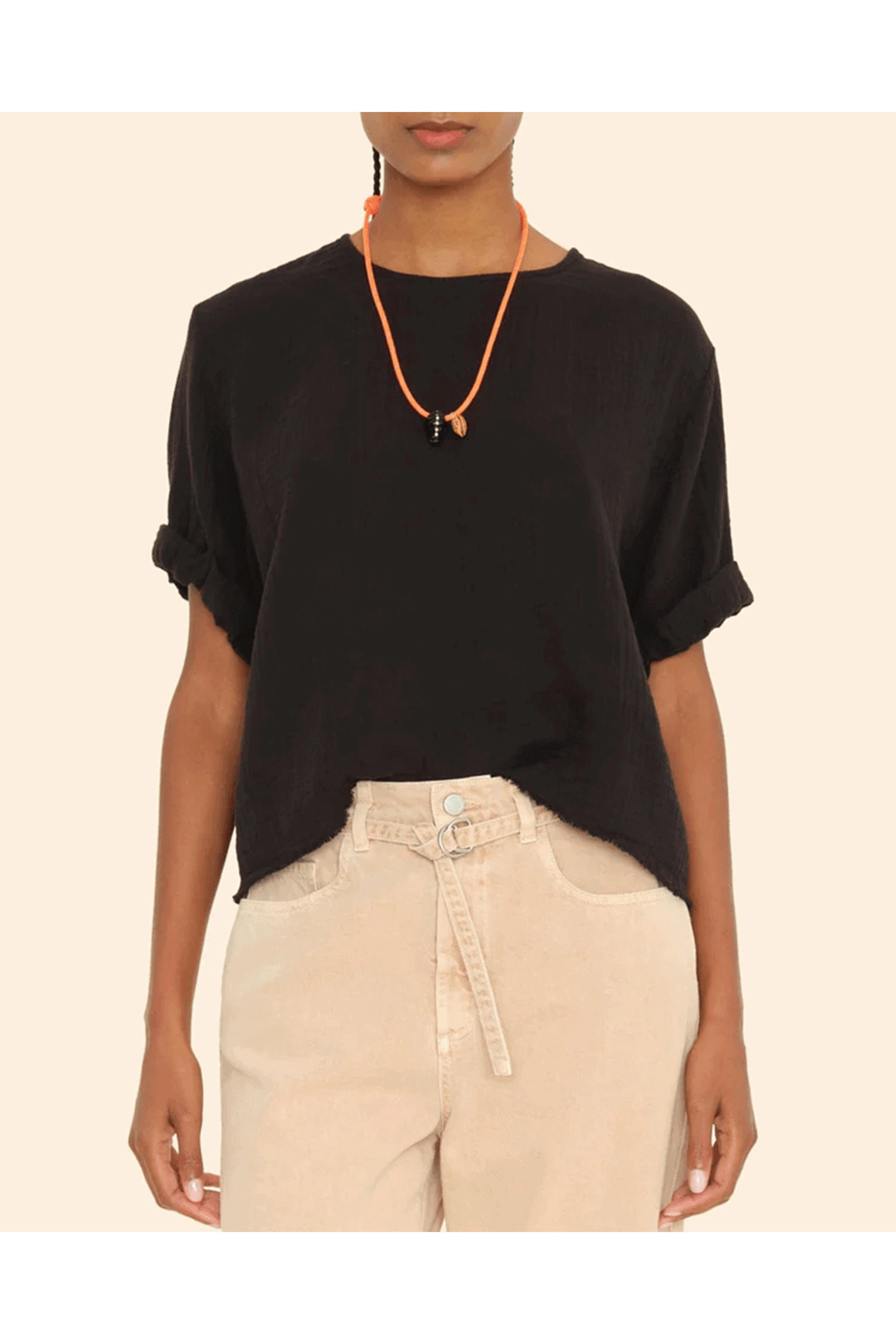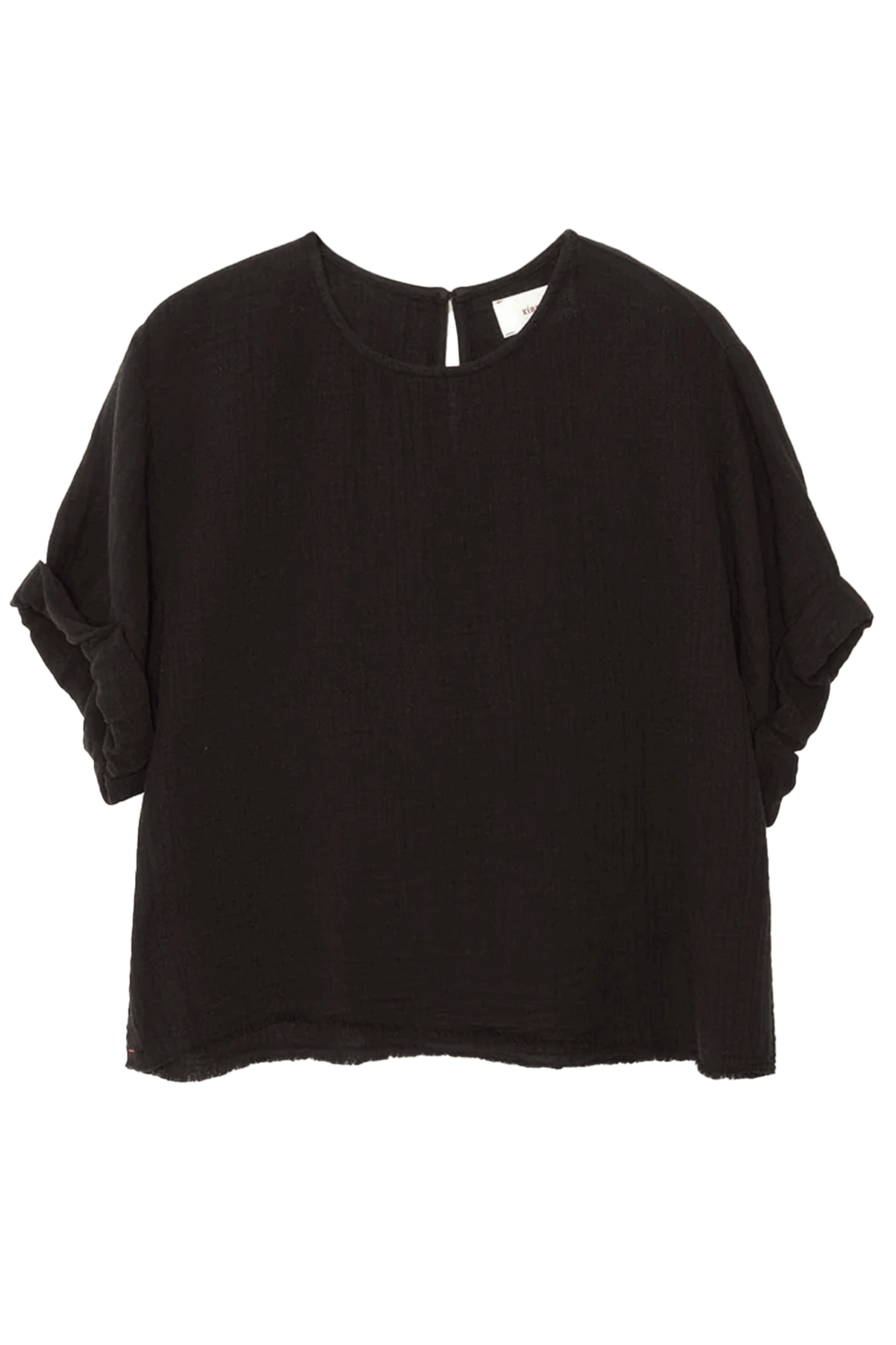 Xirena Black Carson Top . Scoop neck . Short sleeves . Stitched rolled sleeves . Keyhole button-back . Relaxed fit . Made in Los Angeles . 100% Cotton . Machine wash cold .