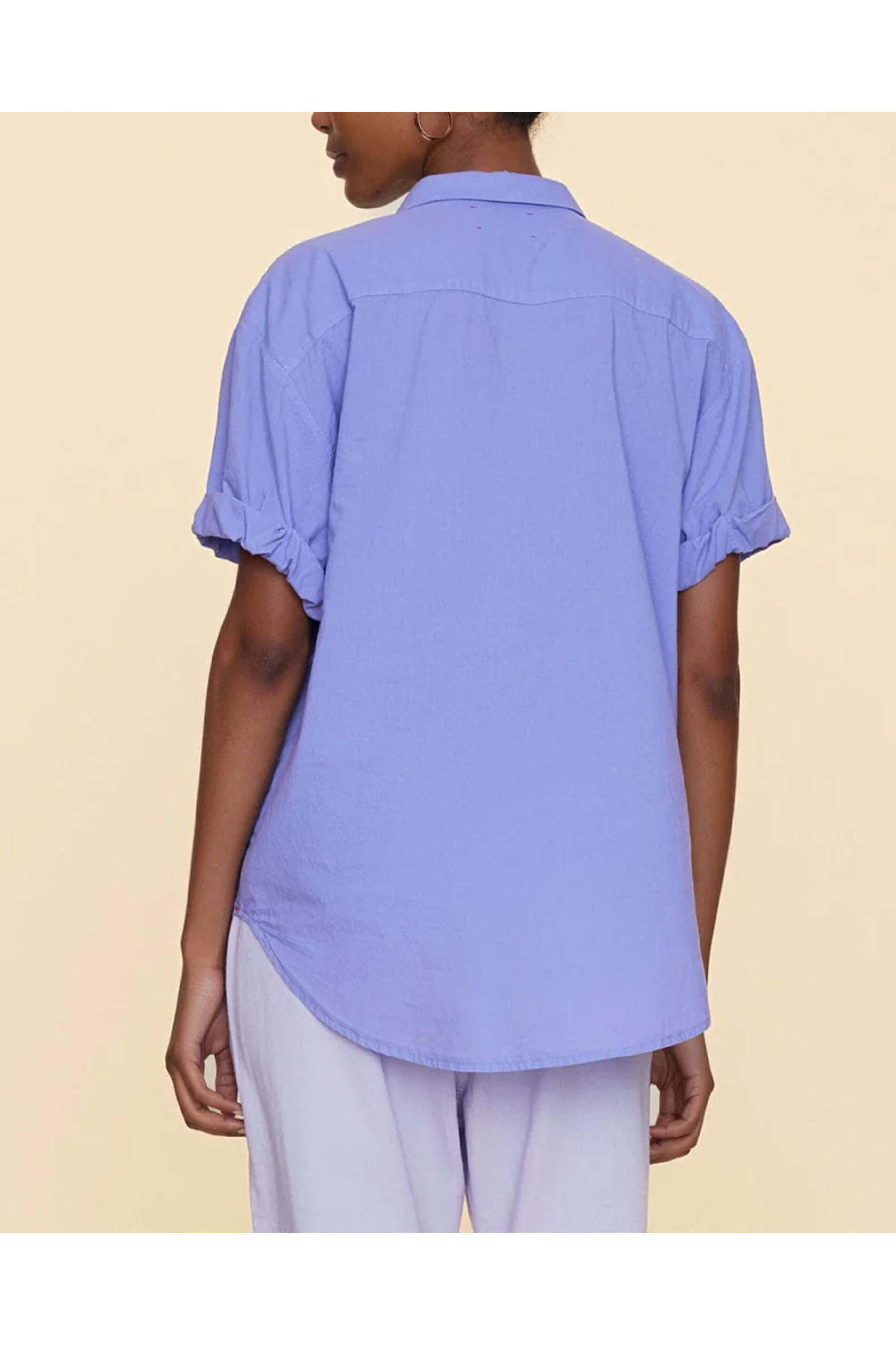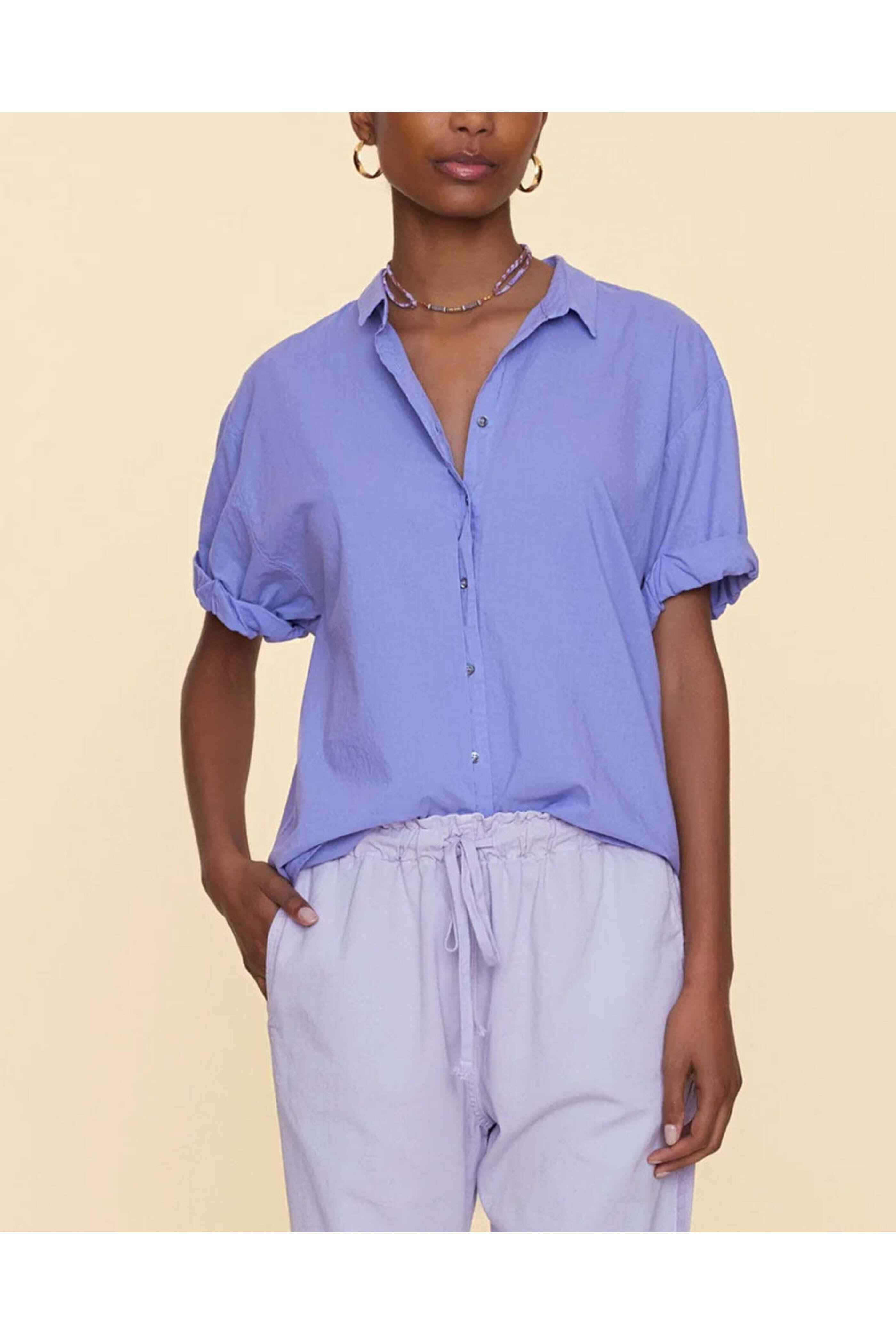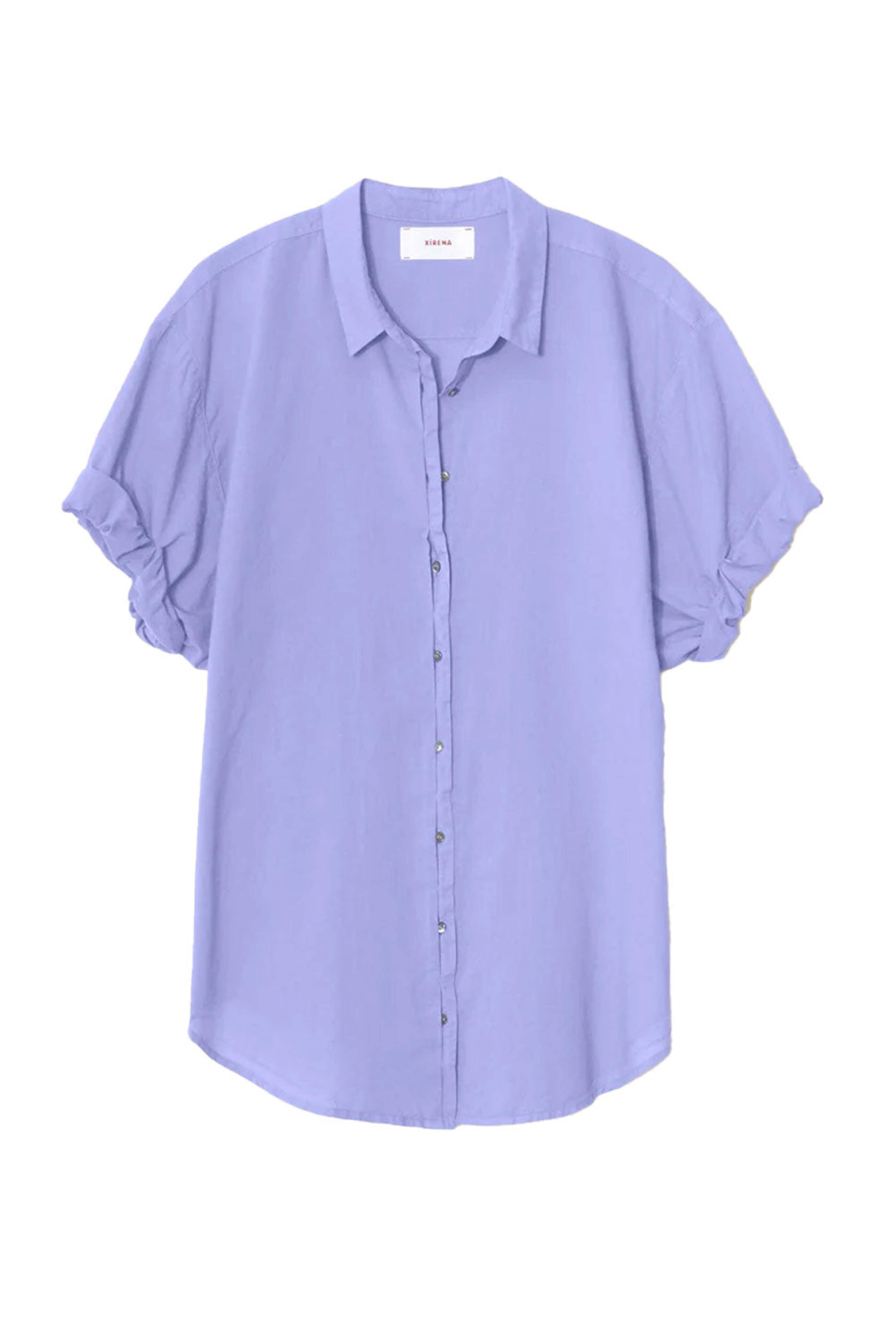 Xirena Dark Perri Channing Shirt . Collard . Short sleeves; rolled sleeves . Front button-down closure . Relaxed fit . Rounded hem. Made in LA . 100% cotton .