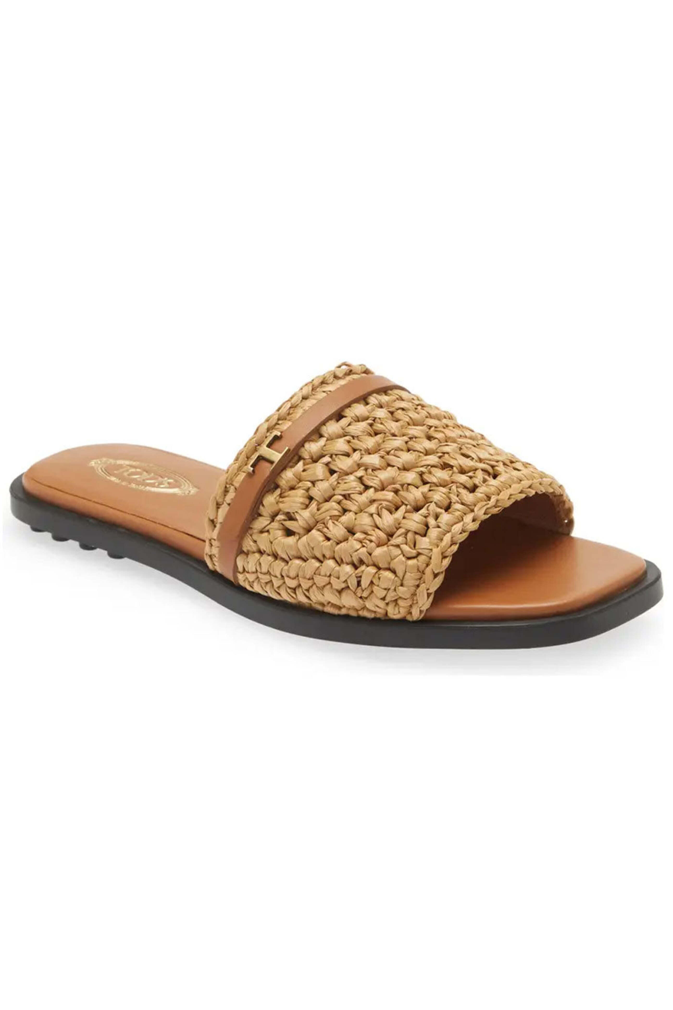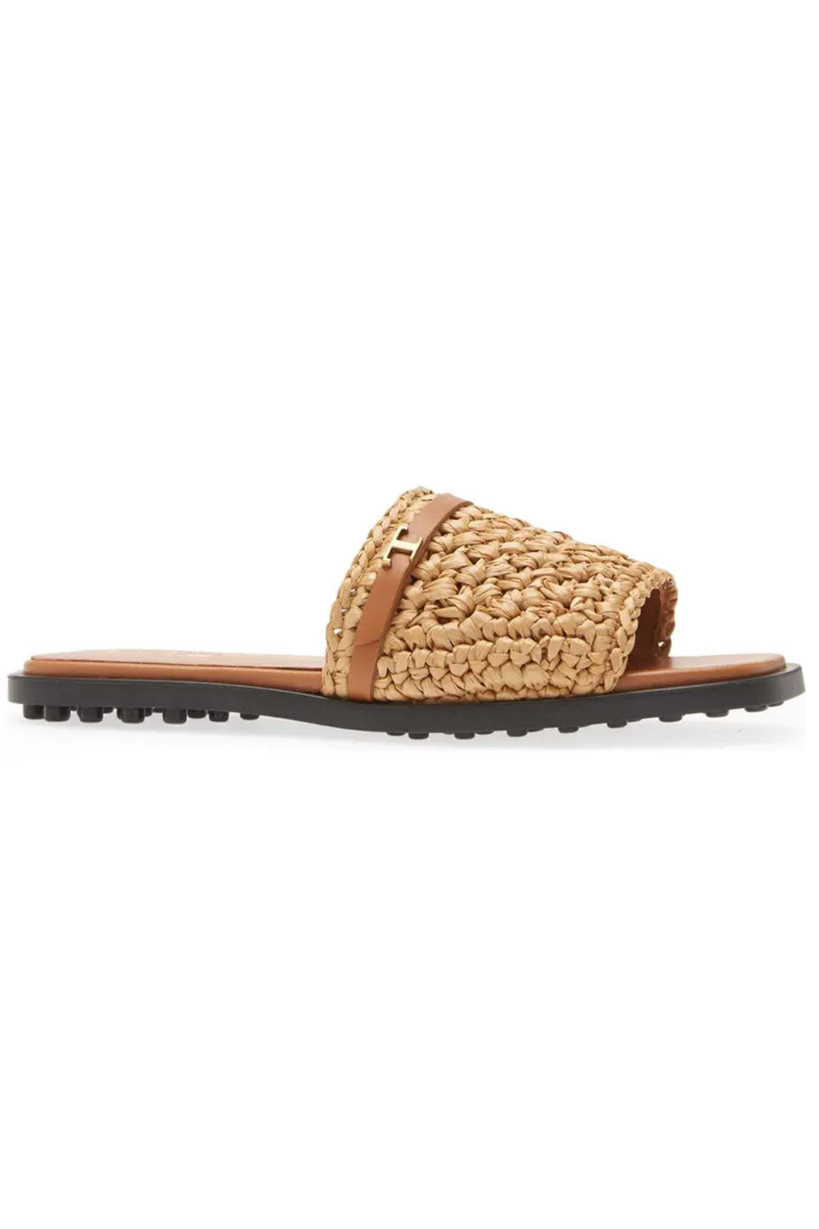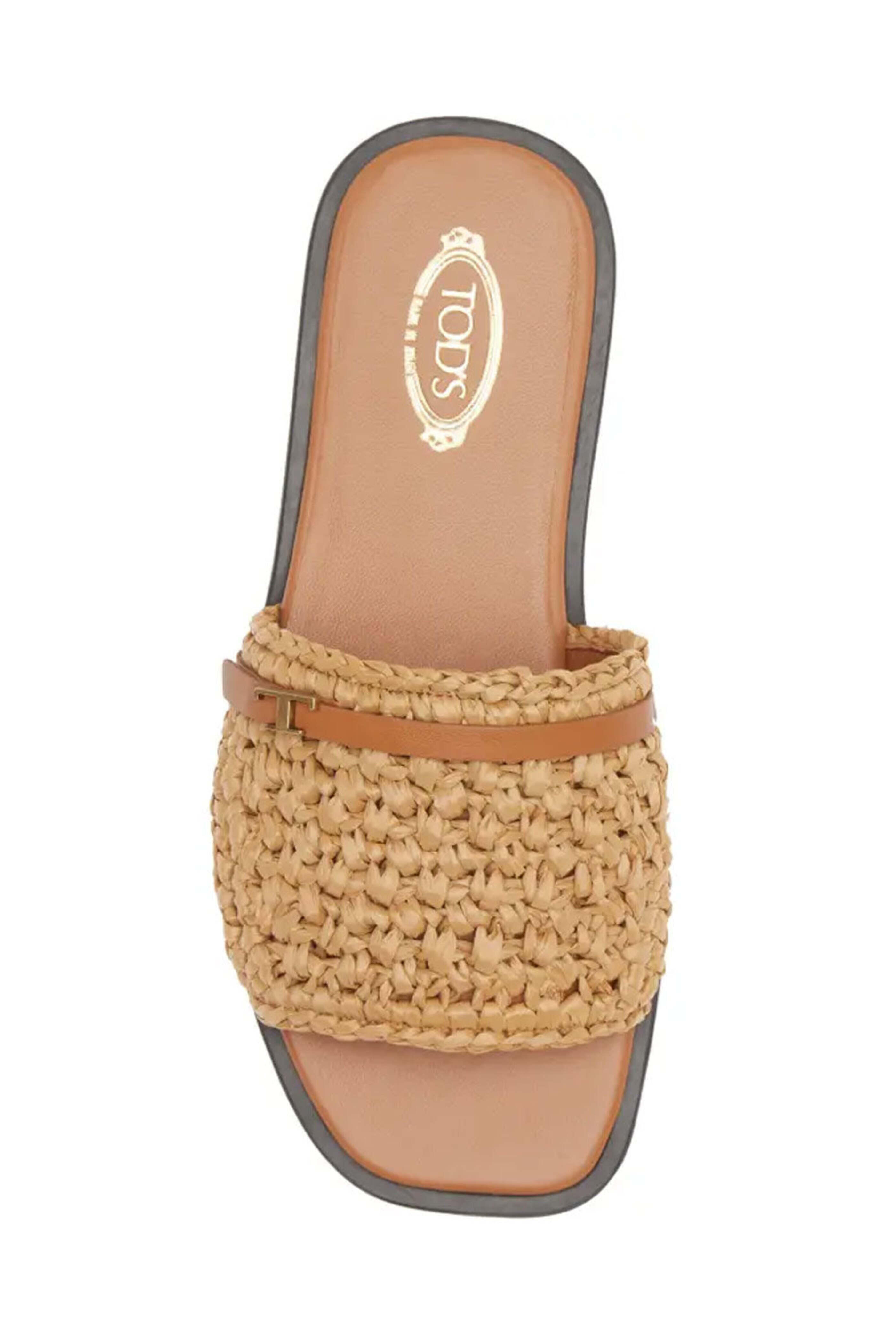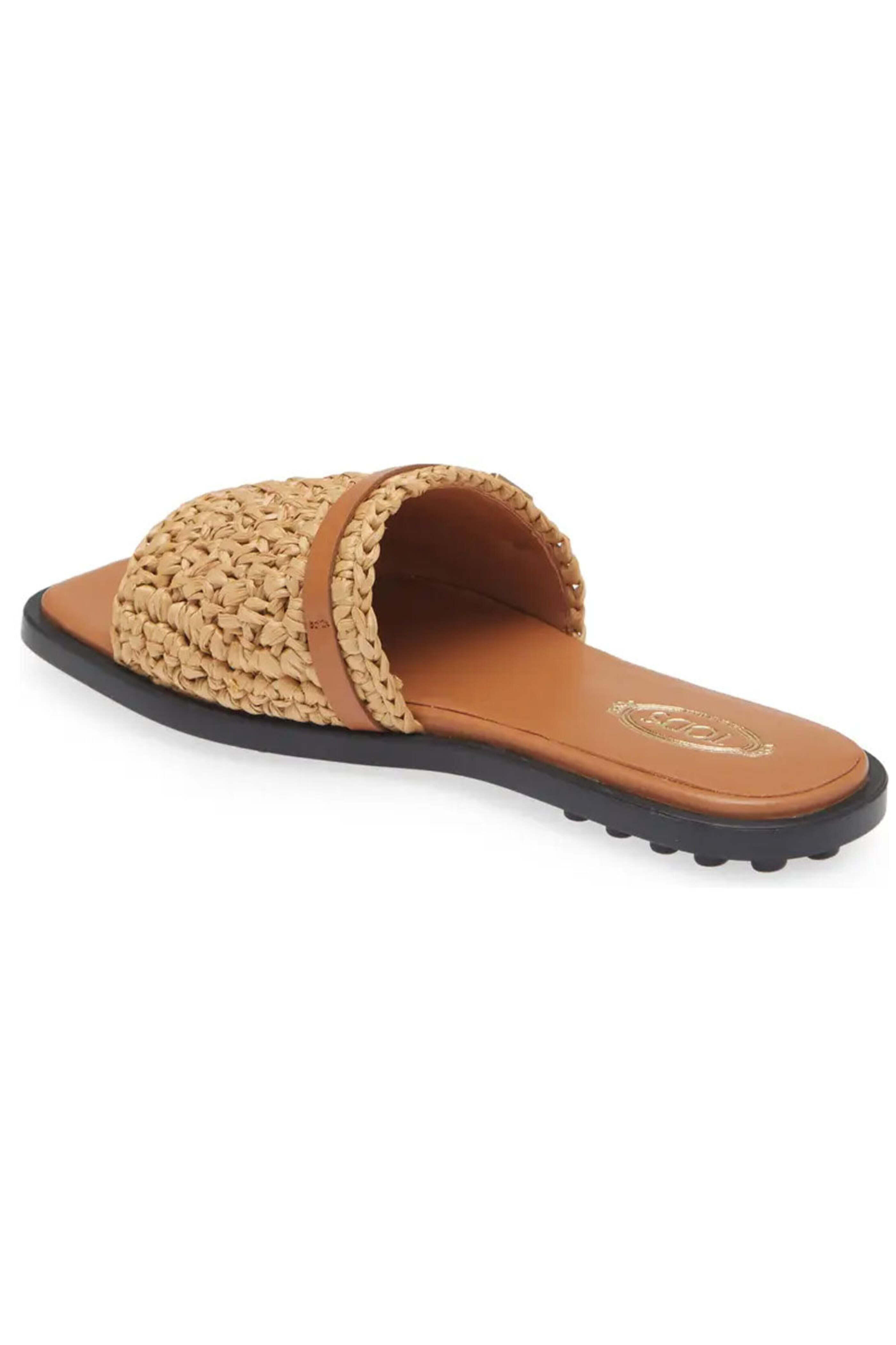 TODS Woven Slide Sandal in Natural. Open square toe. Woven raffia strap. Slip on. Gold tone logo embellishment. Textile and leather upper. Leather lining. Pebbled rubber sole. Made in Italy.