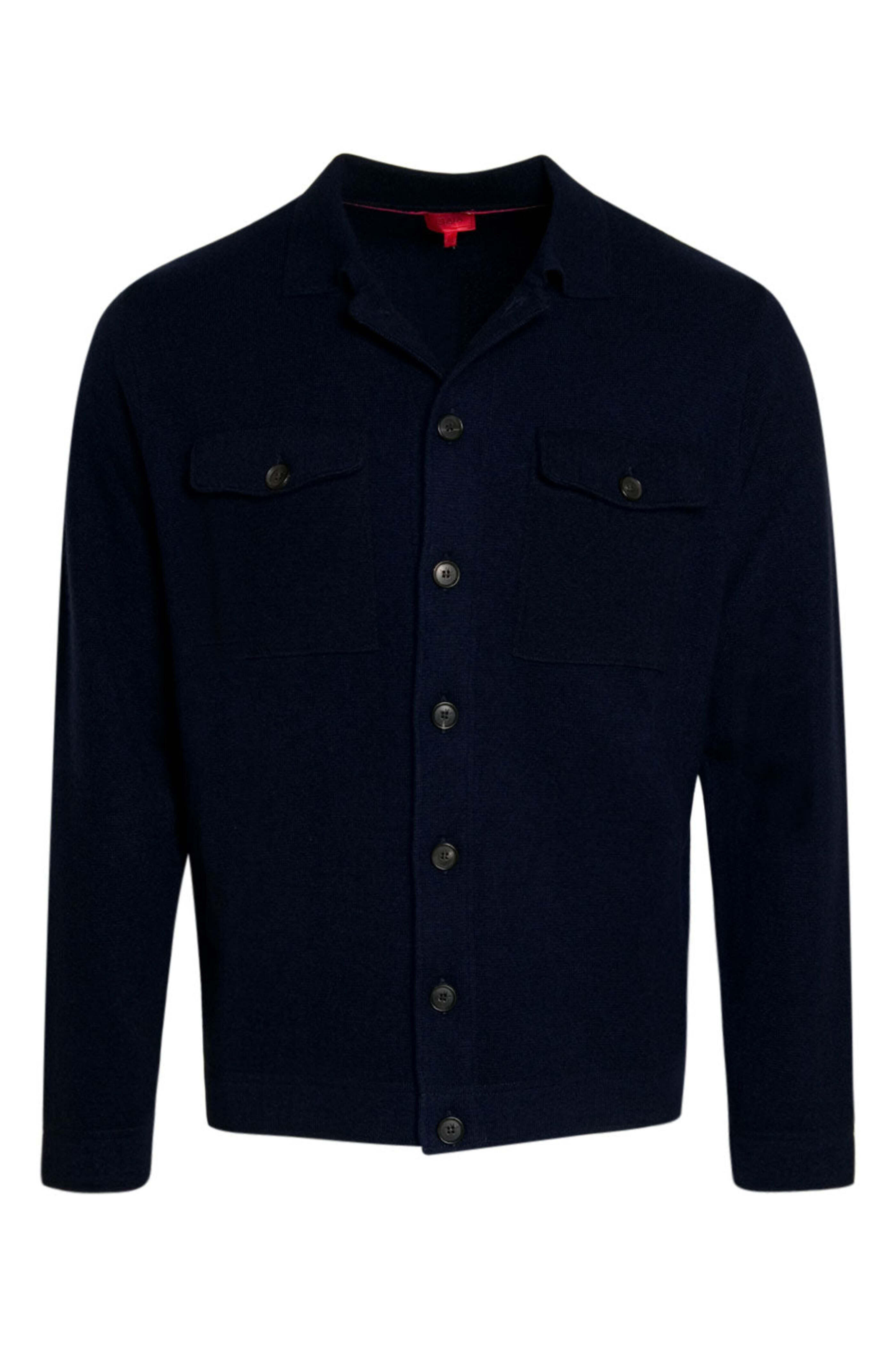 Isaia Blue Knit Aquacashmere Overshirt . Spread collar. Seven-button closure. Two flap chest pockets with button closure. Long sleeves. Straight hem. Made in Italy . 60% cashmere 40% silk.