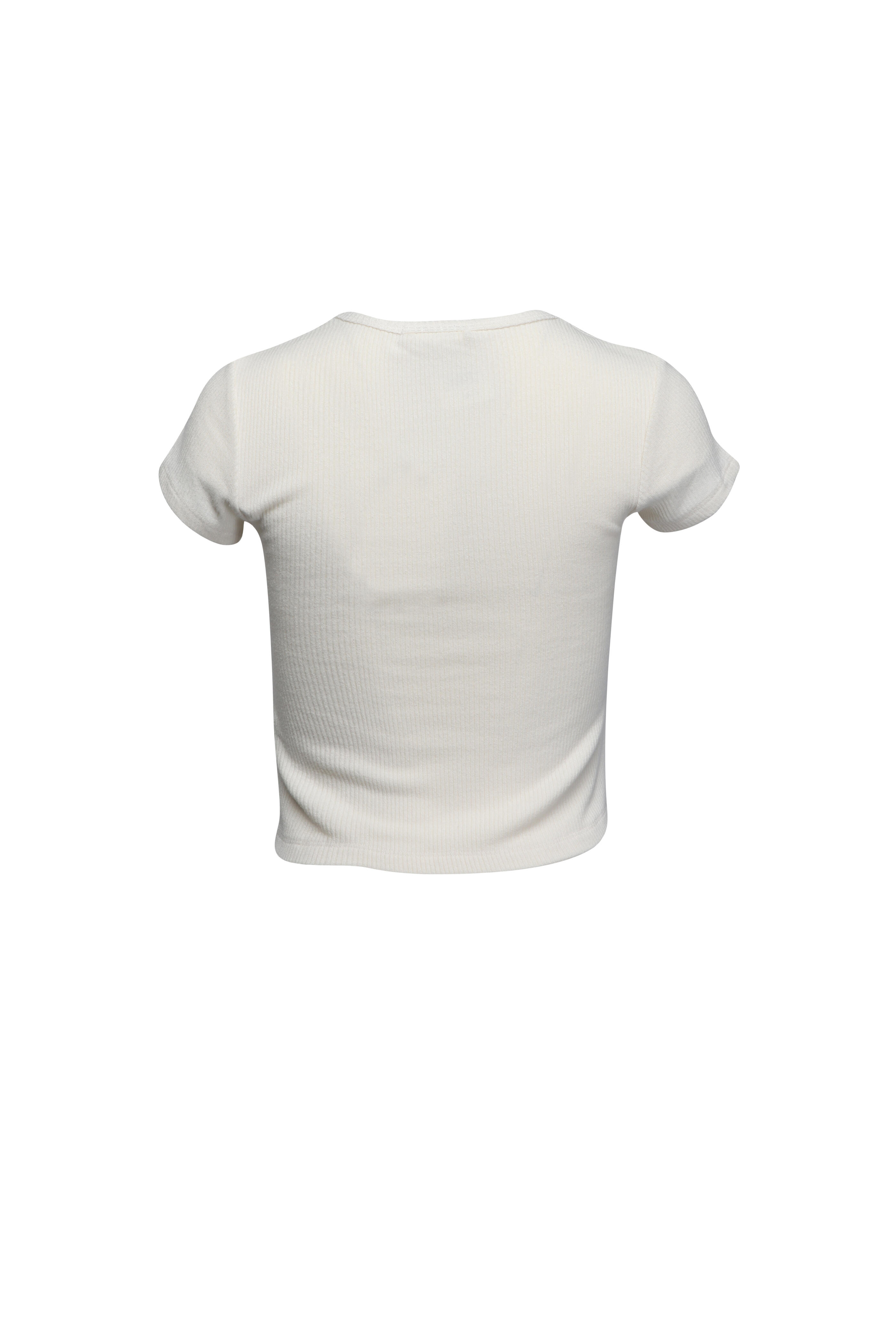Crewneck. Short sleeves. Straight hem. Cropped length. Ribbed throughout. Made in LA. Bust 28” (Size S). Sleeve 5.3” (Size S). Length 19.1” (Size S). 94% modal, 6% spandex. Dry clean.