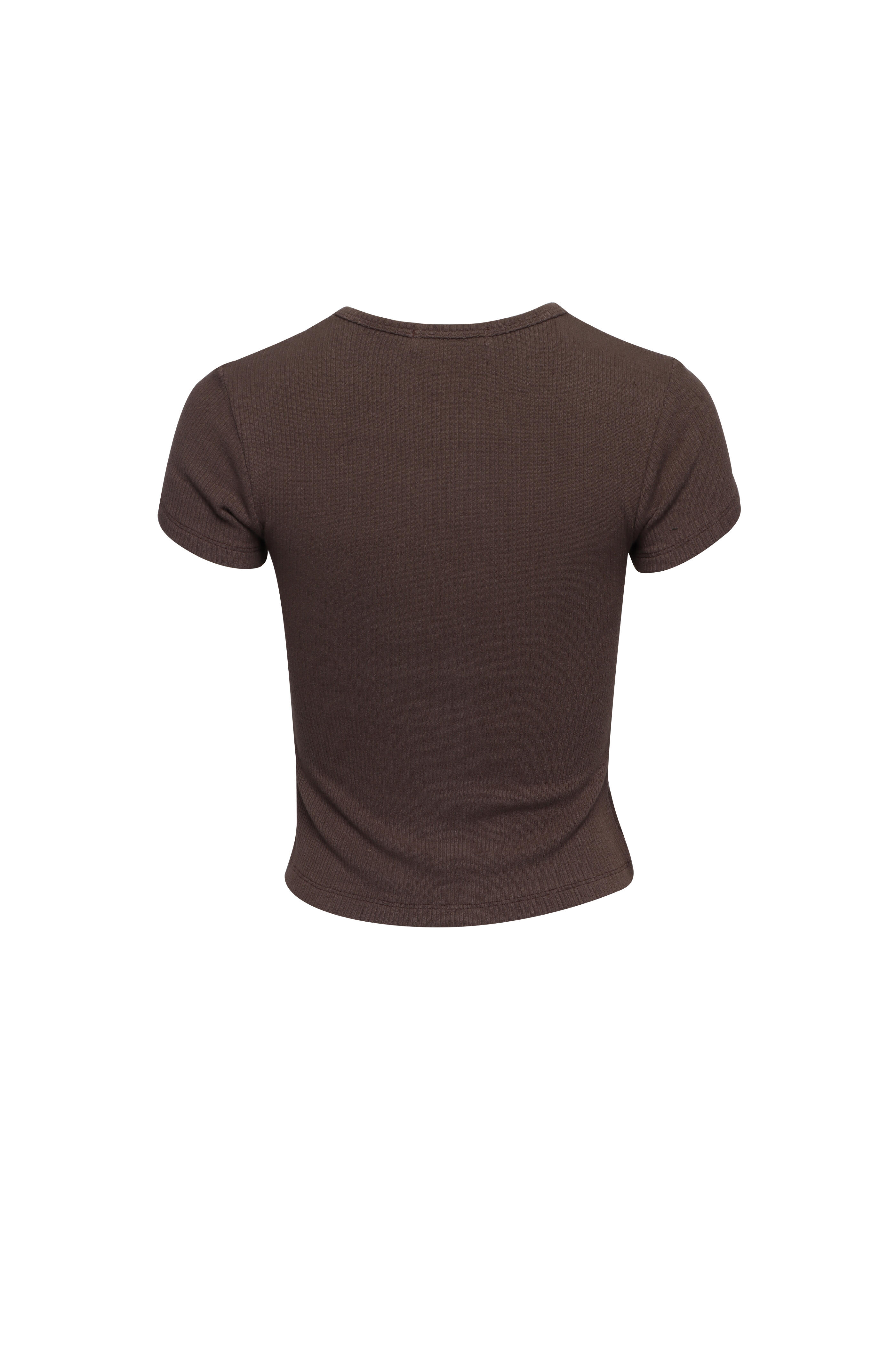 Round neck. Short sleeves. Slim silhouette. Ribbed throughout. Made in LA. Bust 28” (Size S). Sleeve 5.3” (Size S). Length 19.1” (Size S). Cropped length. 94% modal, 6% spandex. Machine washable.