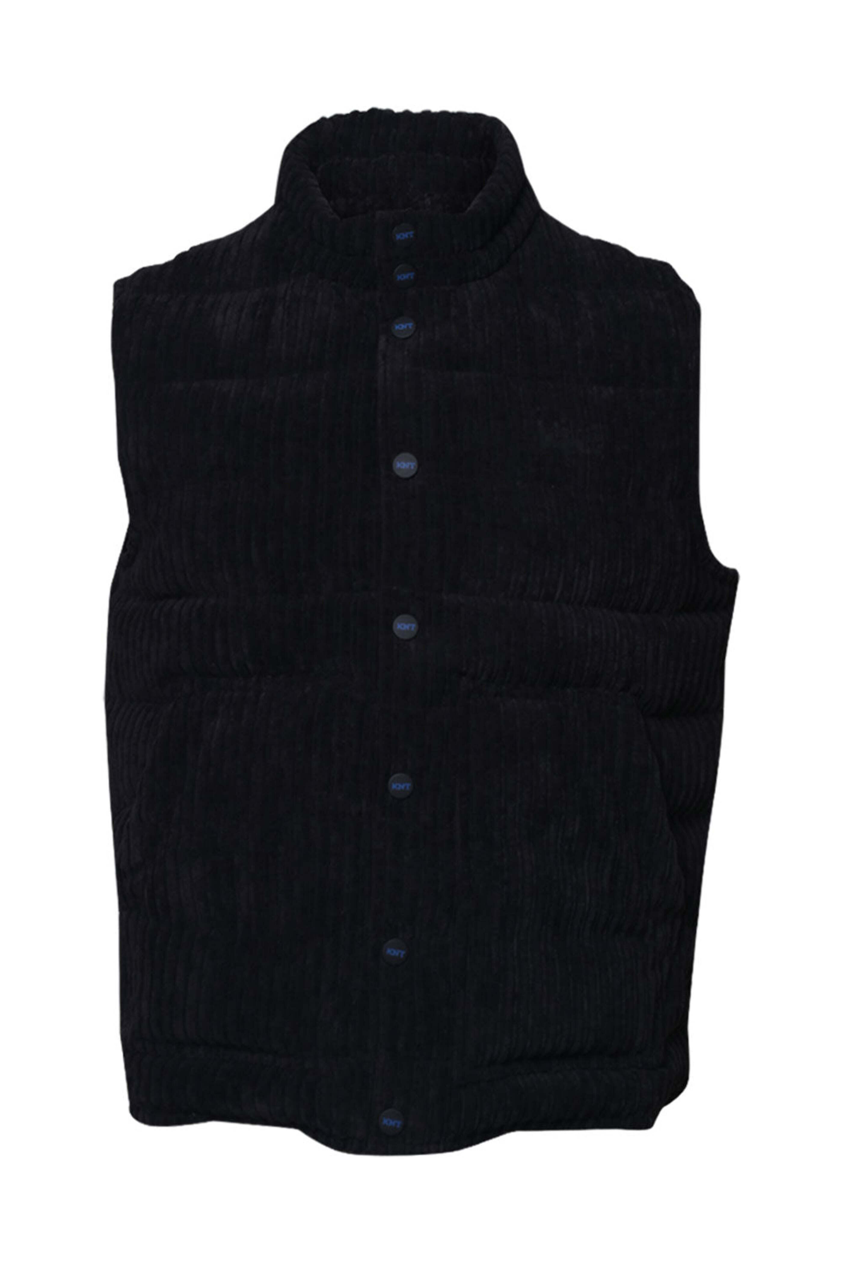 KNT Black Corduroy Puffer Vest. Stand collar. Snap button closure. Waist slip pockets with snap closure. Polyester lining. Made in Italy. 92% polyester 8% nylon.