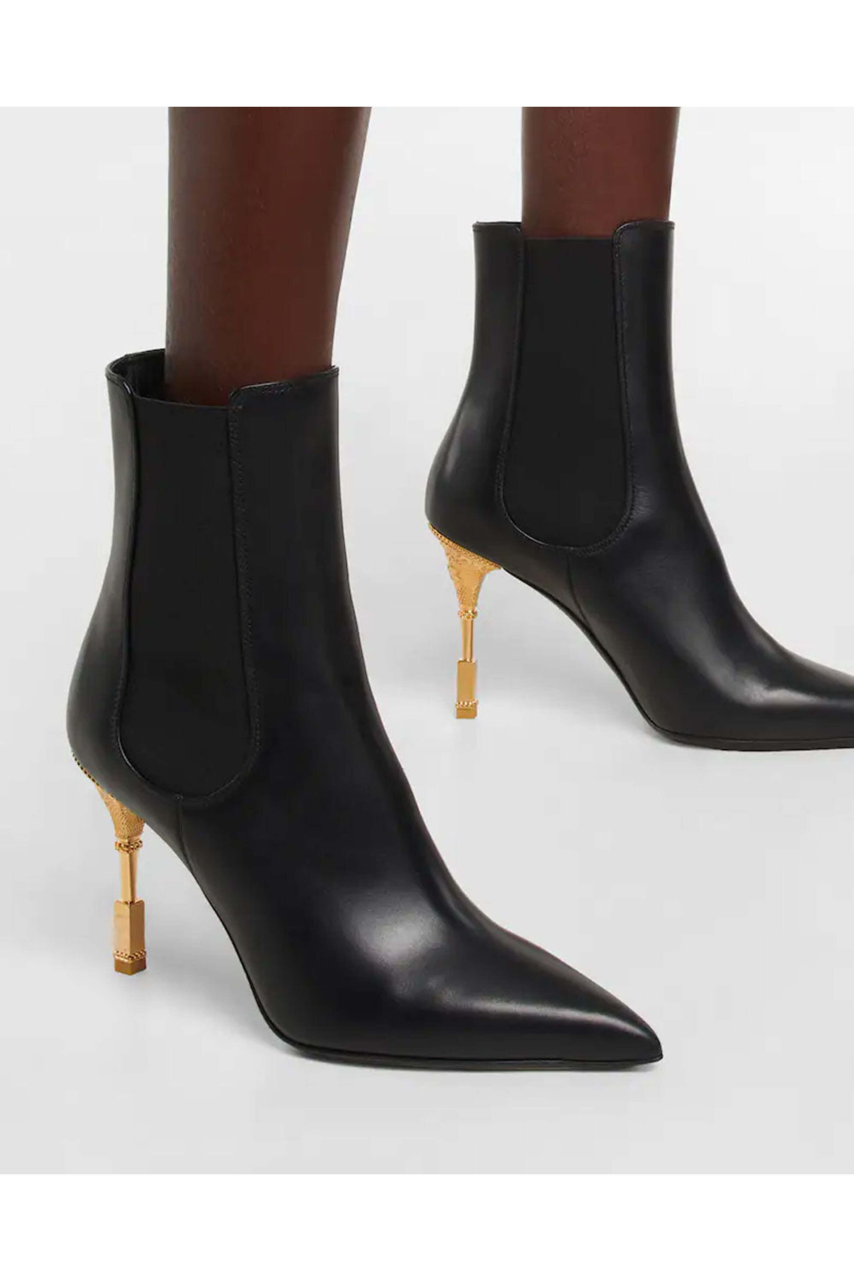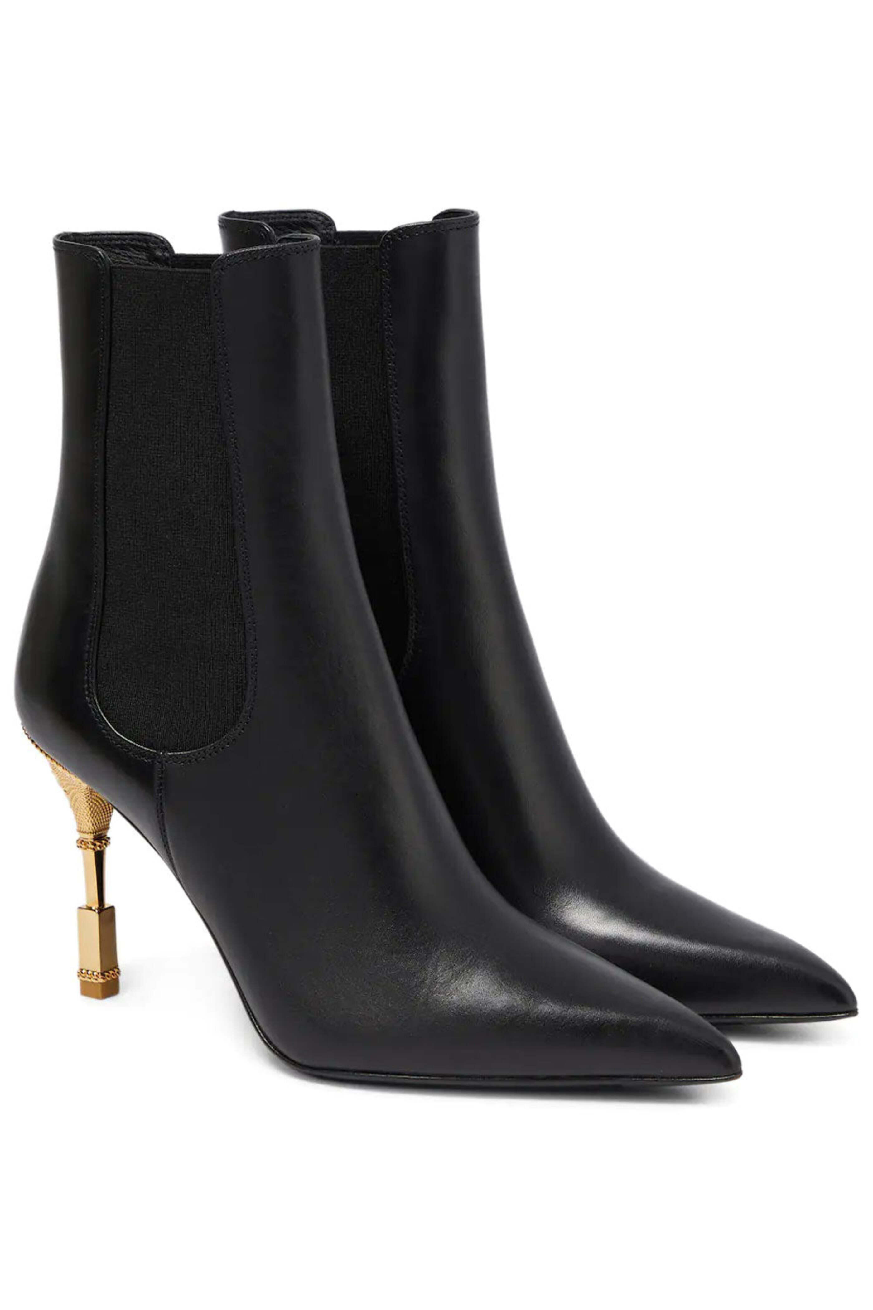 Balmain Moneta Calfskin Ankle Boot in Noir. Pointed toe. Elasticized side gores. Pull on. 4 gold engraved heel. Leather upper, lining and sole. Made in Italy. Sizing runs small; we recommend sizing one half size larger.