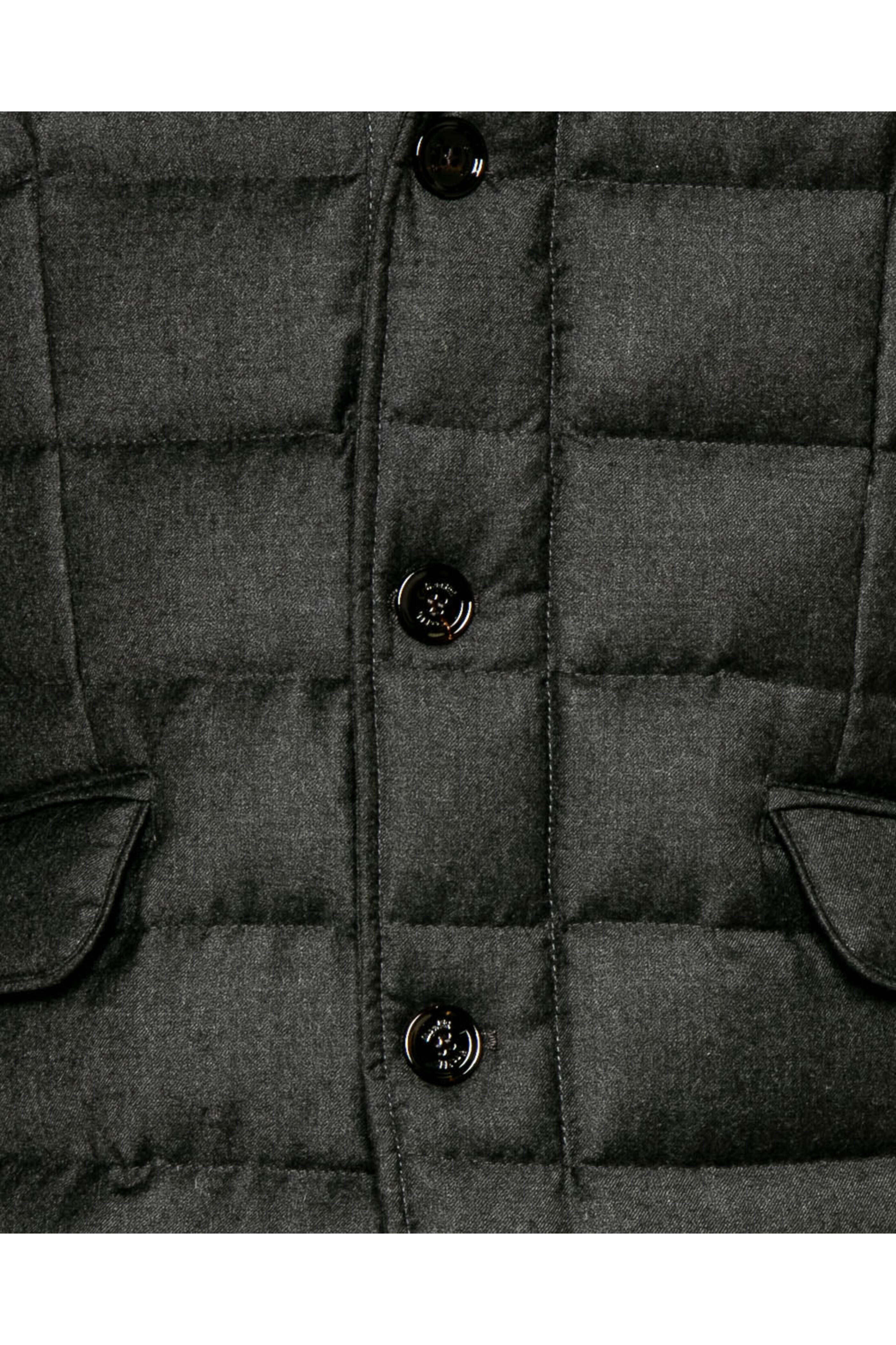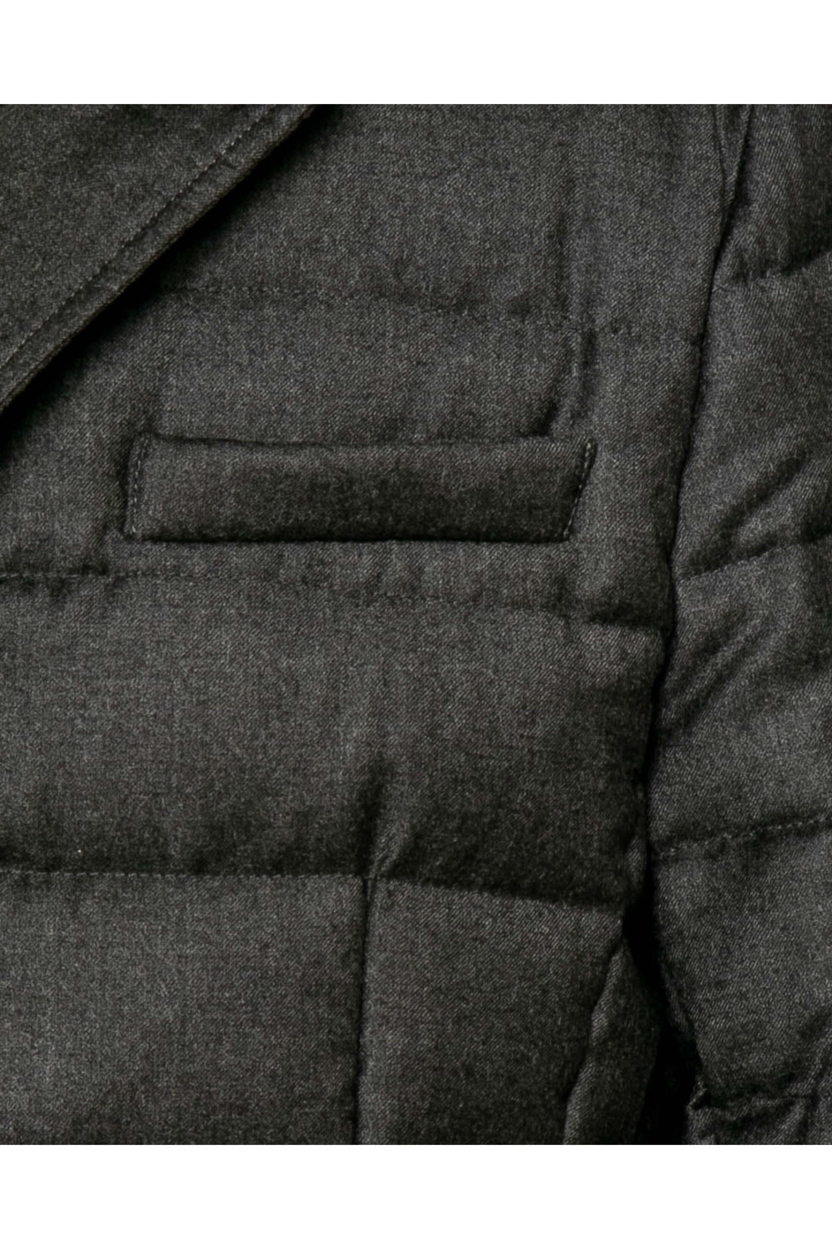 MooRER Anthracite Zayn-L Jacket. Two-way zip front closure with button overlay. Standard collar. Leather trim detailing. Filled with direct injected goose down. Front left chest pocket. Flap waist pockets. Fully lined. Made in Italy. 94% virgin wool, 6% cashmere.