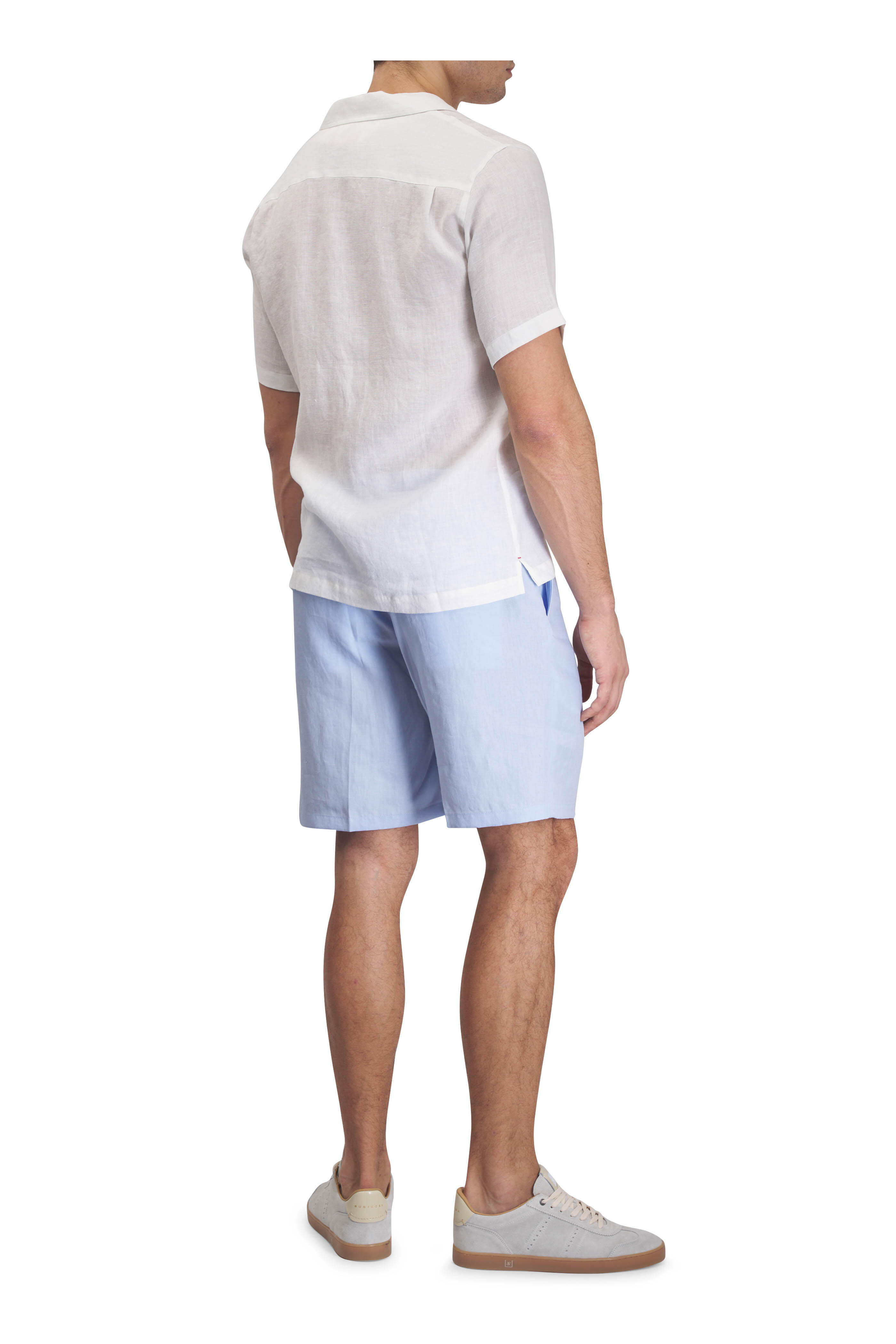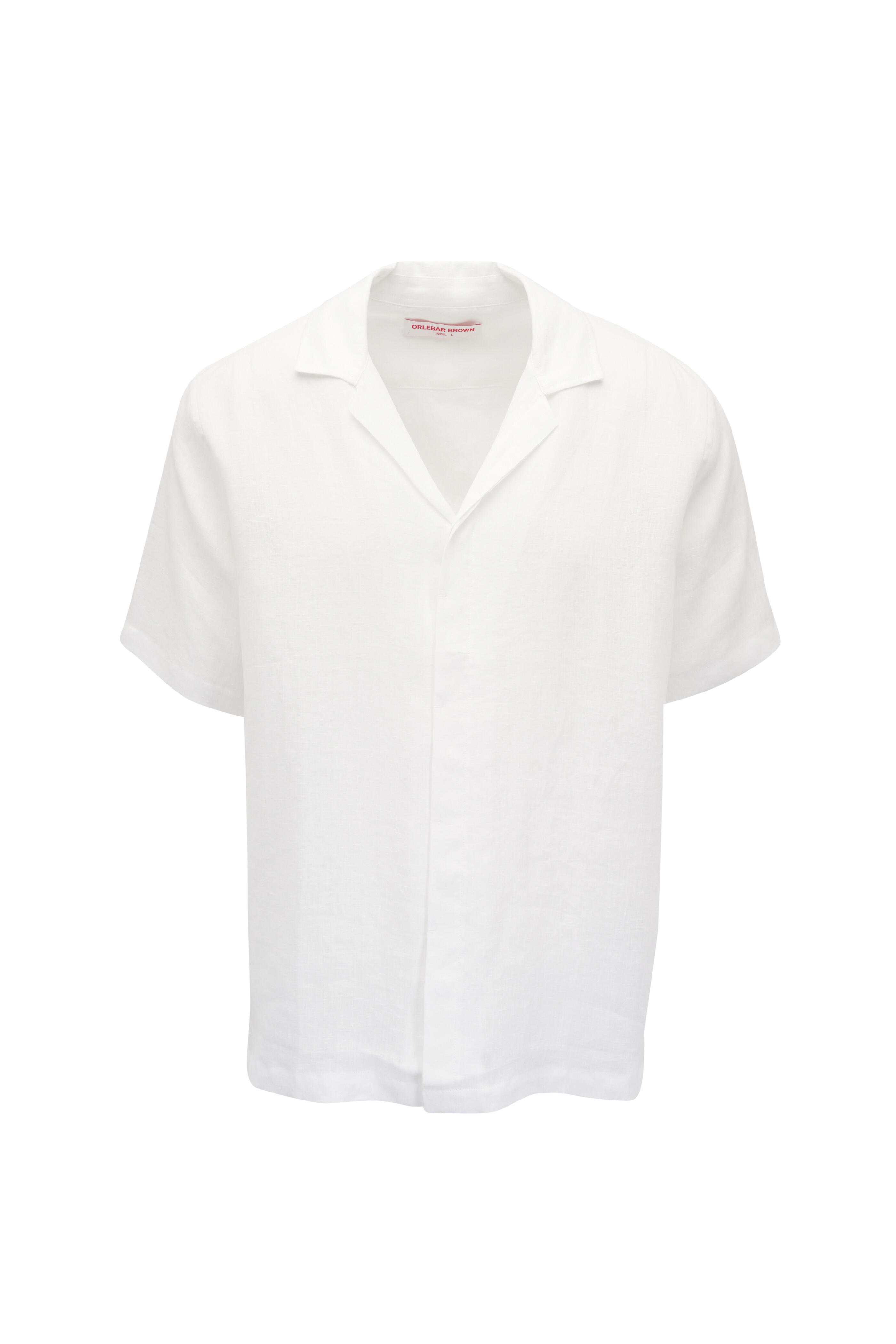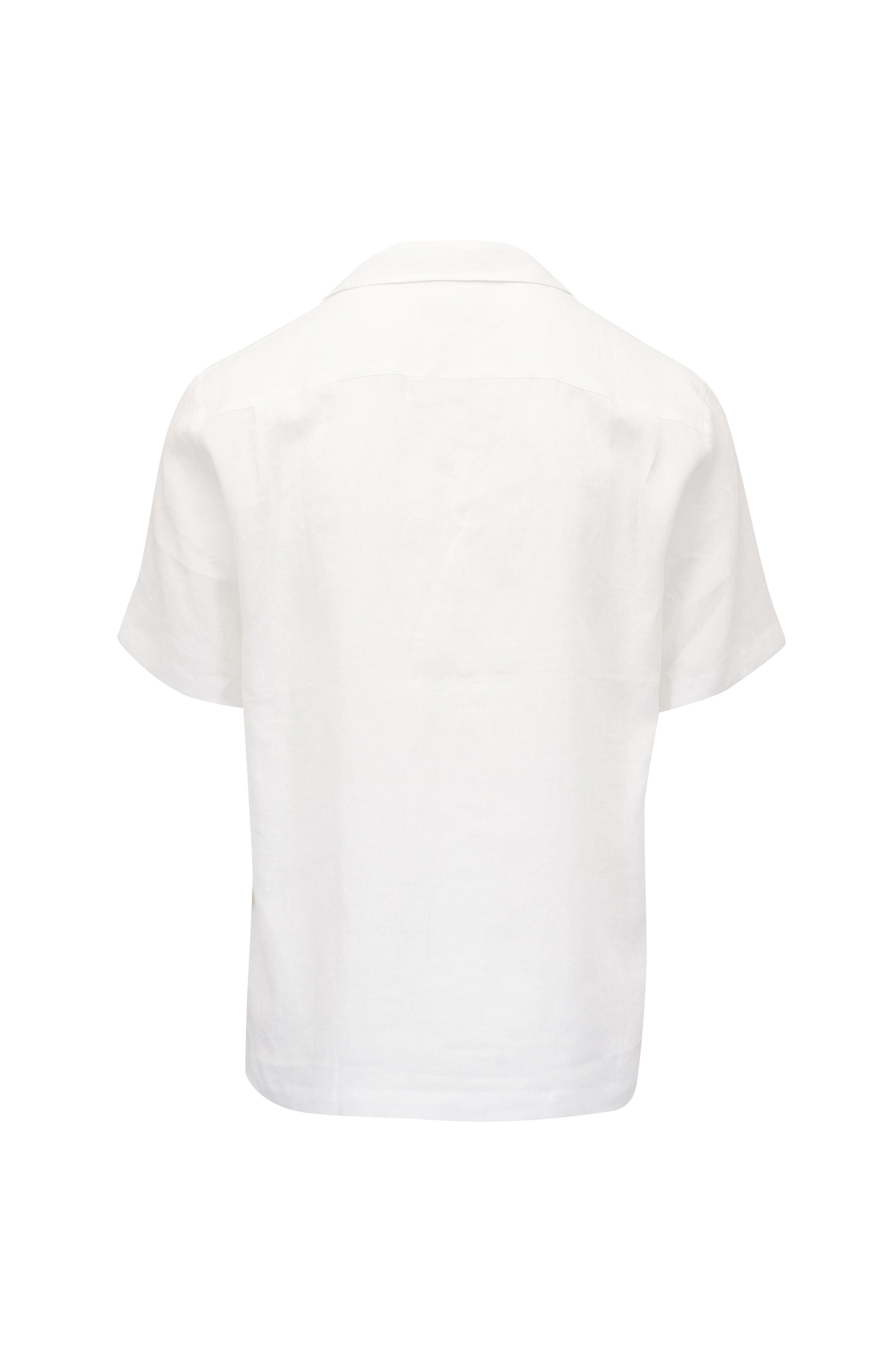 Camp collar. Concealed front button placket. Vented hem. Made in Portugal. 100% linen. Machine wash.