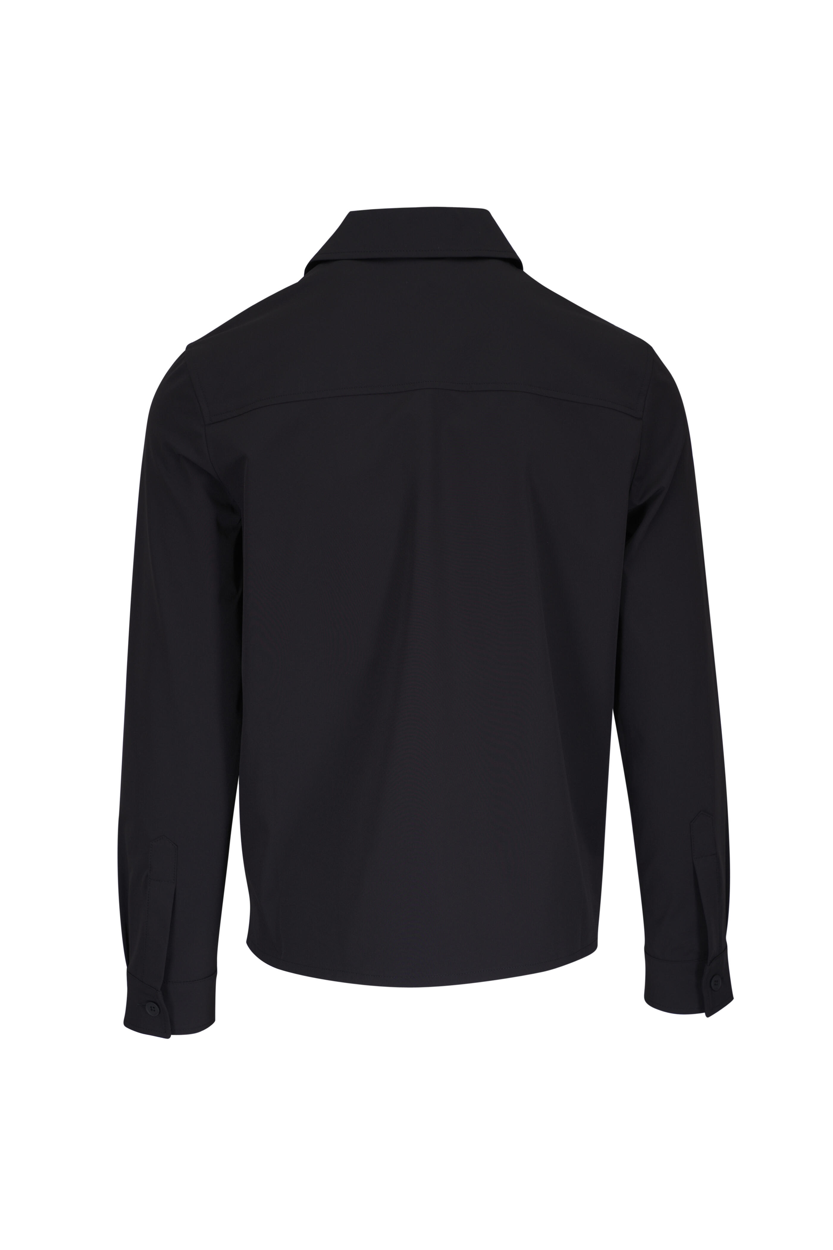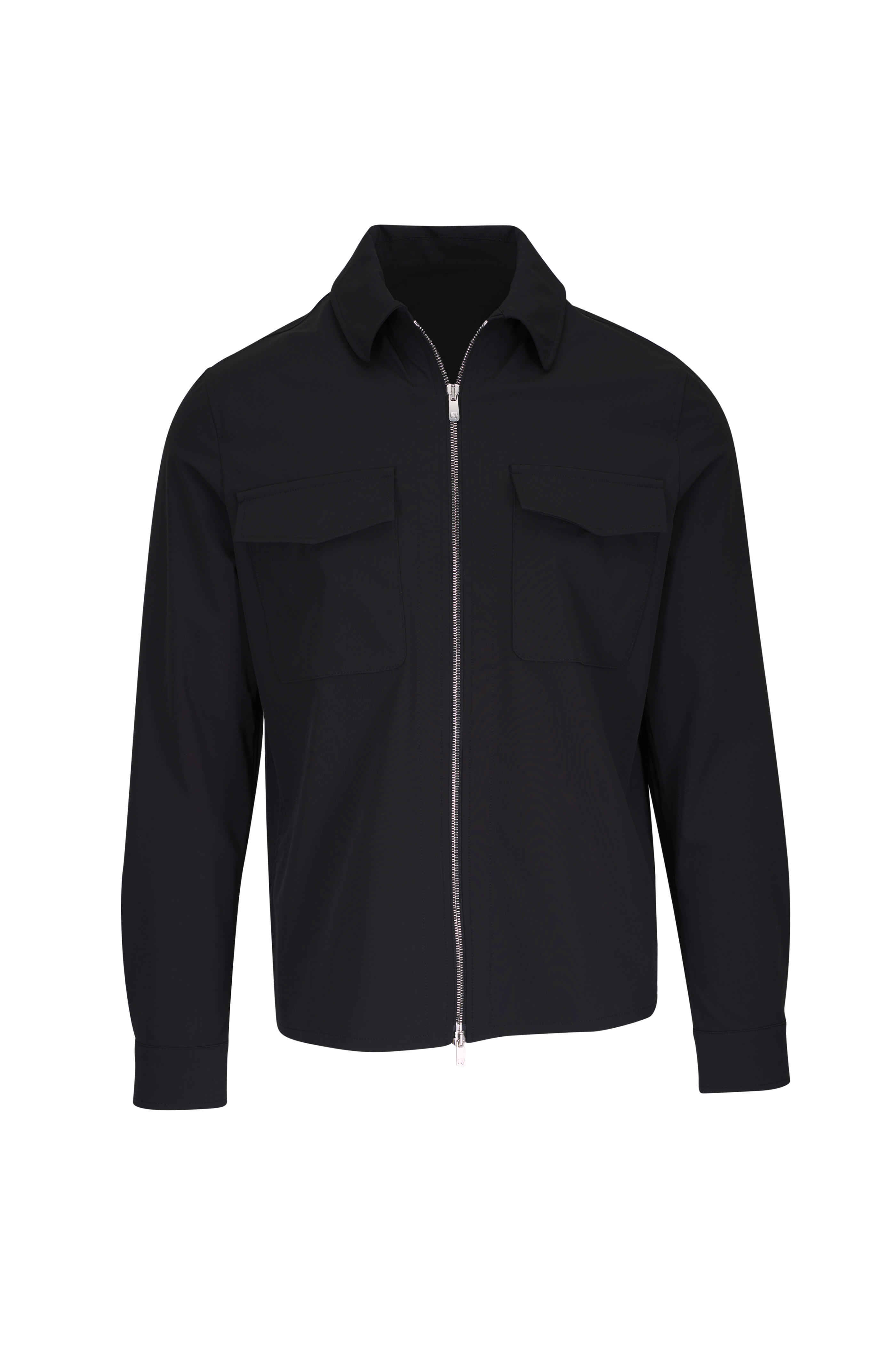 Spread collar. Two way front zip. Single button square cuffs. Chest flap pockets. Made in Italy. 83% polyamide, 17% elastane. Machine wash.