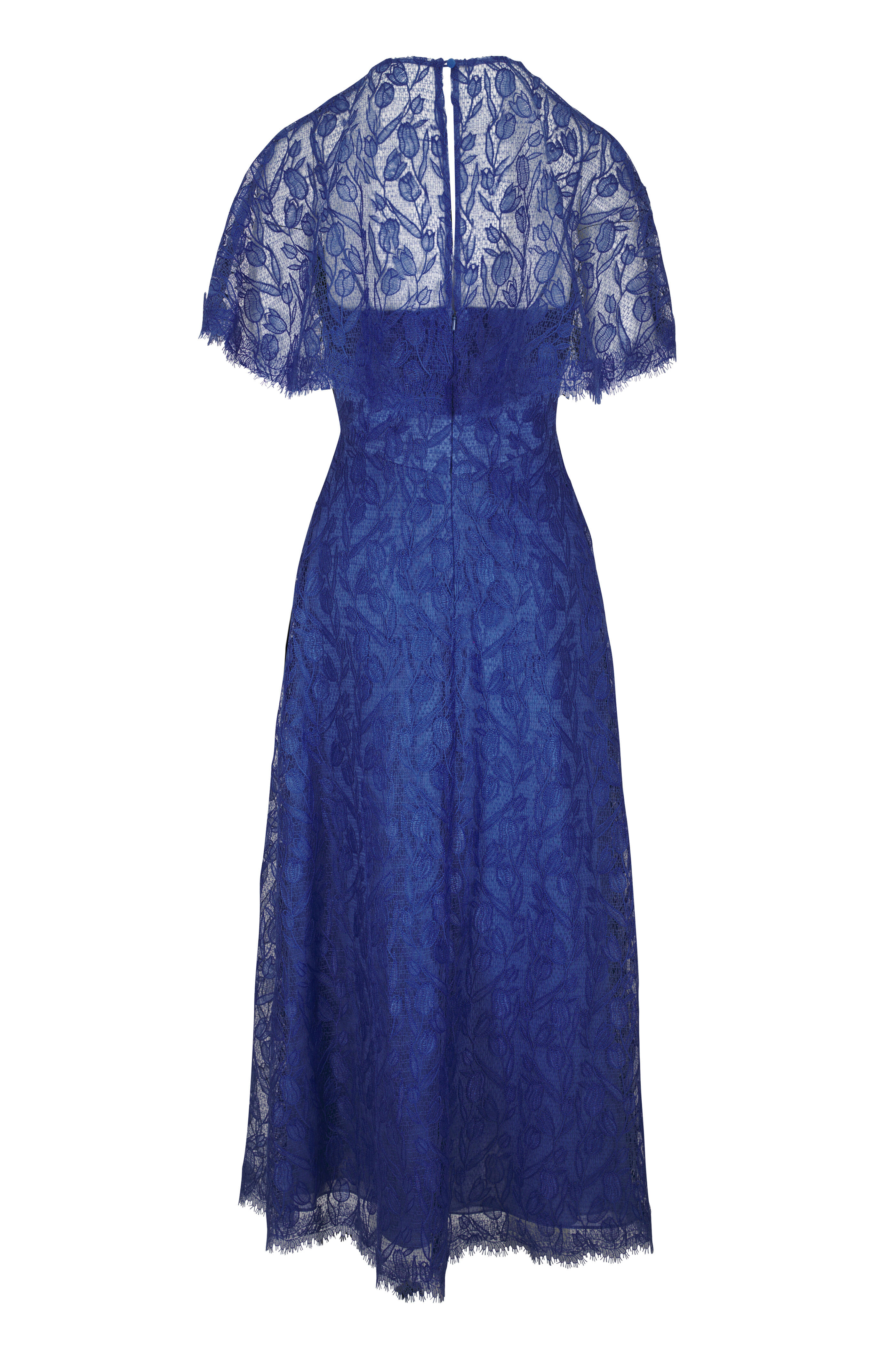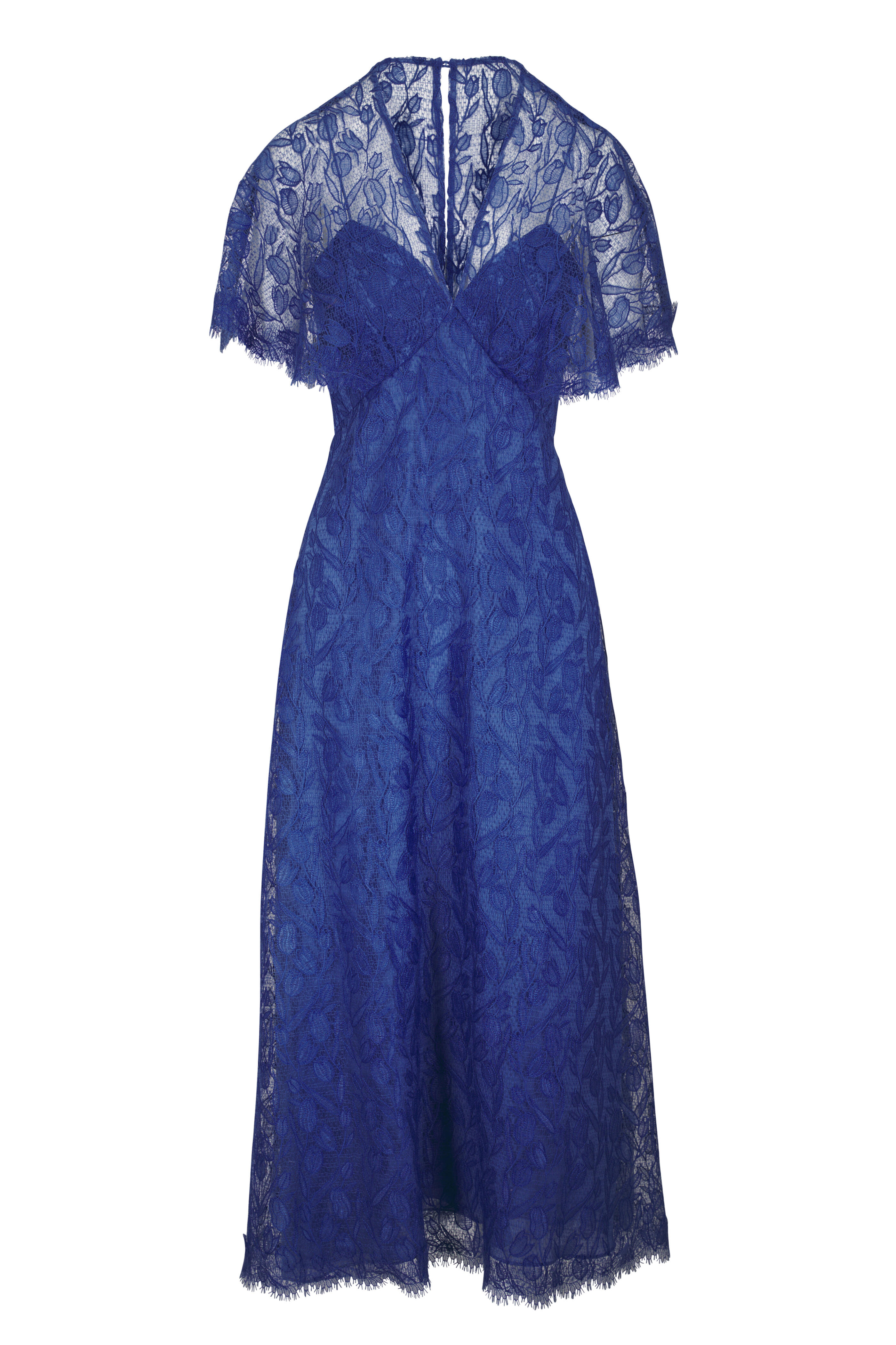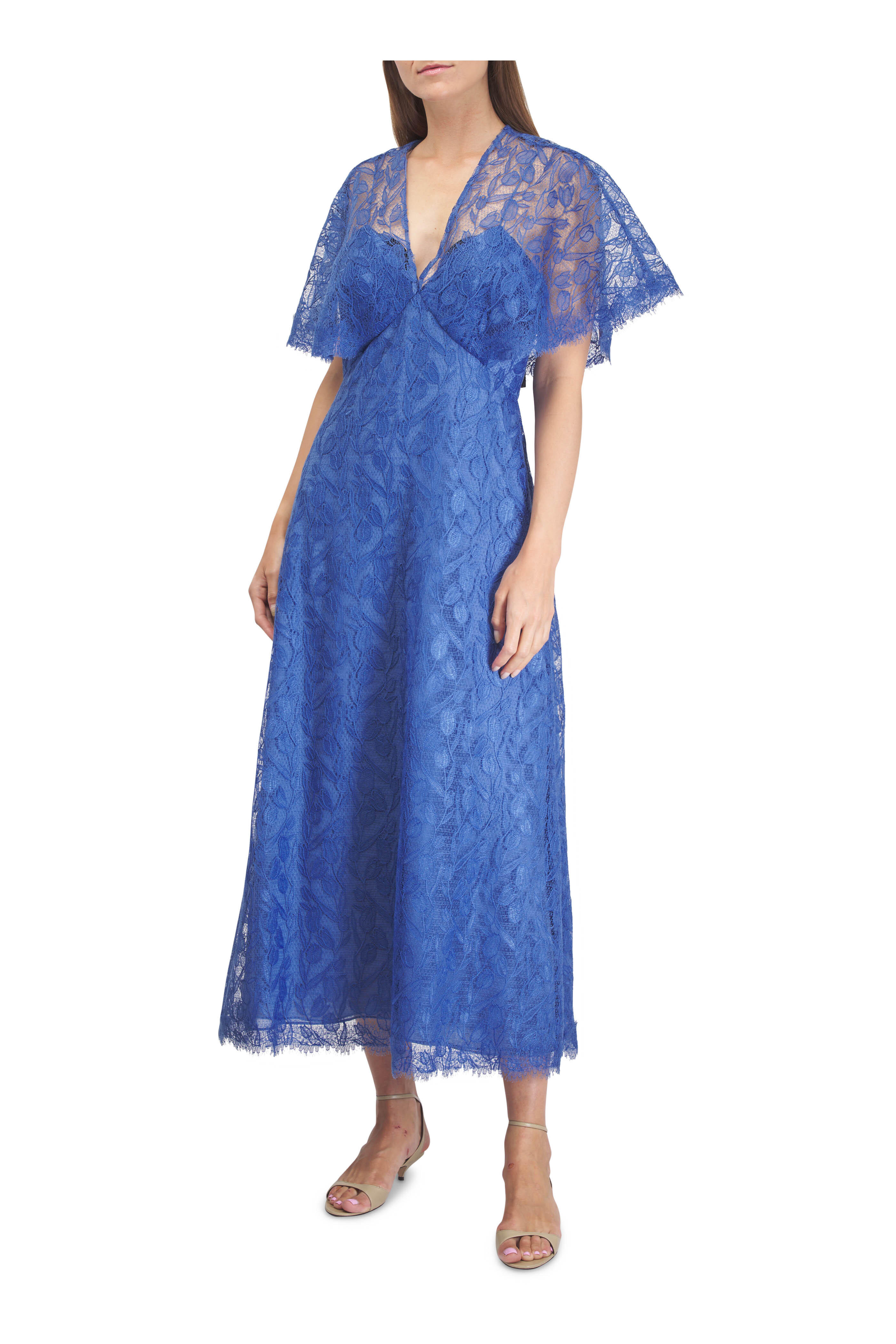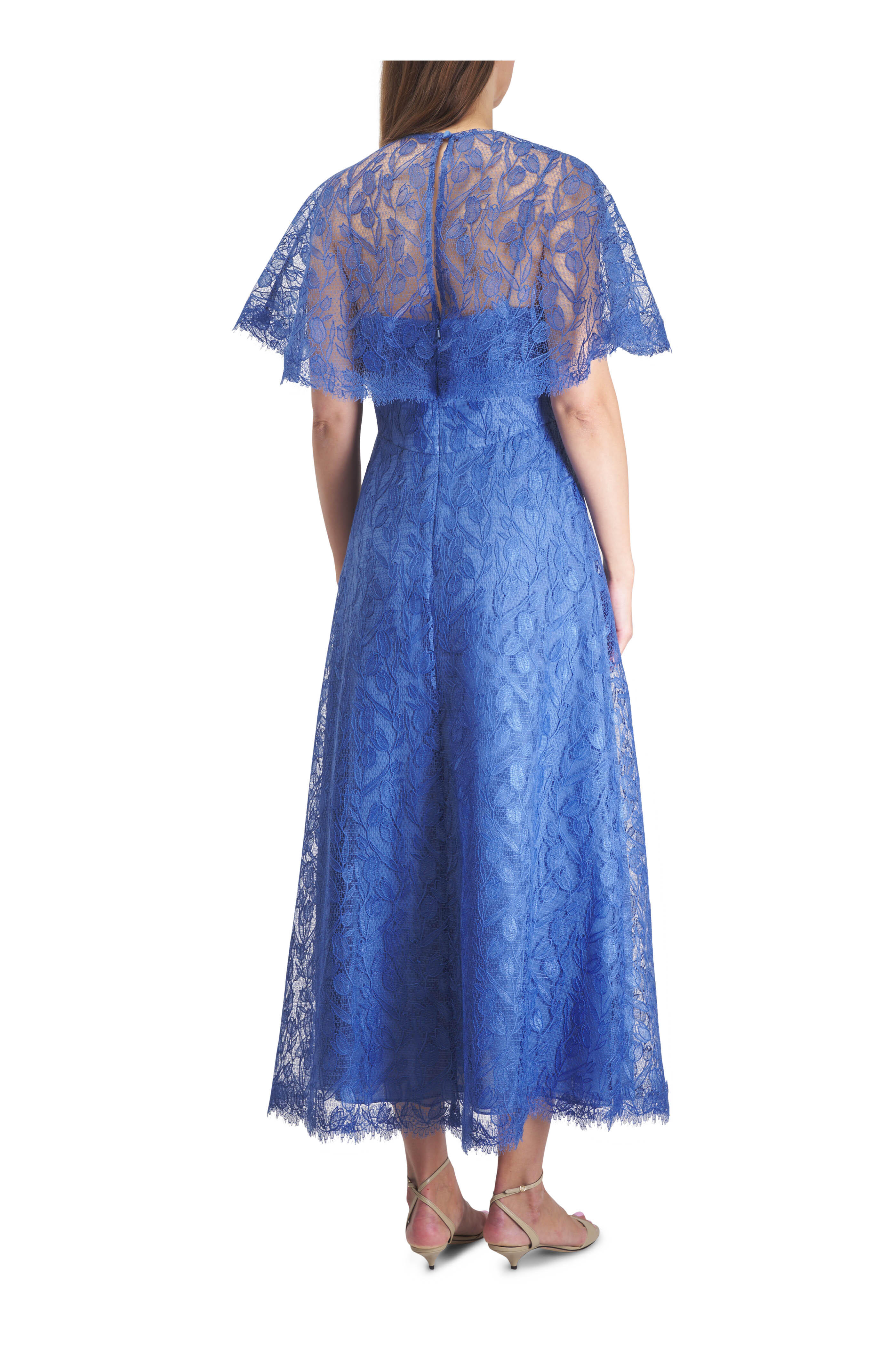 V-neckline. Concealed back zip; keyhole back. Embellished lace overlay. A-line silhouette. Straight hem. Made in USA. Shoulder to hem 54" (size 4). 100% polyester; fully lined. Dry clean.