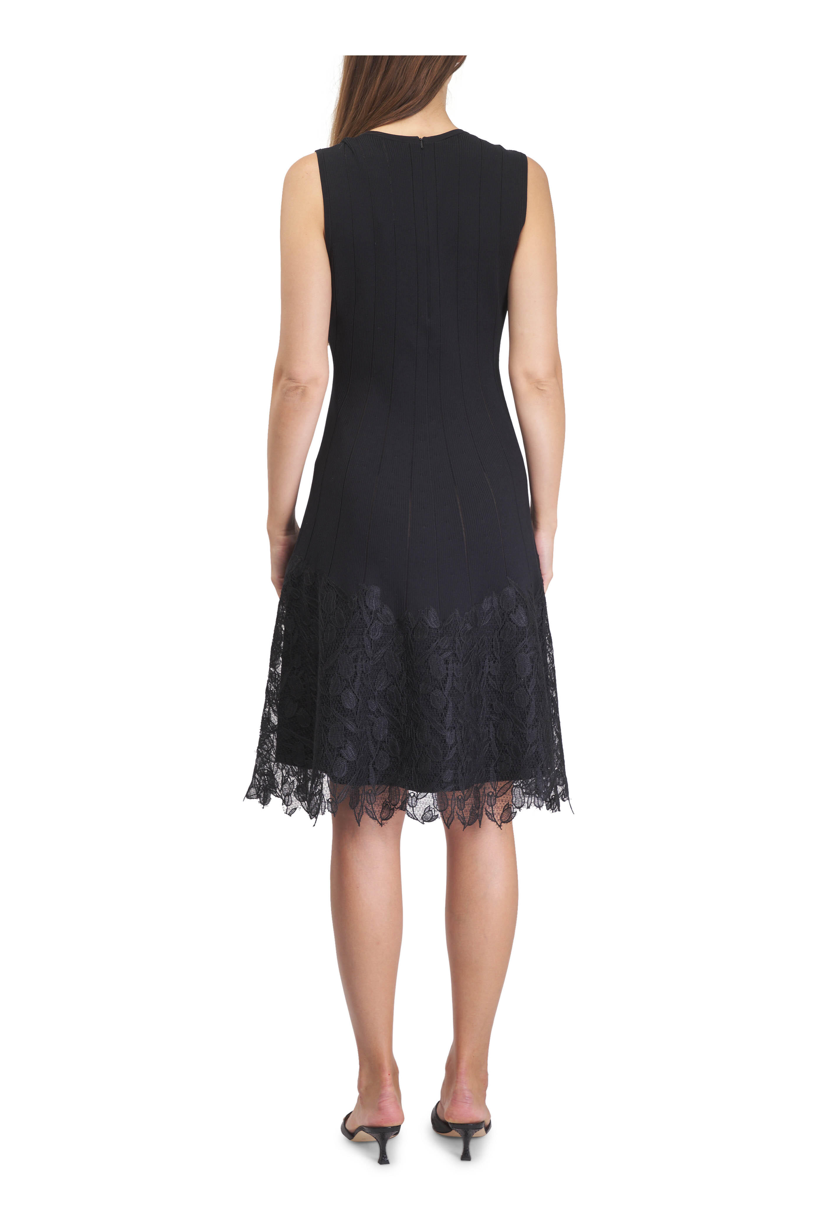 Crew neck. Concealed back zip. Flared hem. Made in NYC. Shoulder to hem 41". 60% Tencel lyocell, 22% recycled nylon, 15% polyamide, 3% spandex: lace combo: 100% polyester. Dry clean.