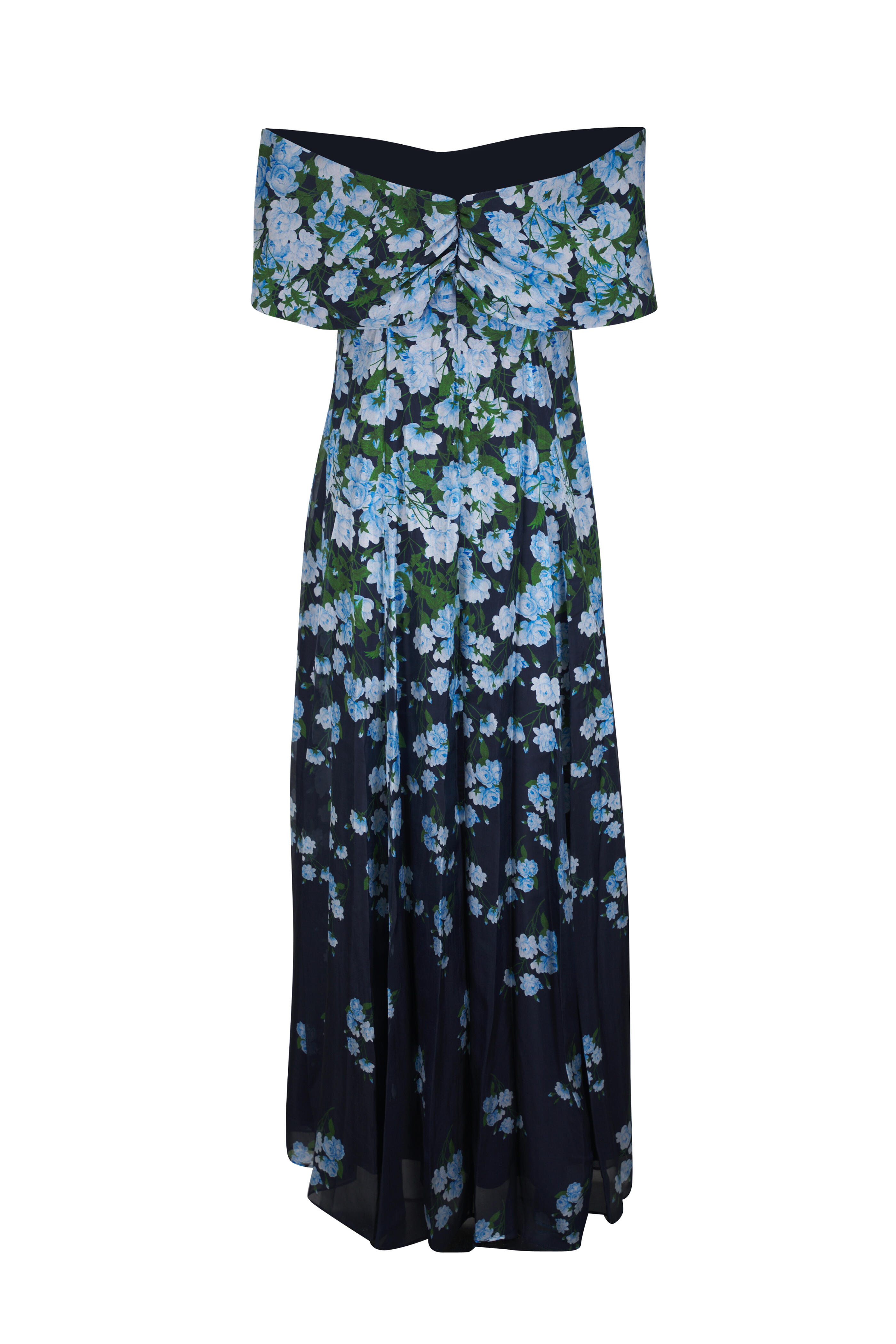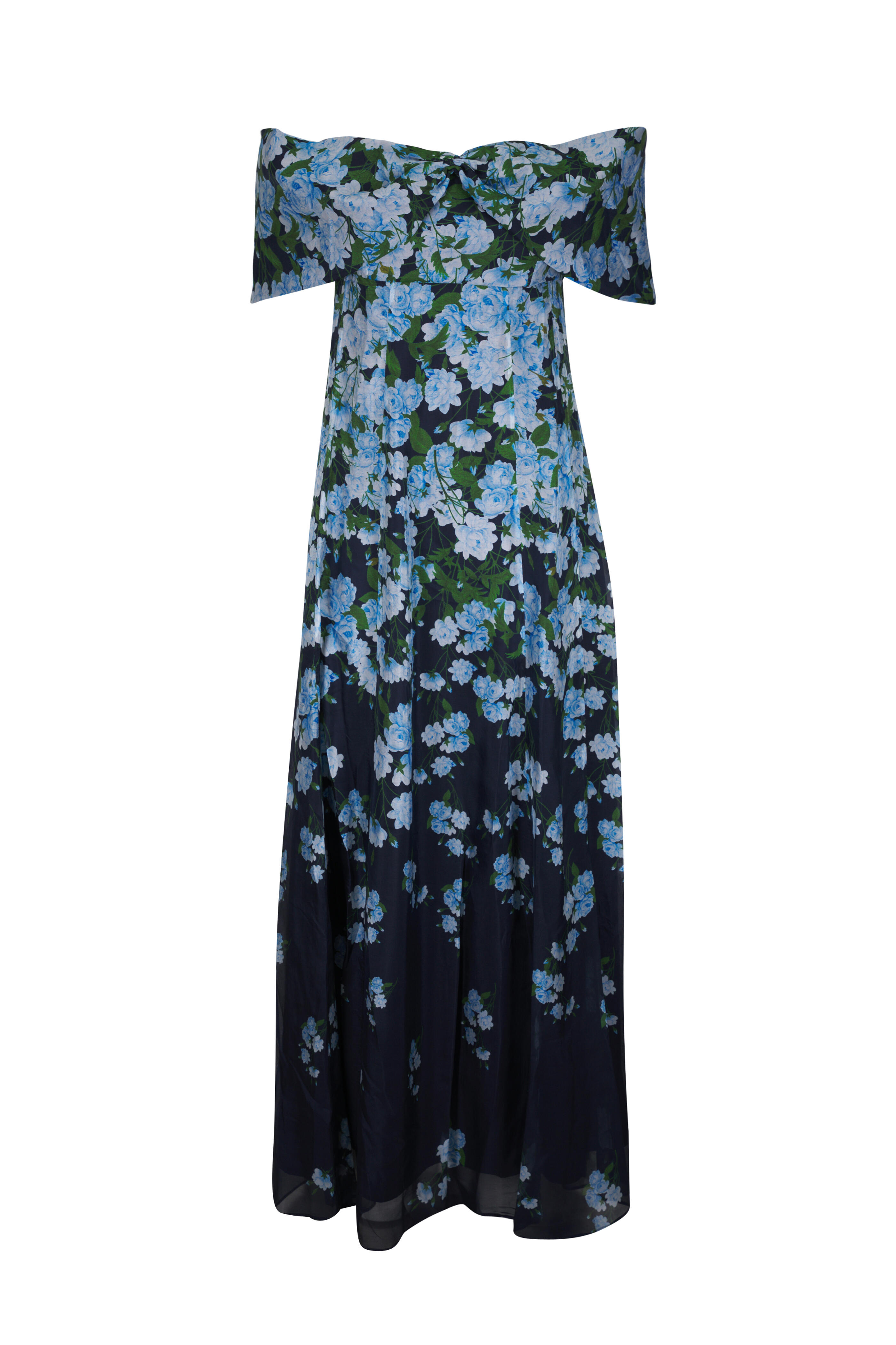 Off the shoulder neckline. Back zip closure. Imported. Approximately 61 ½" shoulder to hem. 74% viscose, 26% silk; lined. Dry clean.