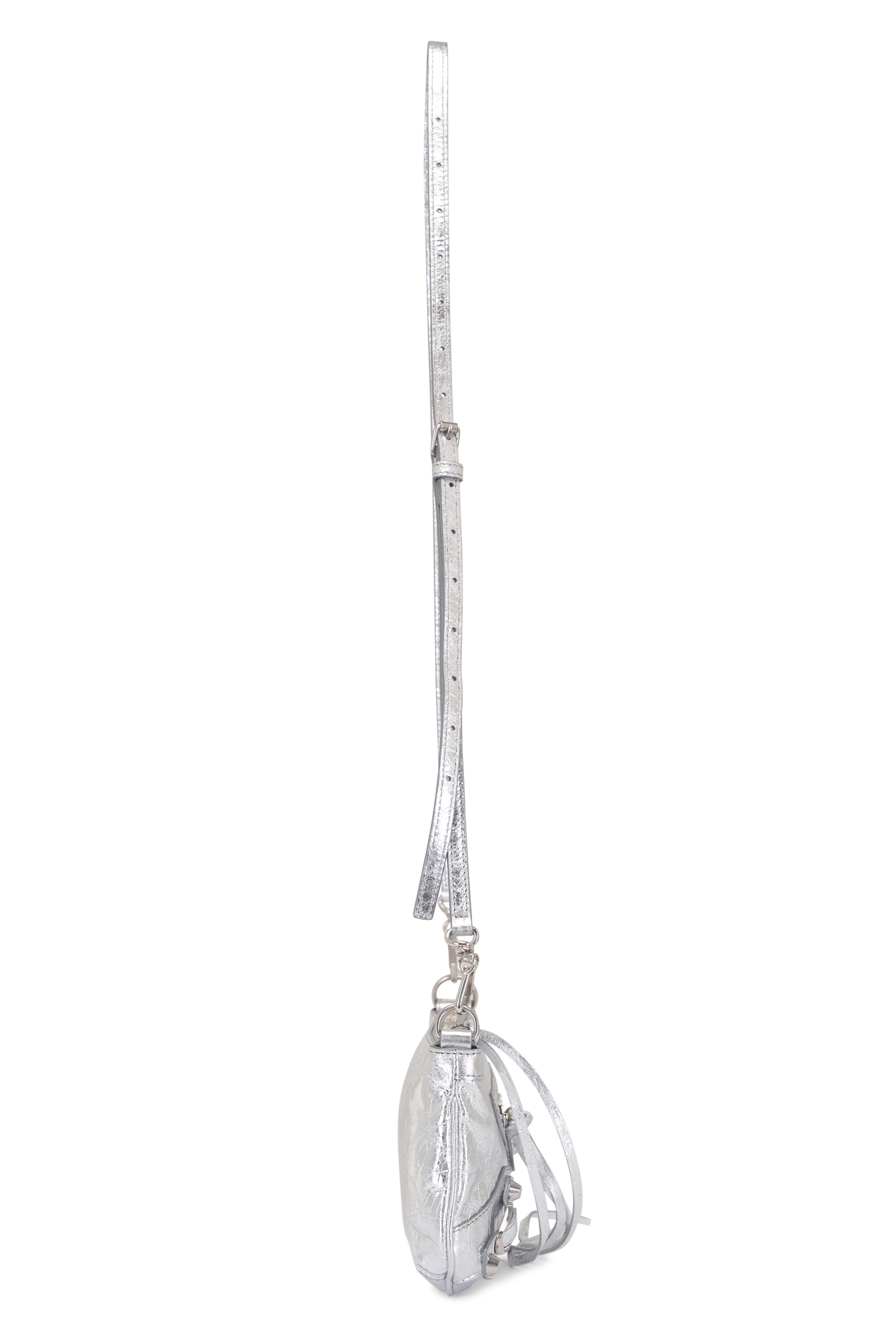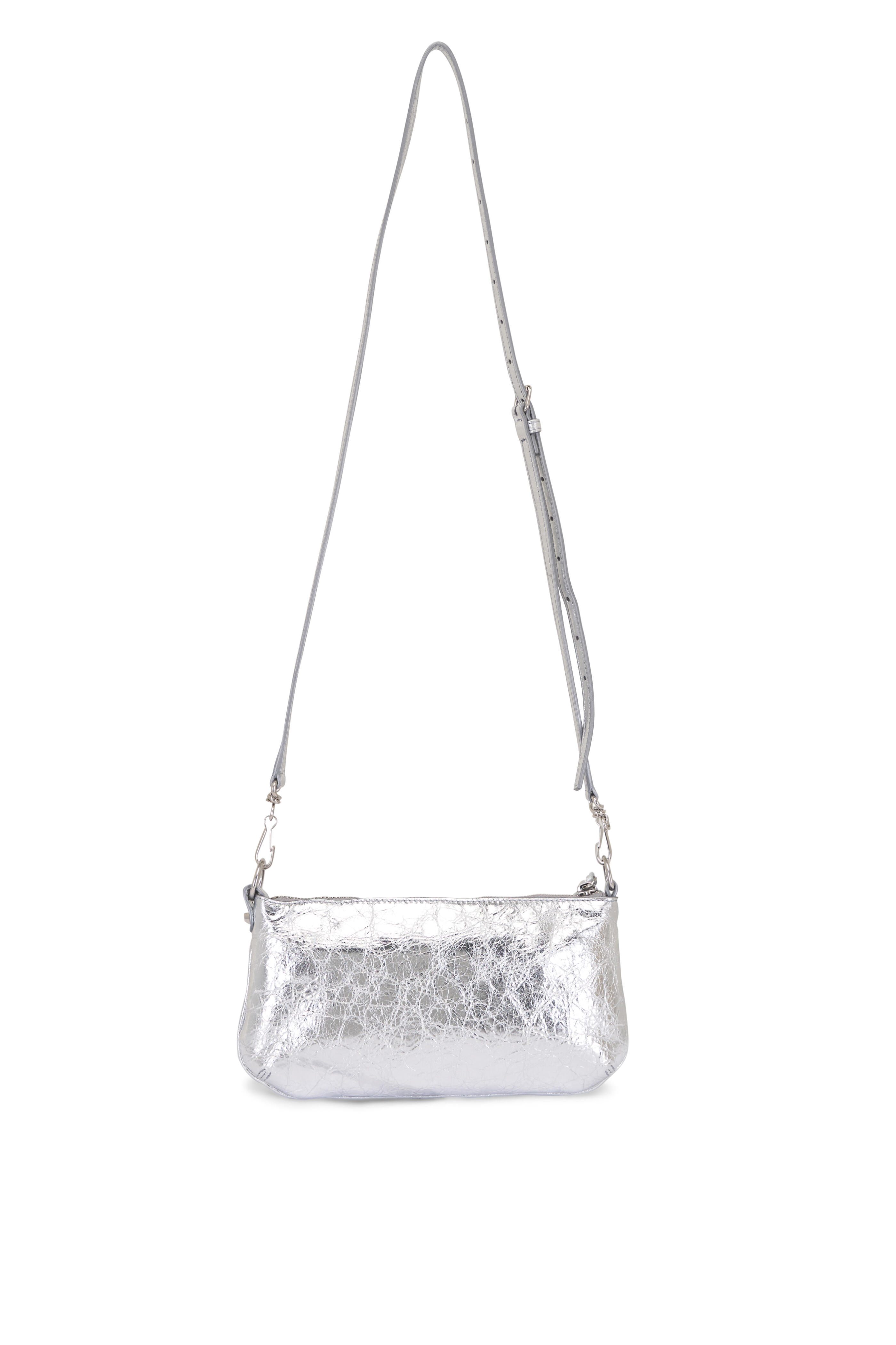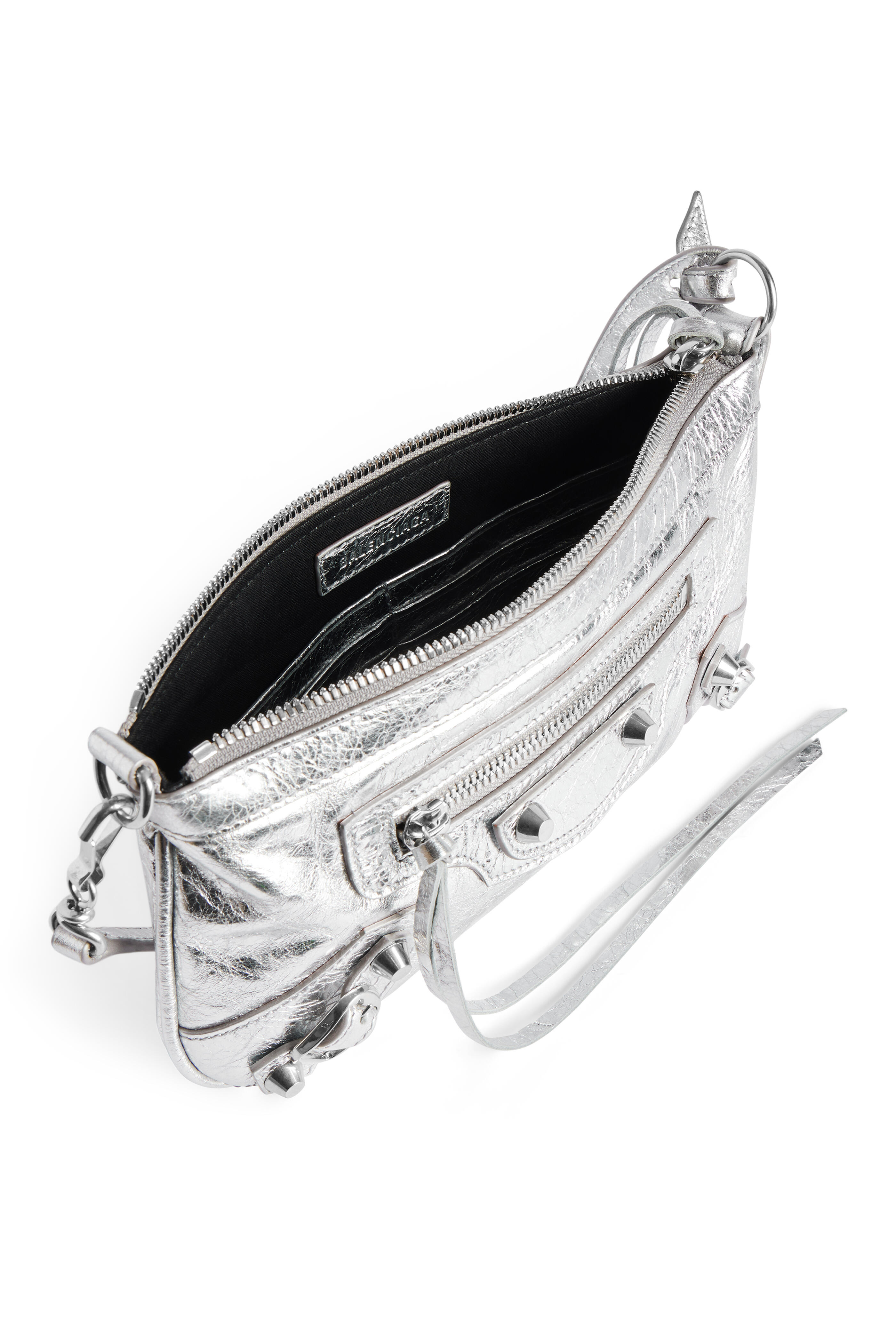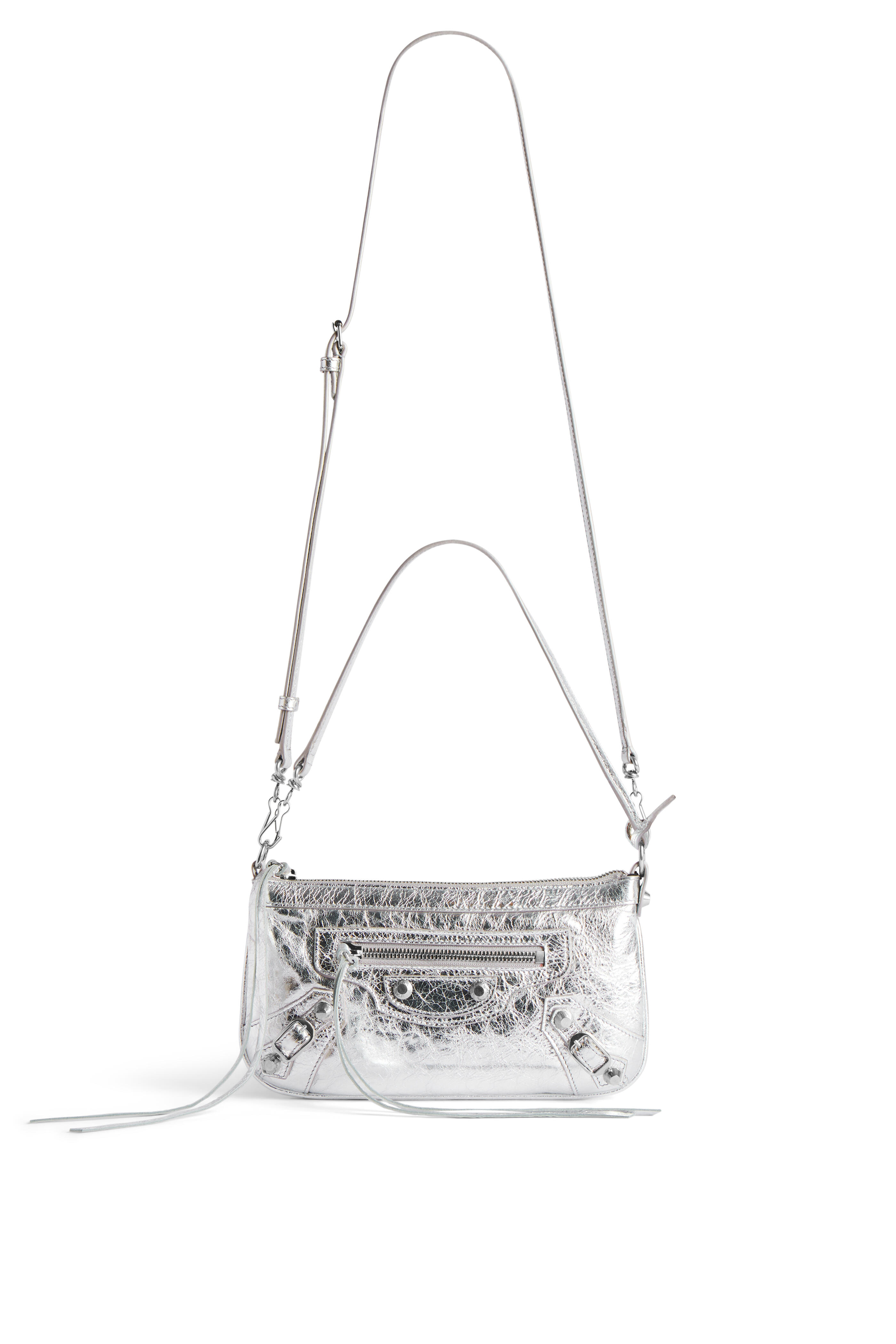 Arena Storico lambskin. Zipped closure with knotted leather puller. Front zipped pocket with knotted leather puller. Six card slots. Cotton canvas lining. Siler toned hardware. Made in Italy. Length: 25 cm | 9.8". Height: 14 cm | 5.5". Width: 4 cm | 1.6". Handle drop: 18 cm | 7". Strap drop: 60 cm | 23.6". Can fit a smartphone and a wallet.