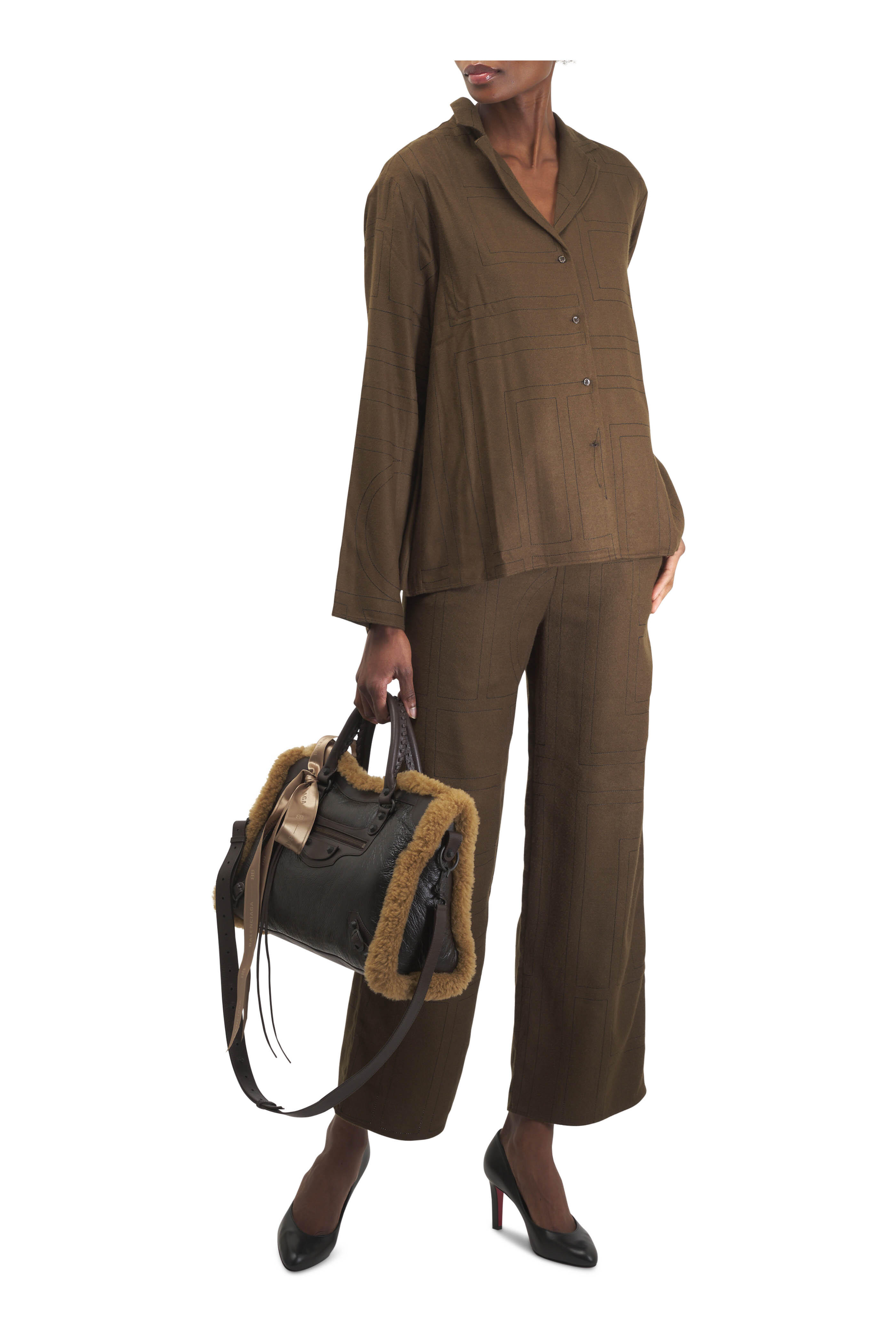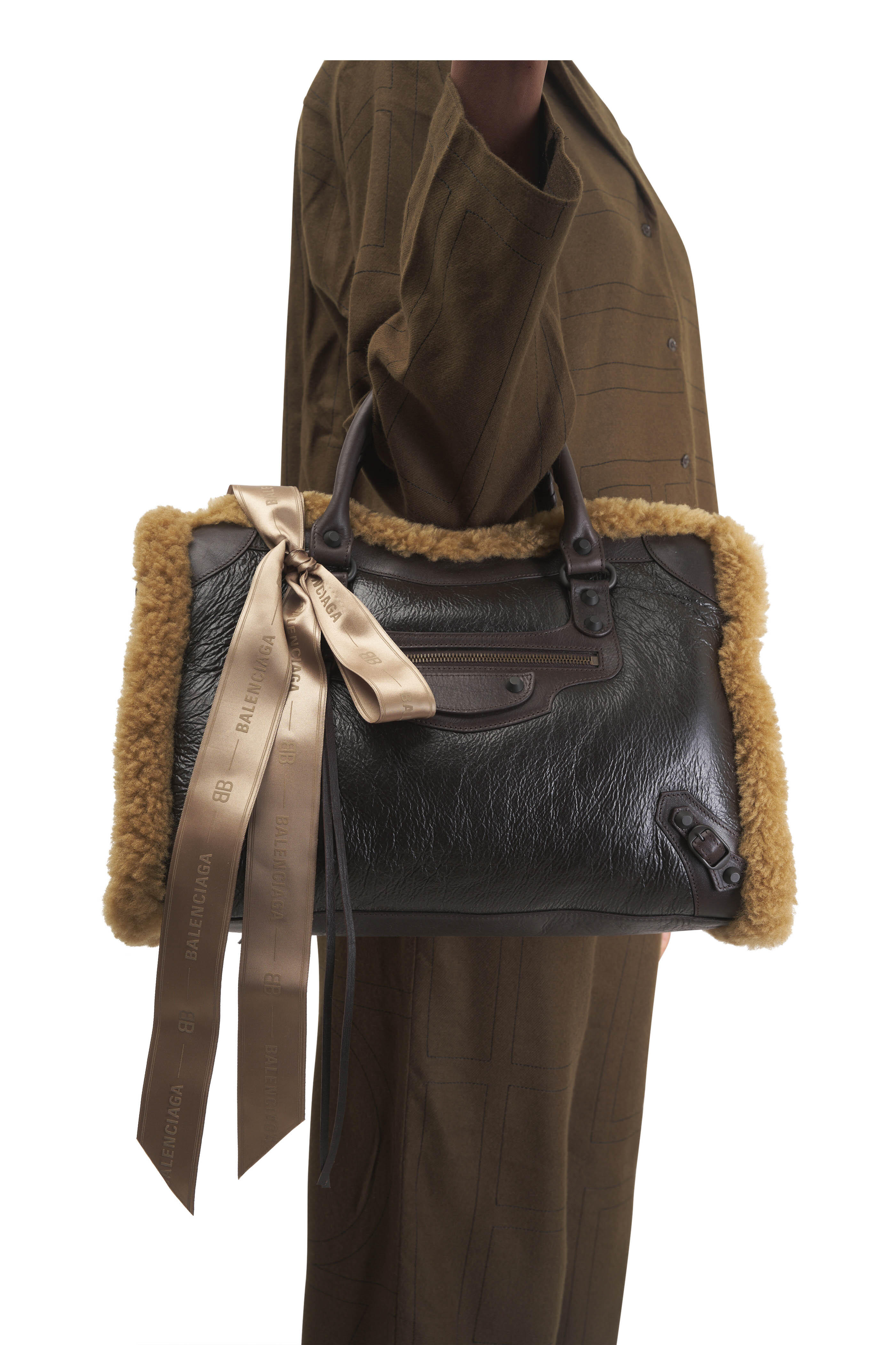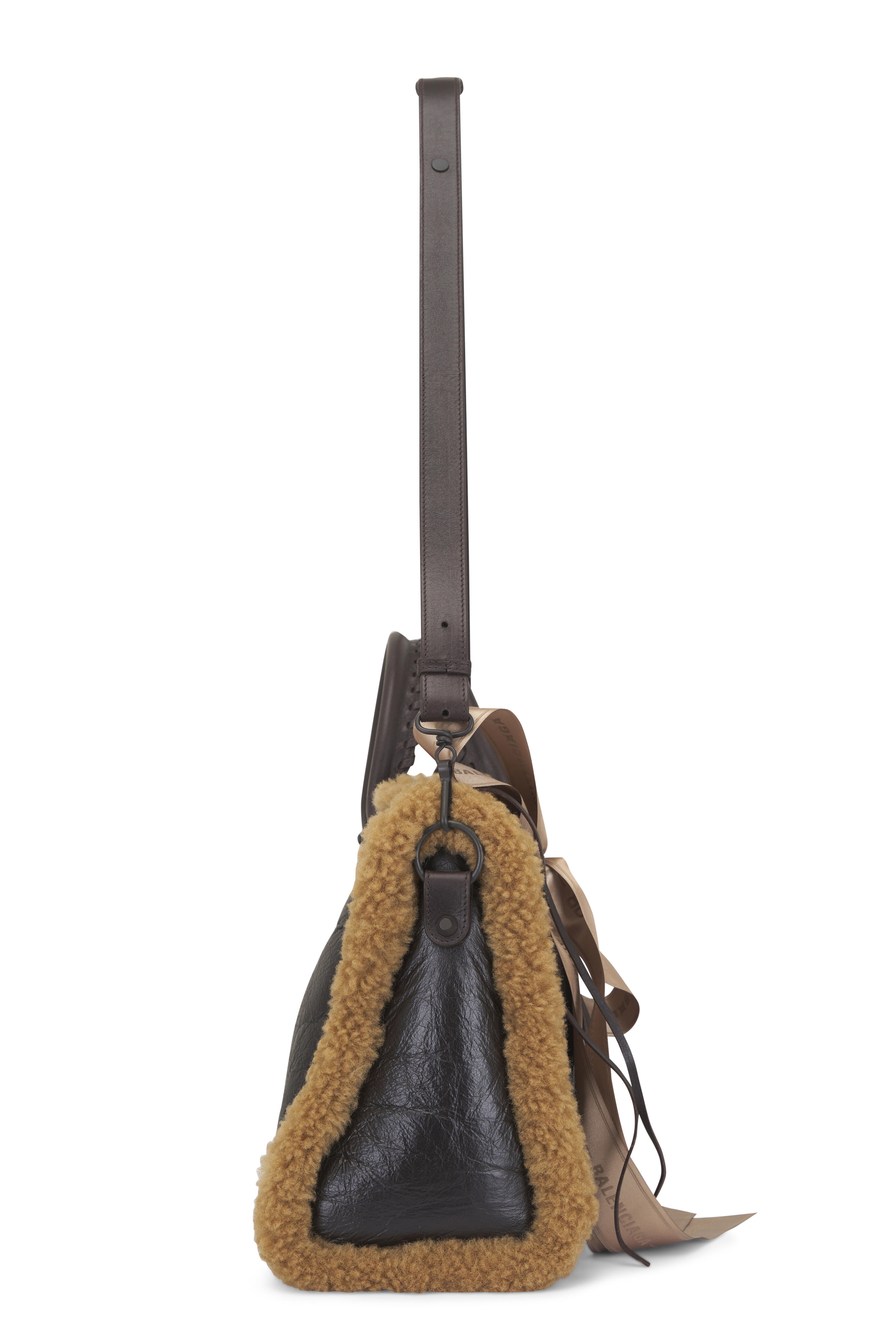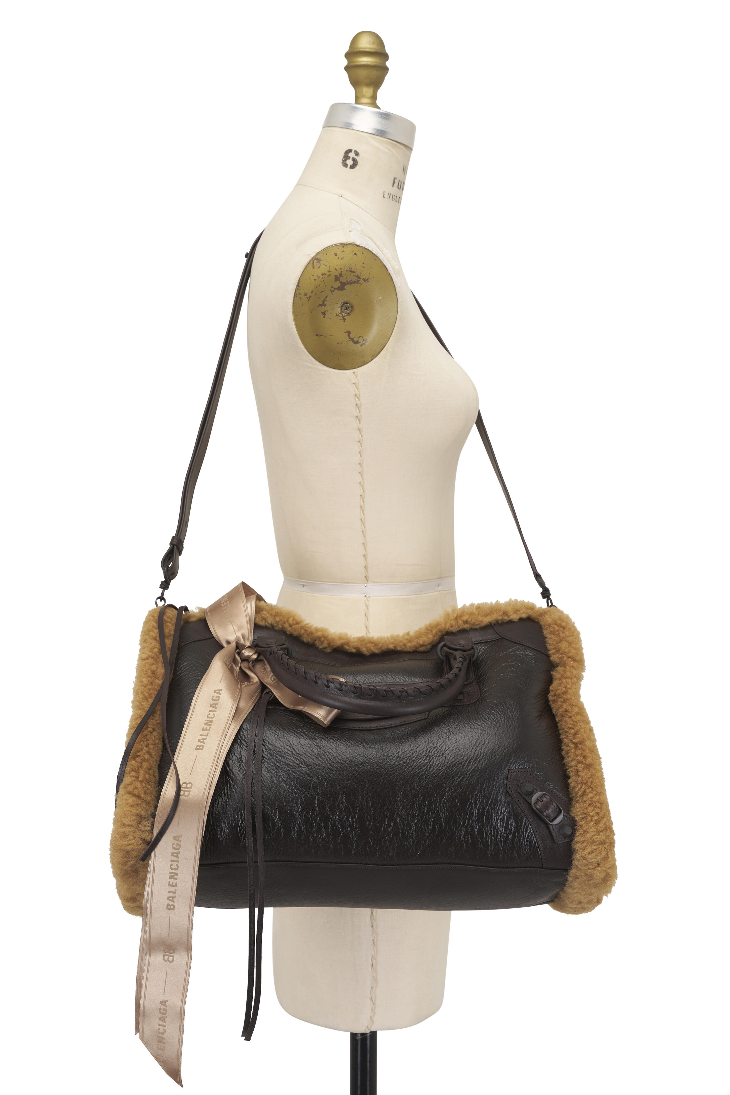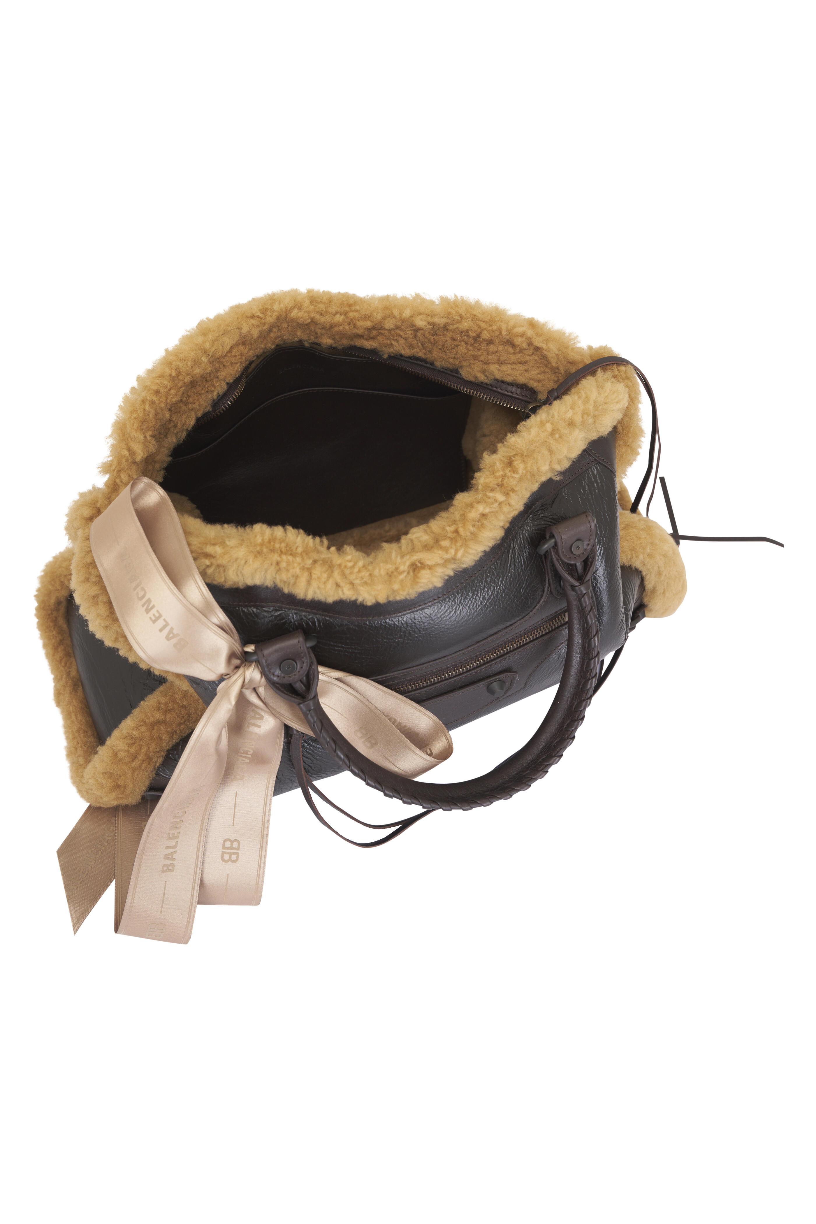 Calfskin, shearling and polyester. Dual top handles. Magnet closure. One main compartment; 1 inner zip pocket. Brass hardware. Front zipped pocket with knotted leather pull. Cotton canvas lining. Made in Italy. Length: 38.5 cm | 15.1". Height: 24 cm | 9.4". Width: 13.5 cm | 5.3". Handle drop: 15.5 cm | 6.1". Strap drop: 36 cm | 14.2".