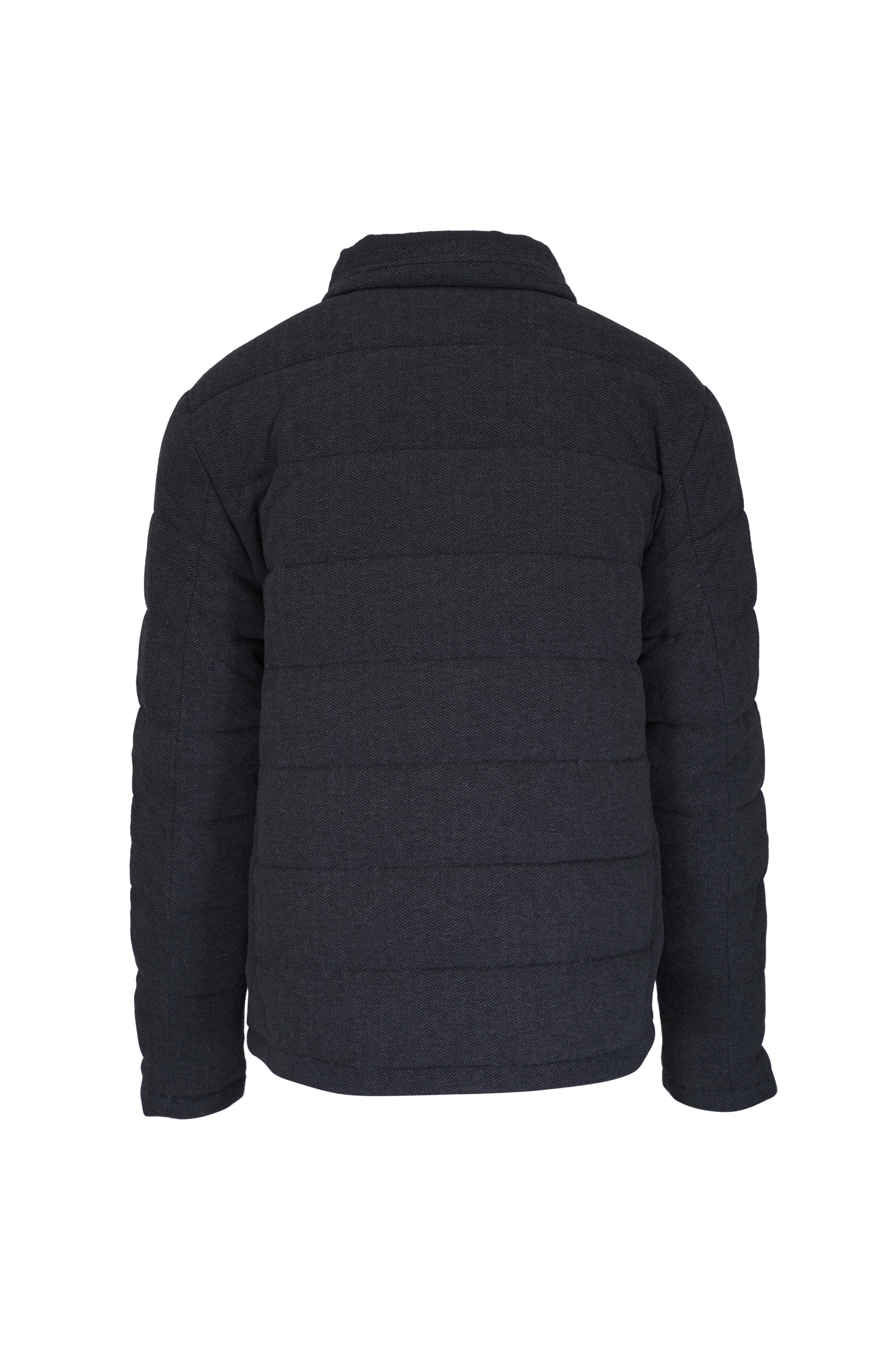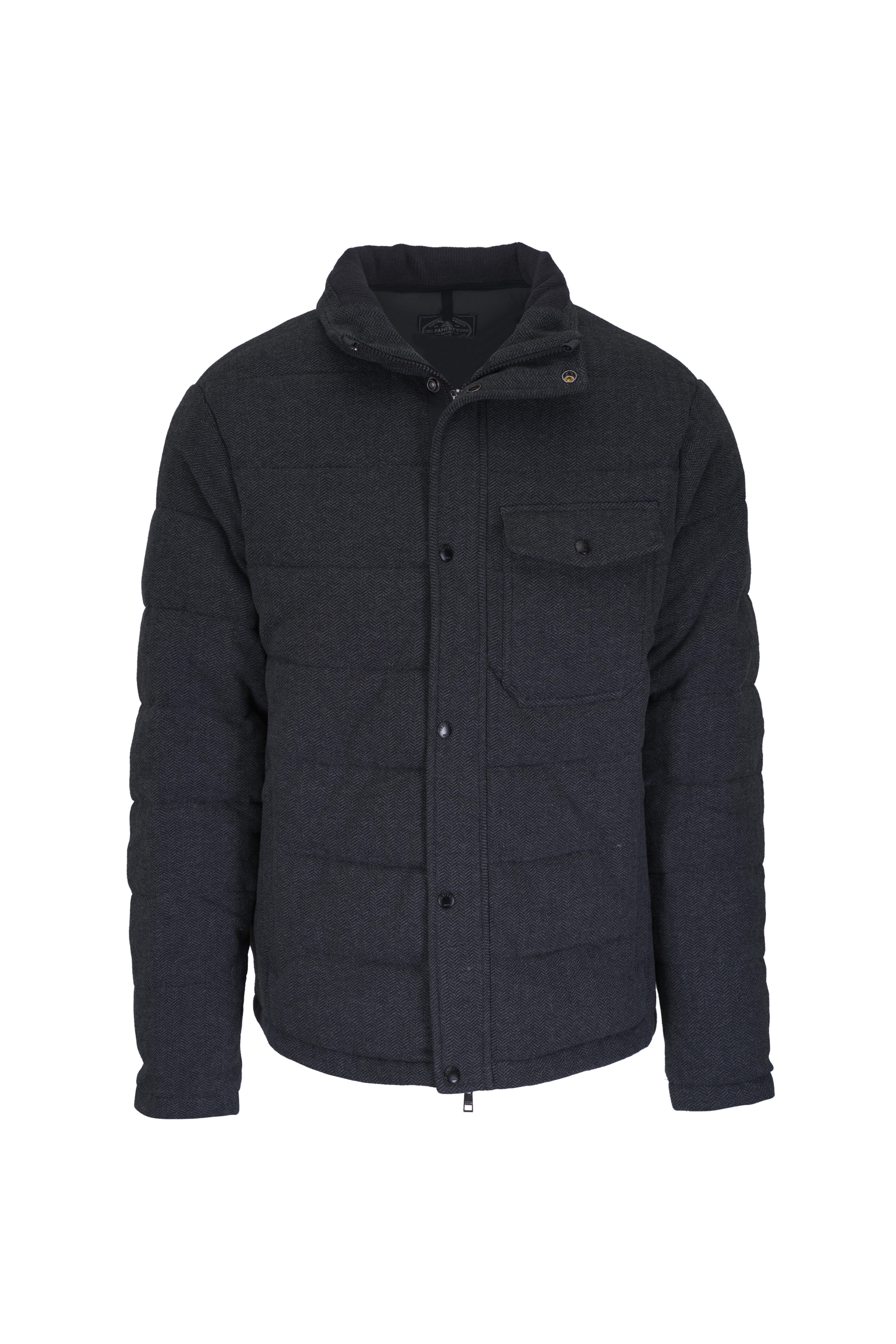 Stand collar with knit rib facing on interior side. Concealed two-way zip placket; snap button closure. Lower side pockets with zip closure; chest pocket with snap closure; four interior pockets. Quilted with Thermore® insulation. Imported. Color: Dark Steel Charcoal Herringbone. Approximately 28" shoulder to hem. Relaxed fit. 60% organic cotton, 40% recycled polyester. Machine wash.