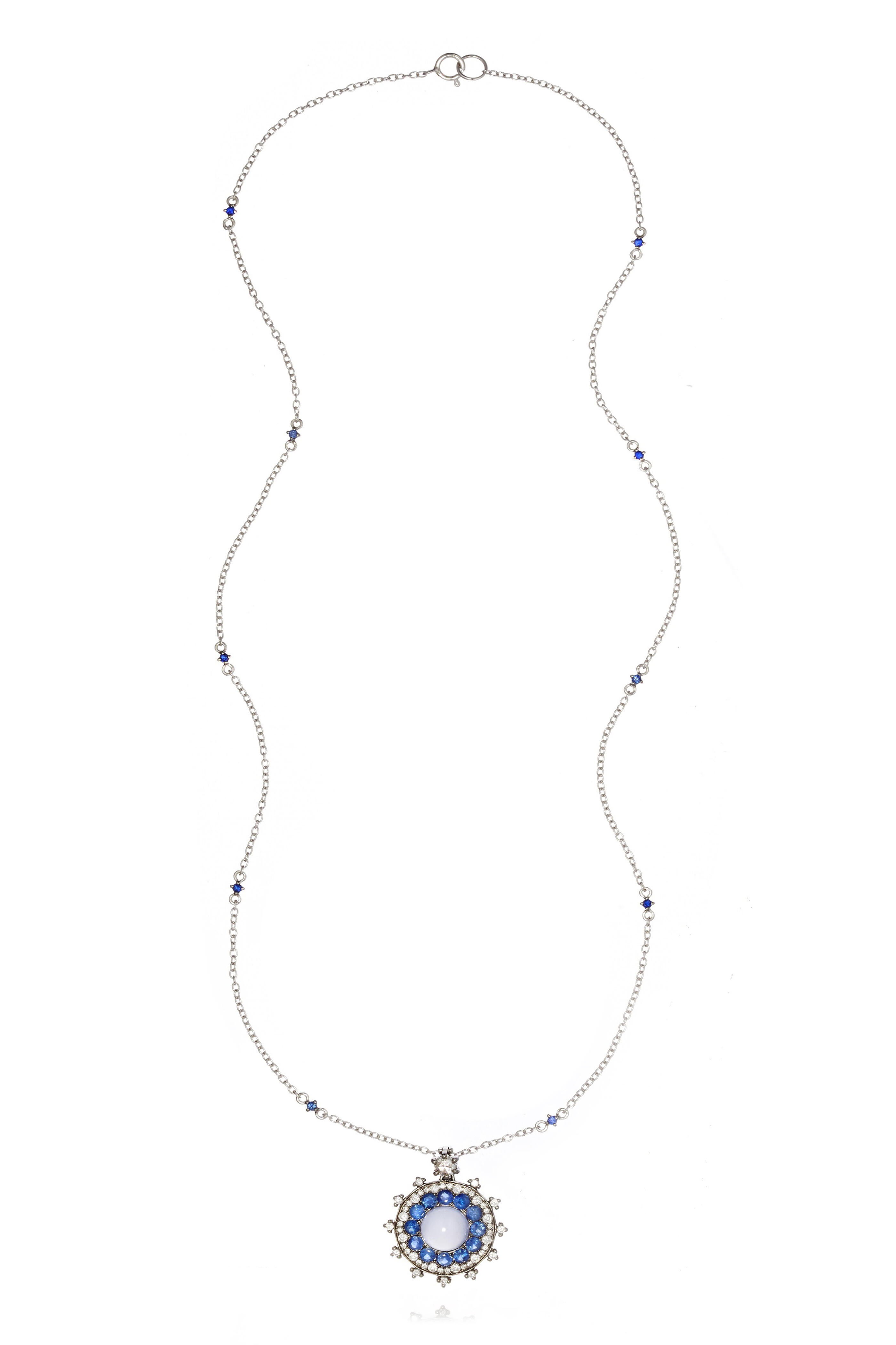 18k White Gold. 1.80 ct Chalcedony. 1.80 ct Blue Sapphire. 0.525 ct Diamond.