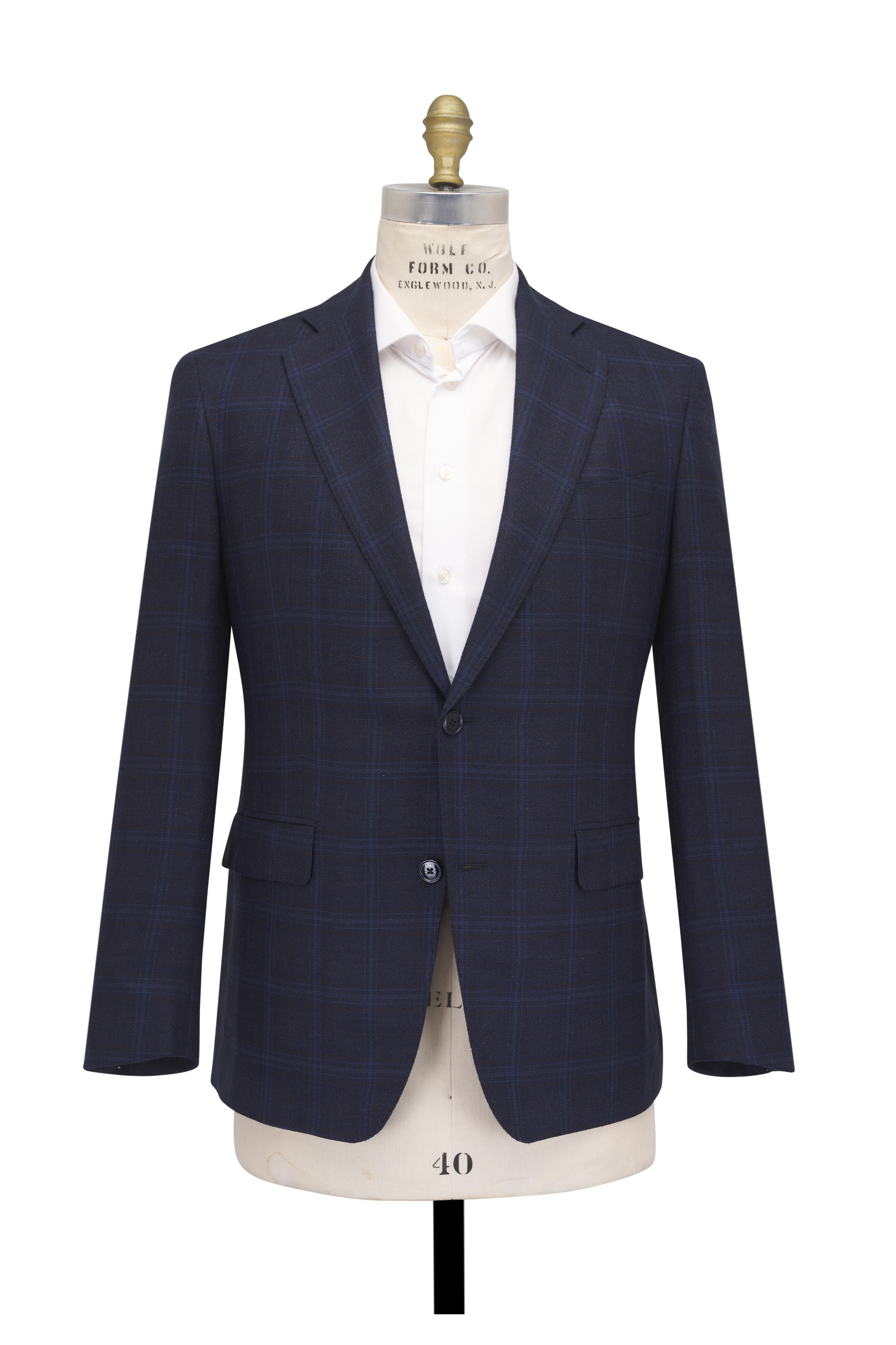 Notched lapels. Front two button closure. Lower flap pockets; chest welt pocket. Double vent. Imported. Shoulder to hem 30" (size 42 R). 55% Silk, 45% wool: fully lined. Dry clean.