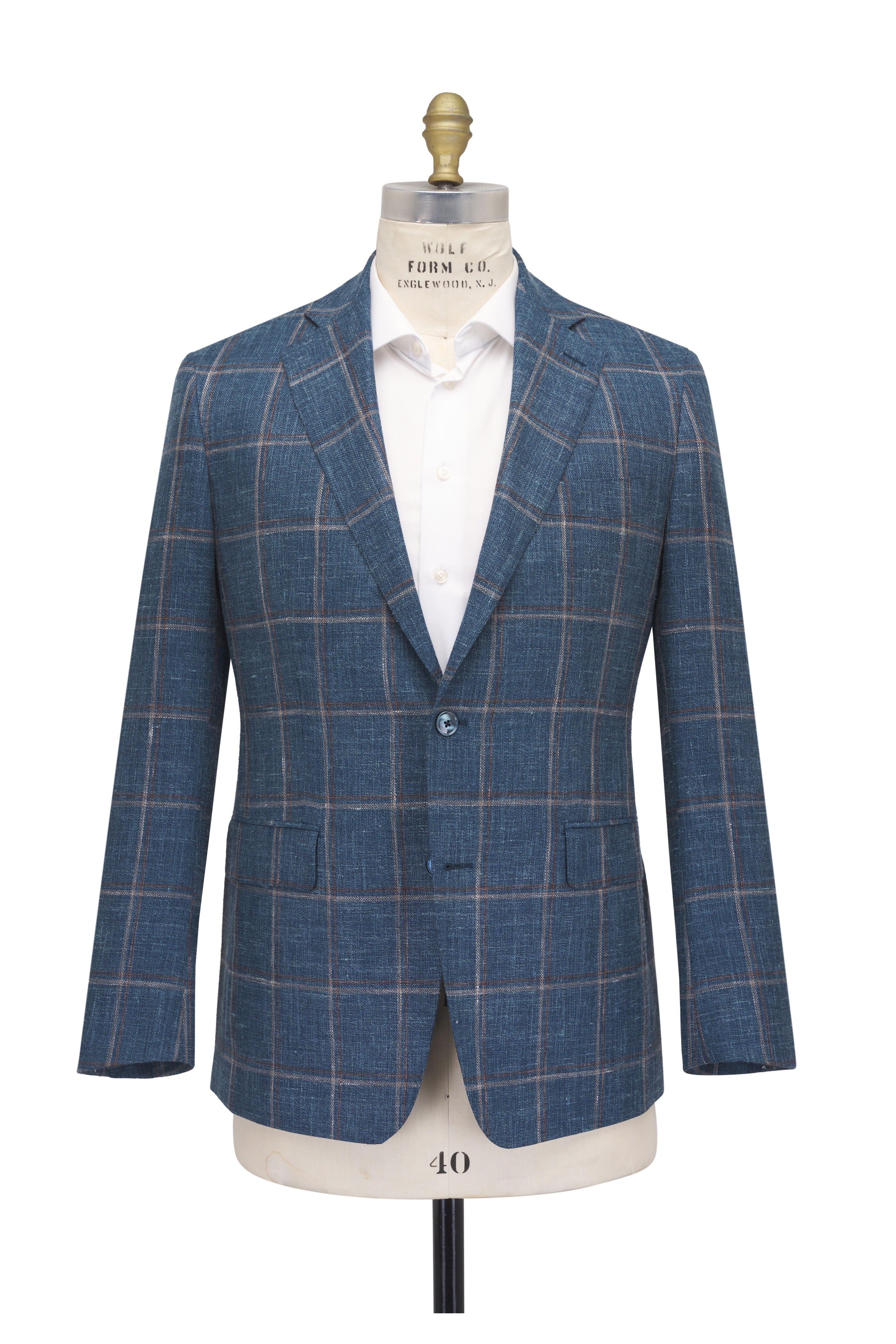 Notched lapels. Front two button closure. Lower flap pockets; chest welt pocket. Double vent. Imported. Shoulder to hem 30" (size 42 R). 69% Wool, 16% silk, 13% linen, 2% polyamide: fully lined. Dry clean.