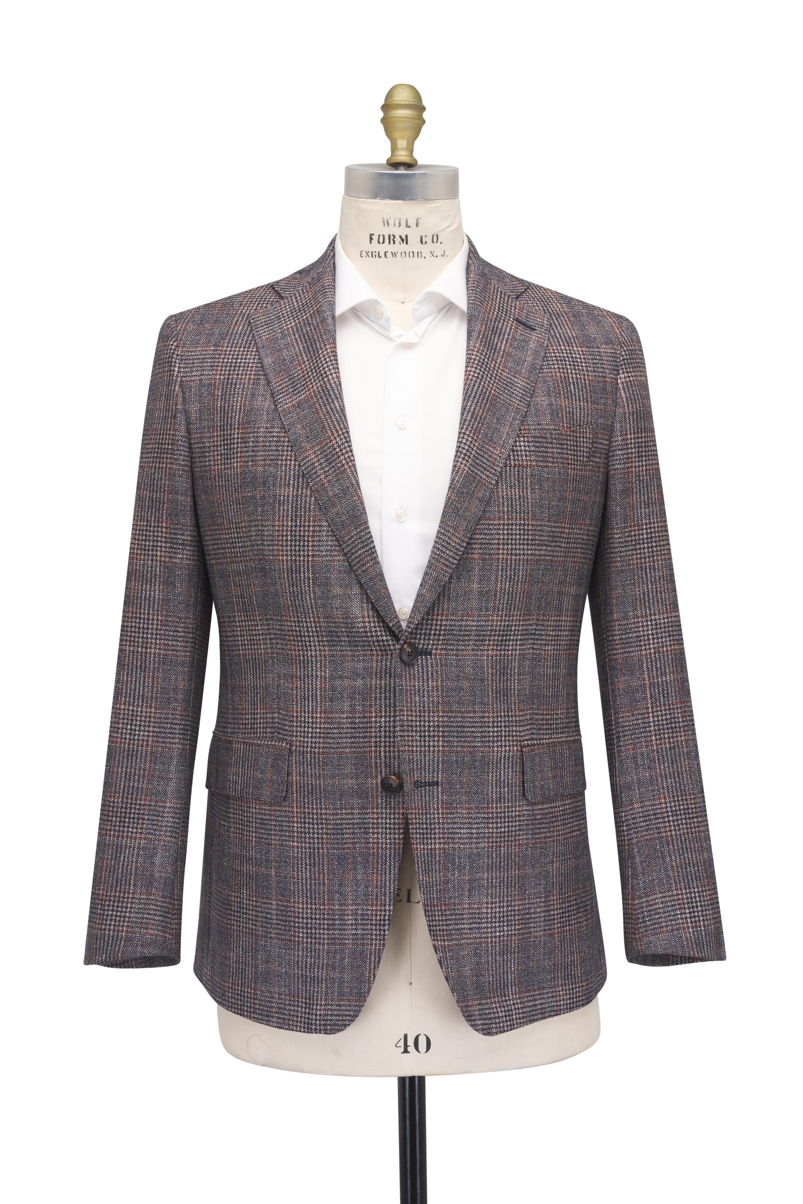 Notched lapels. Front two button closure. Lower flap pockets; chest welt pocket. Double vent. Imported. Shoulder to hem 30" (size 42 R). 86% Wool, 10% silk, 4% cashmere; fully lined. Dry clean.