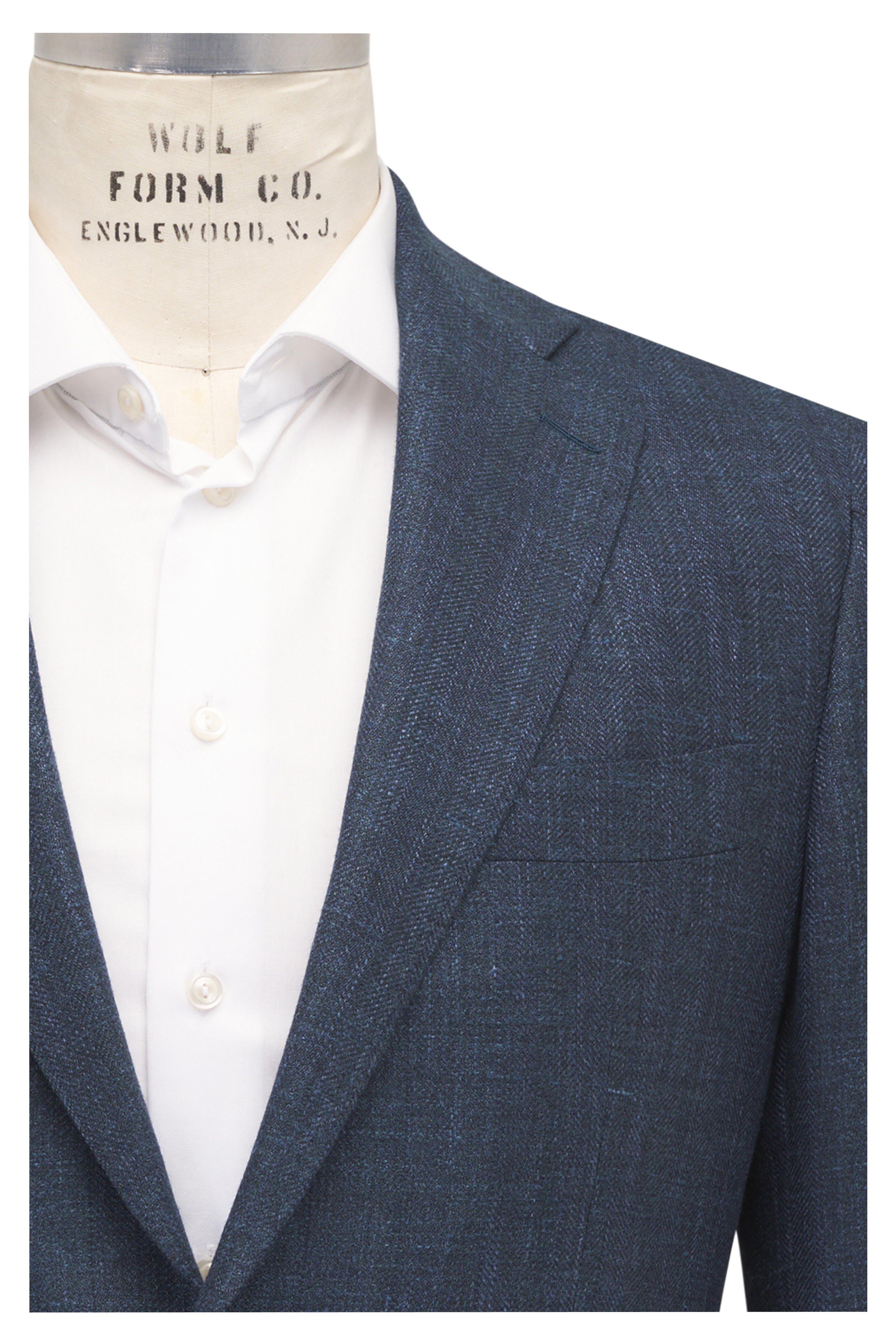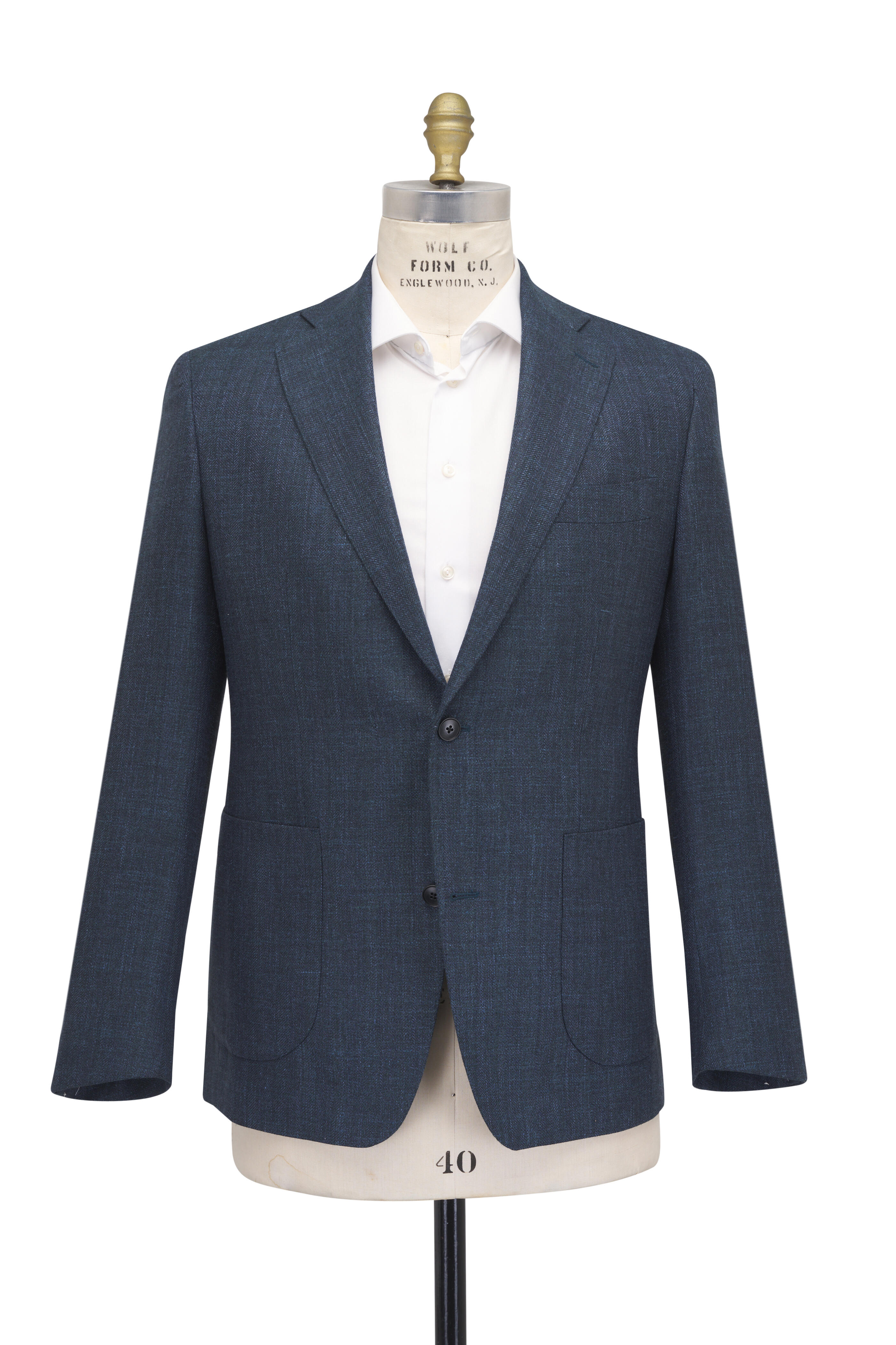 Notched lapels. Double button front closure. Chest welt pocket; lower patch pockets. Double vent. Made in Italy. Shoulder to hem 29" (size 42 R). 68% wool, 18% silk, 14% linen; partially lined. Dry clean.