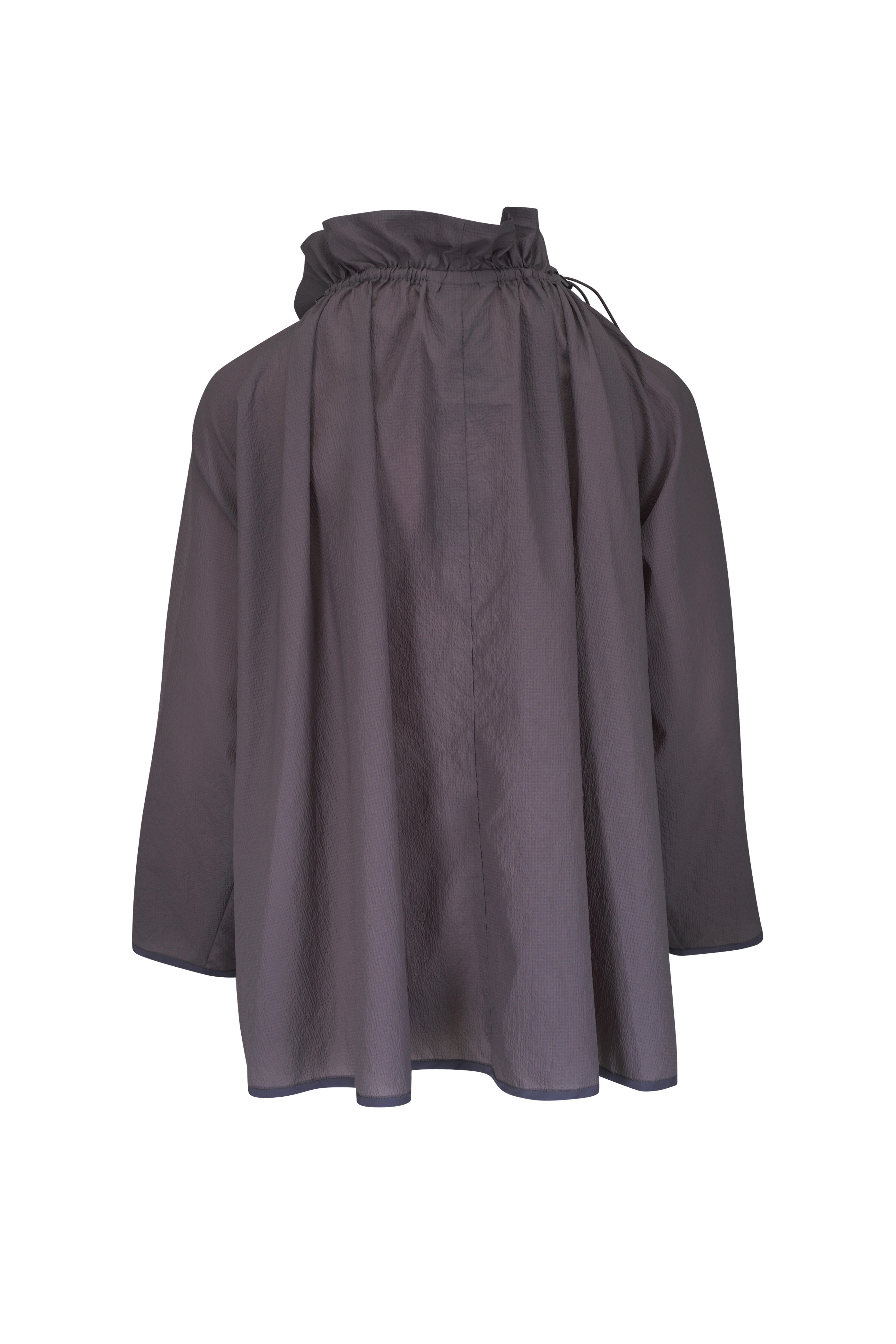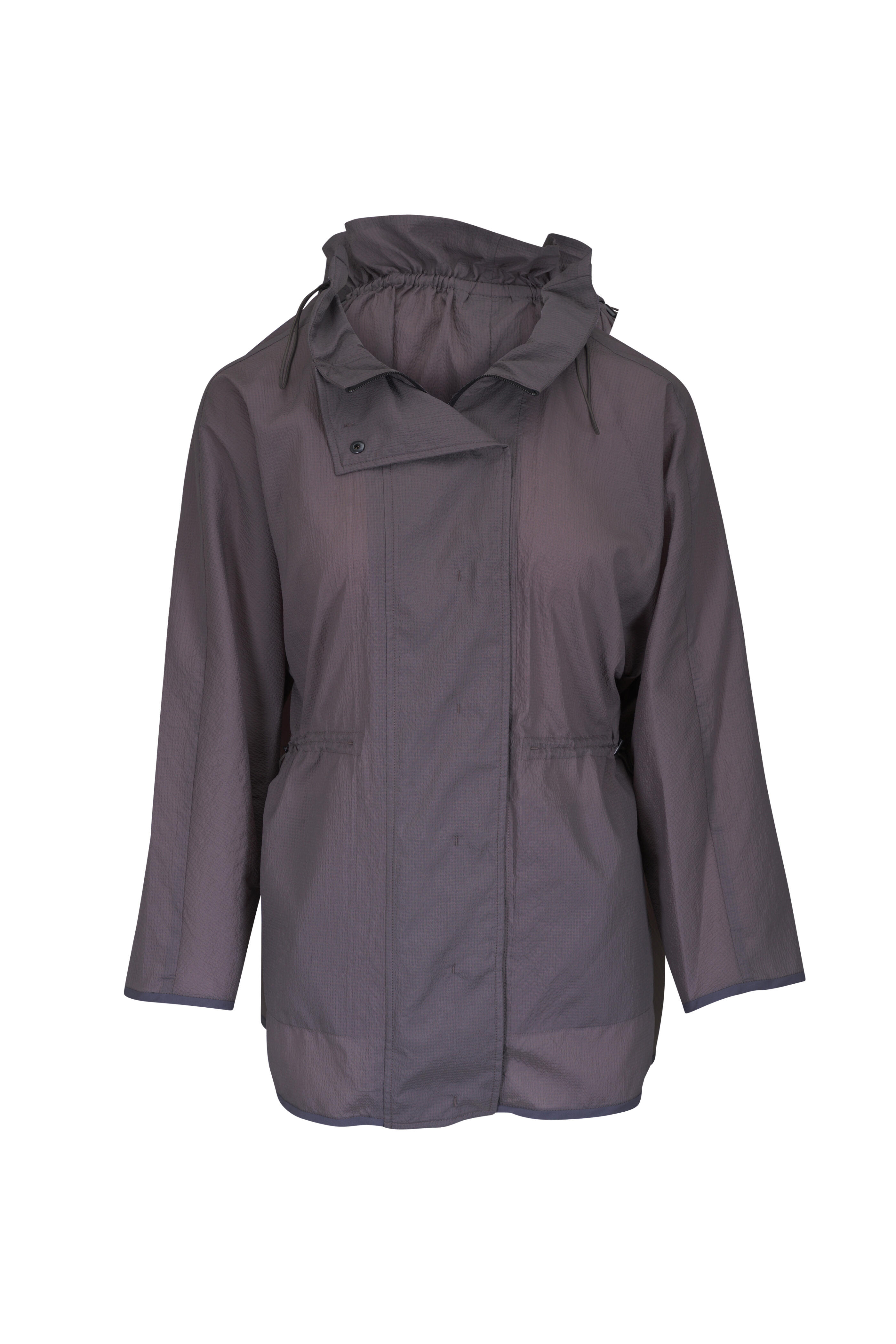 Stand collar. Concealed front two-way zip and snap plackets. Side slip pockets. Elastic cinch at waist and neck. Water repellent. Made in the USA. Approximately 30" shoulder to hem (measurements taken from size S). 87% polyester, 13% nylon. Dry clean.