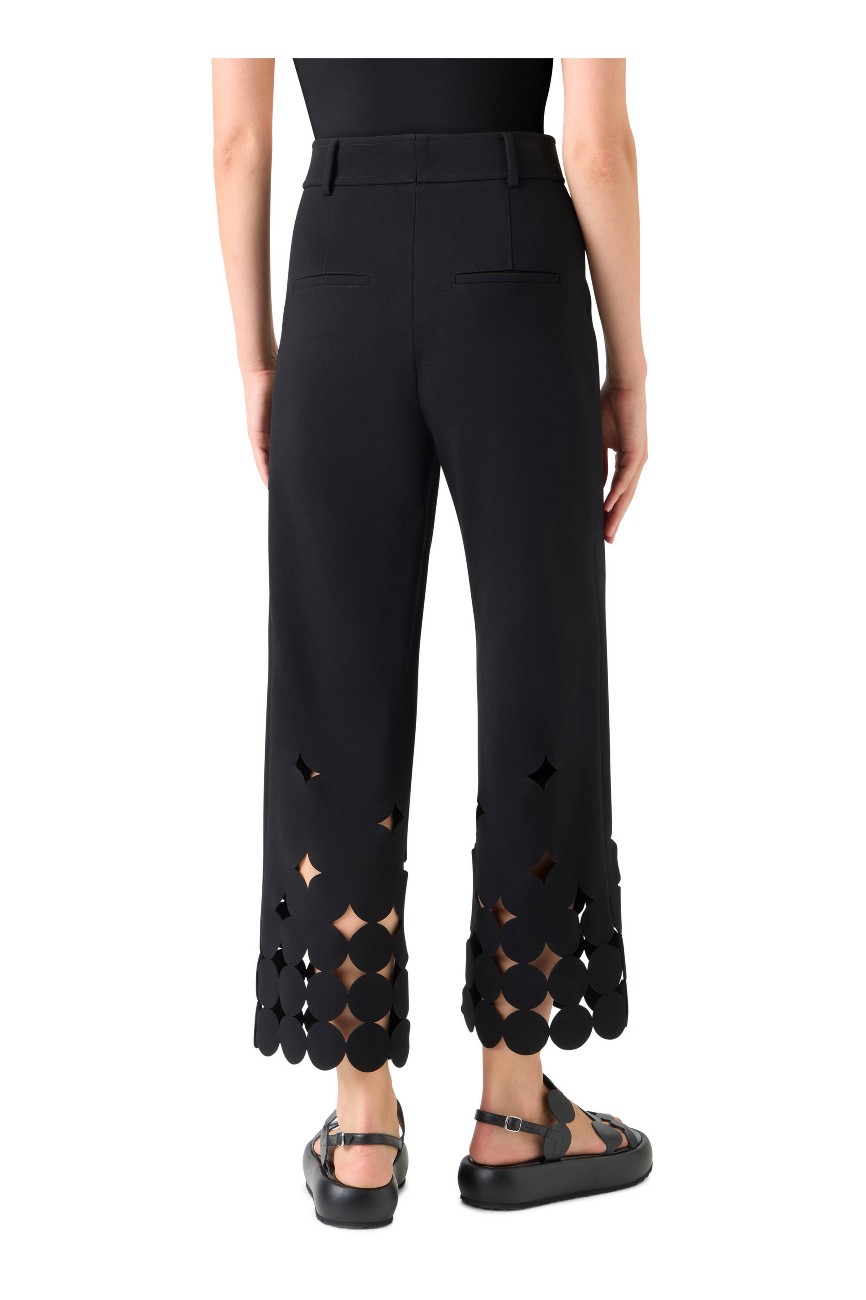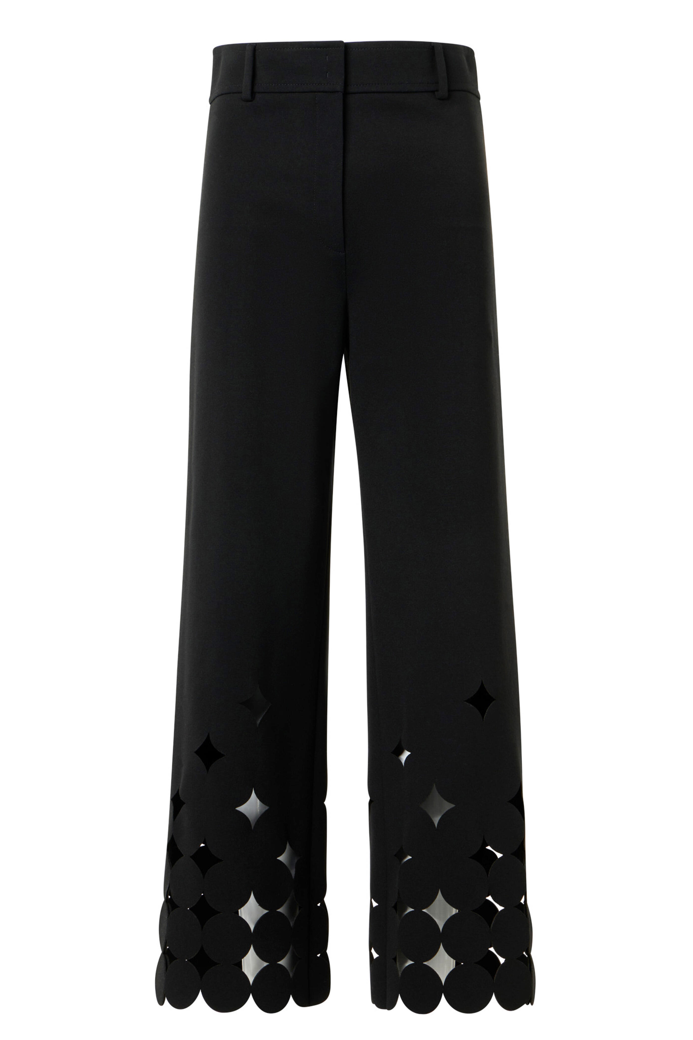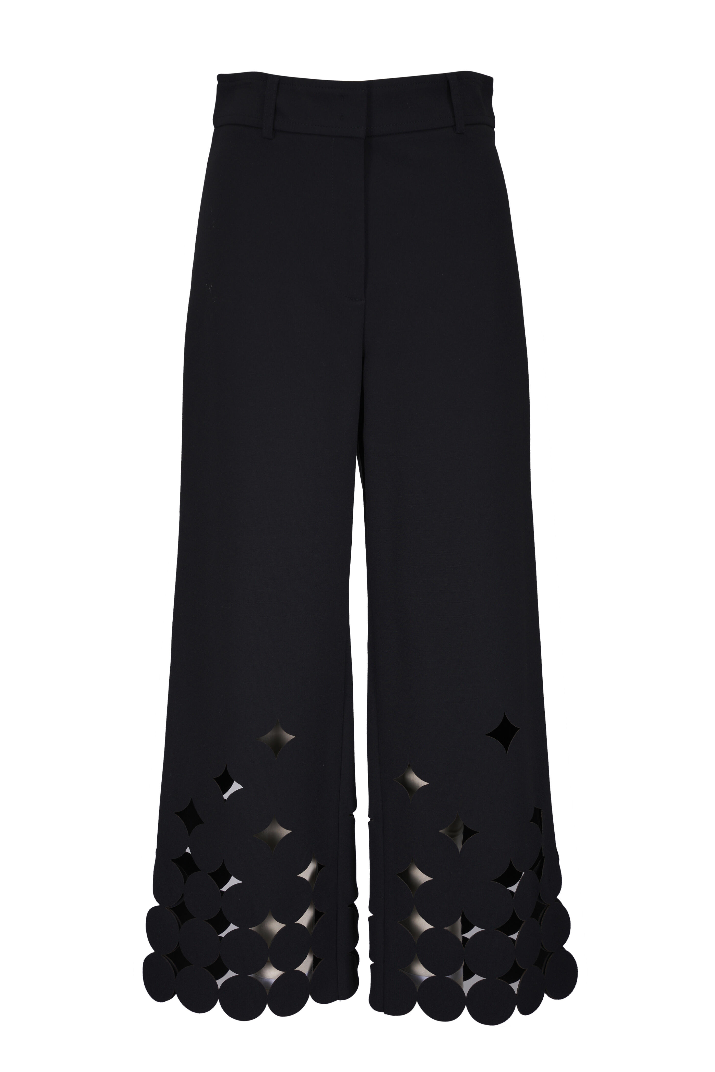 Zip fly; hook and bar closure. Belt loops. Cut-out dot hem. Imported with Italian fabric. 27" inseam (size 4). 69% viscose, 25% nylon, 6% elastane. Dry clean.