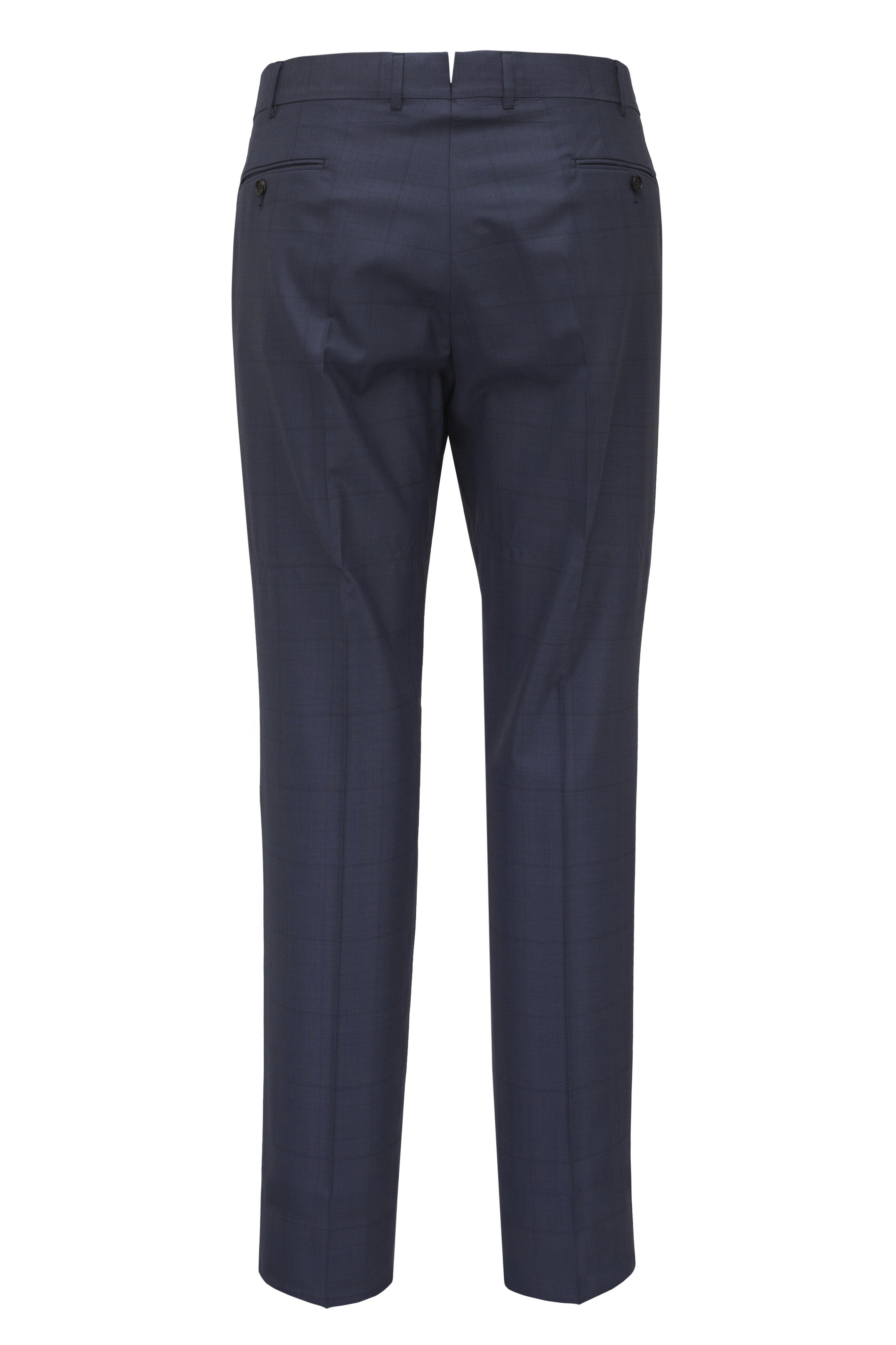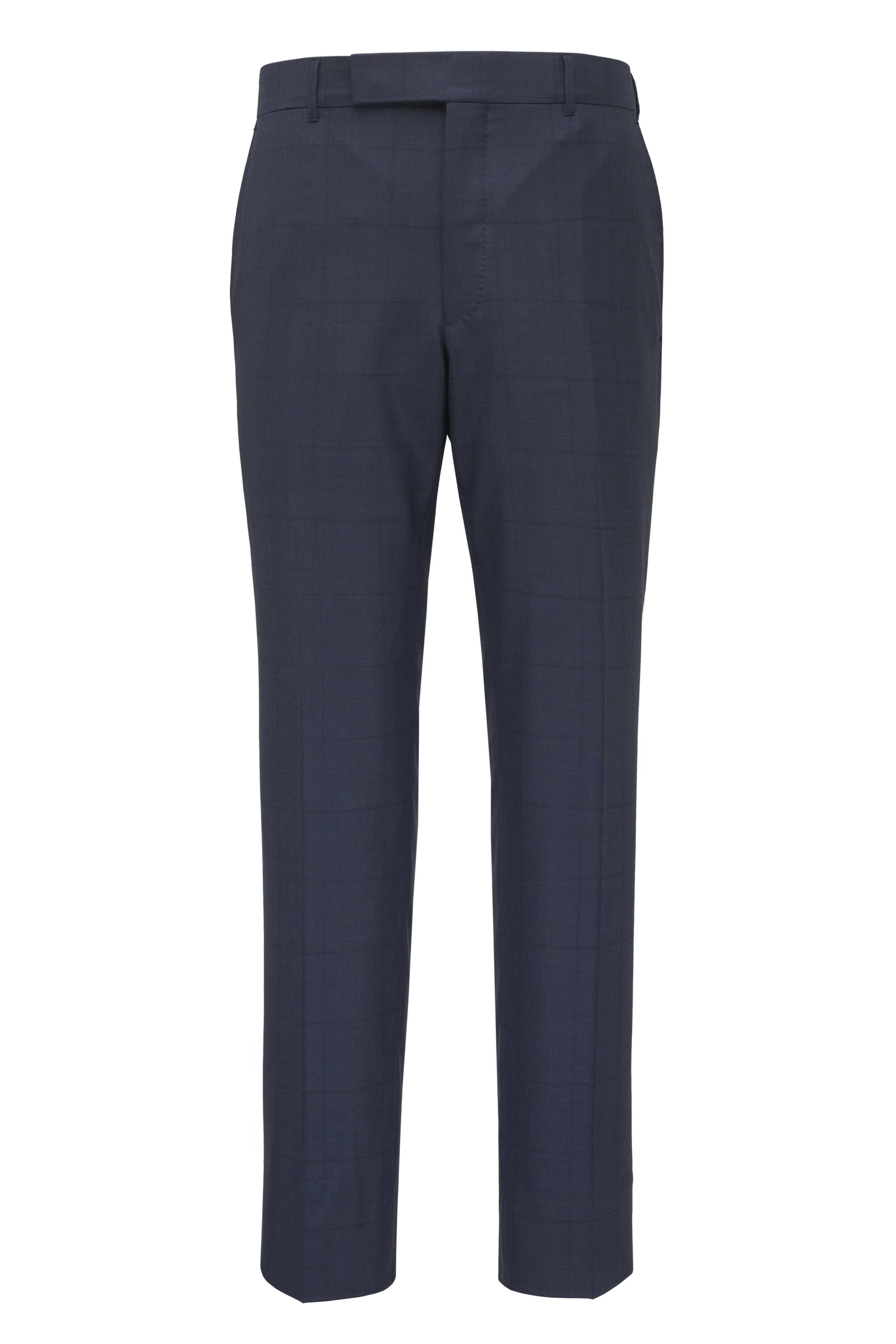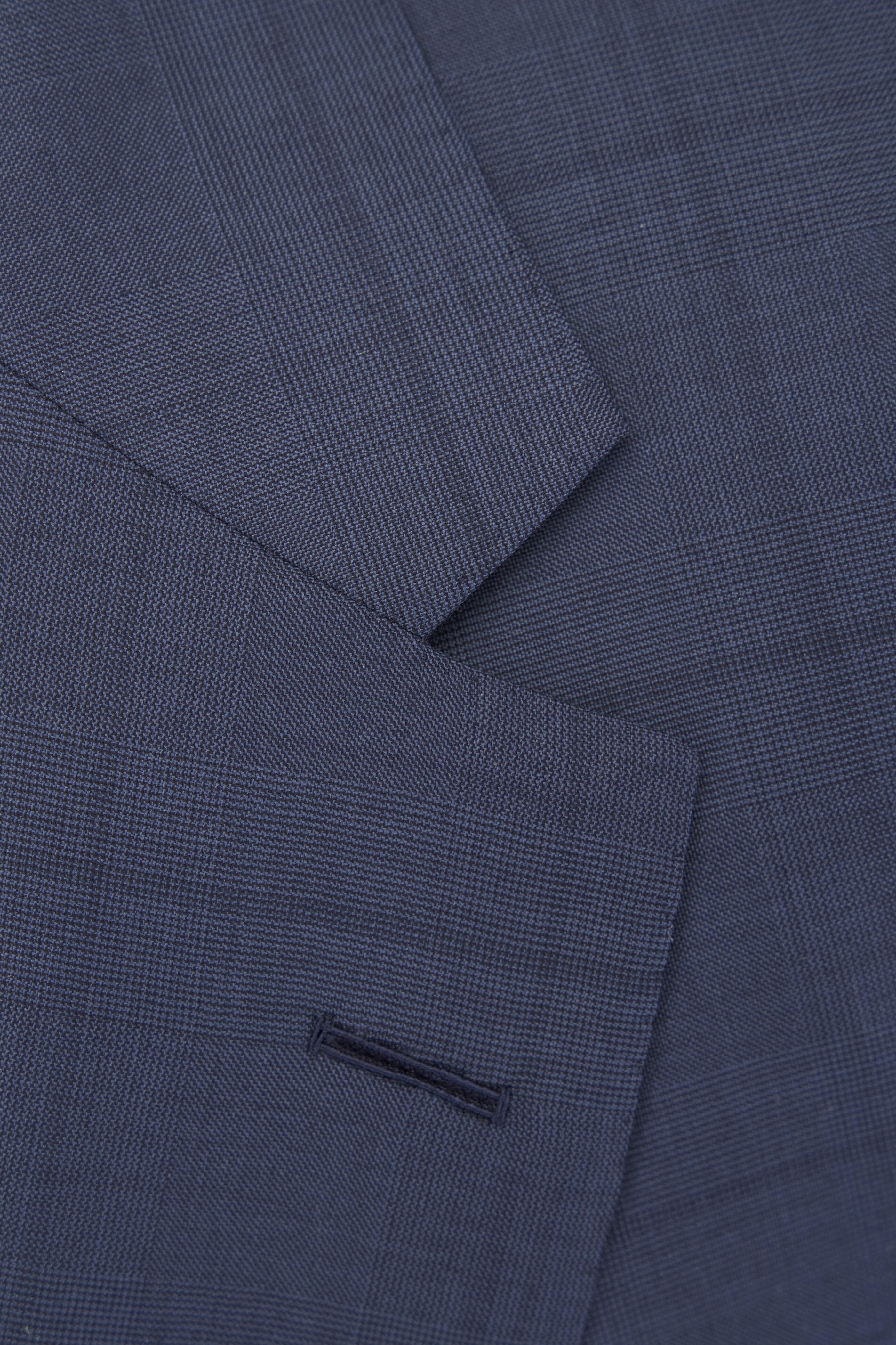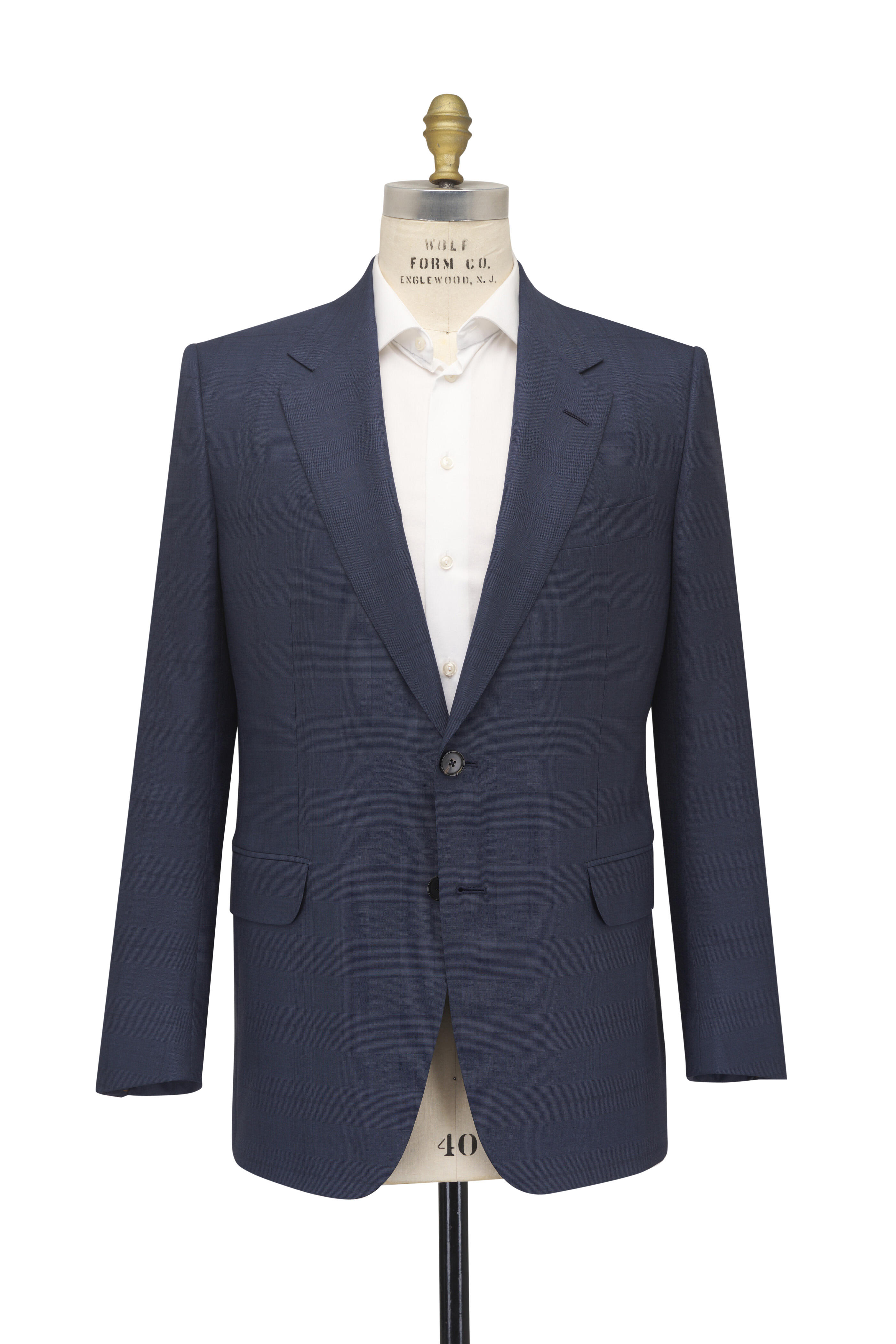 Made in Spain. Jacket: Notched lapels. Two-button closure. Lower flap pockets; chest welt pocket. Double vent. Pants: Banded waist; belt loops. Front slip pockets; coin pocket; back besom pockets. Unfinished hem. 100% wool; fully lined. Dry clean.