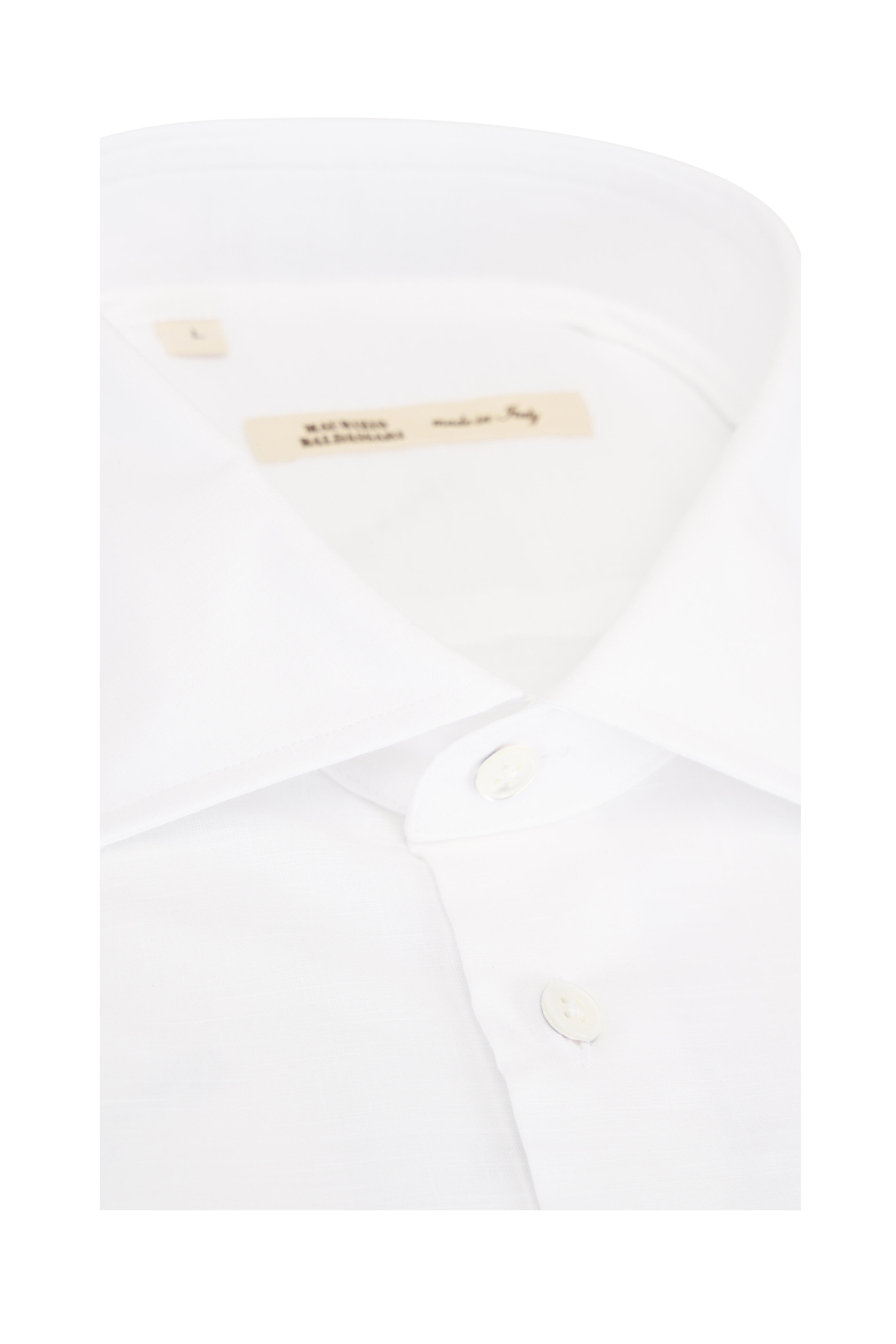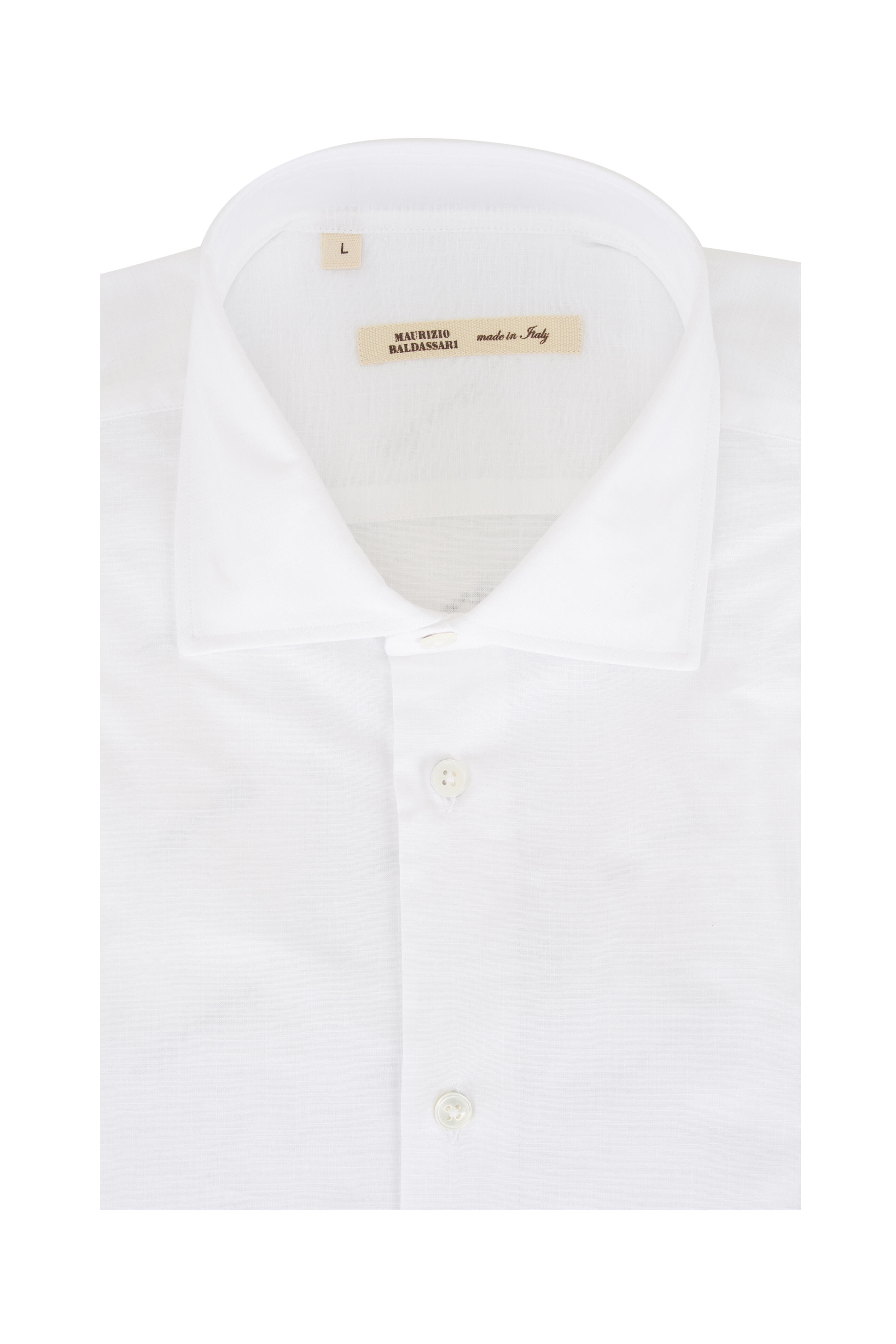 Spread collar. French front button placket. Single button mitered cuffs. Made in Italy. 100% cotton. Machine wash.