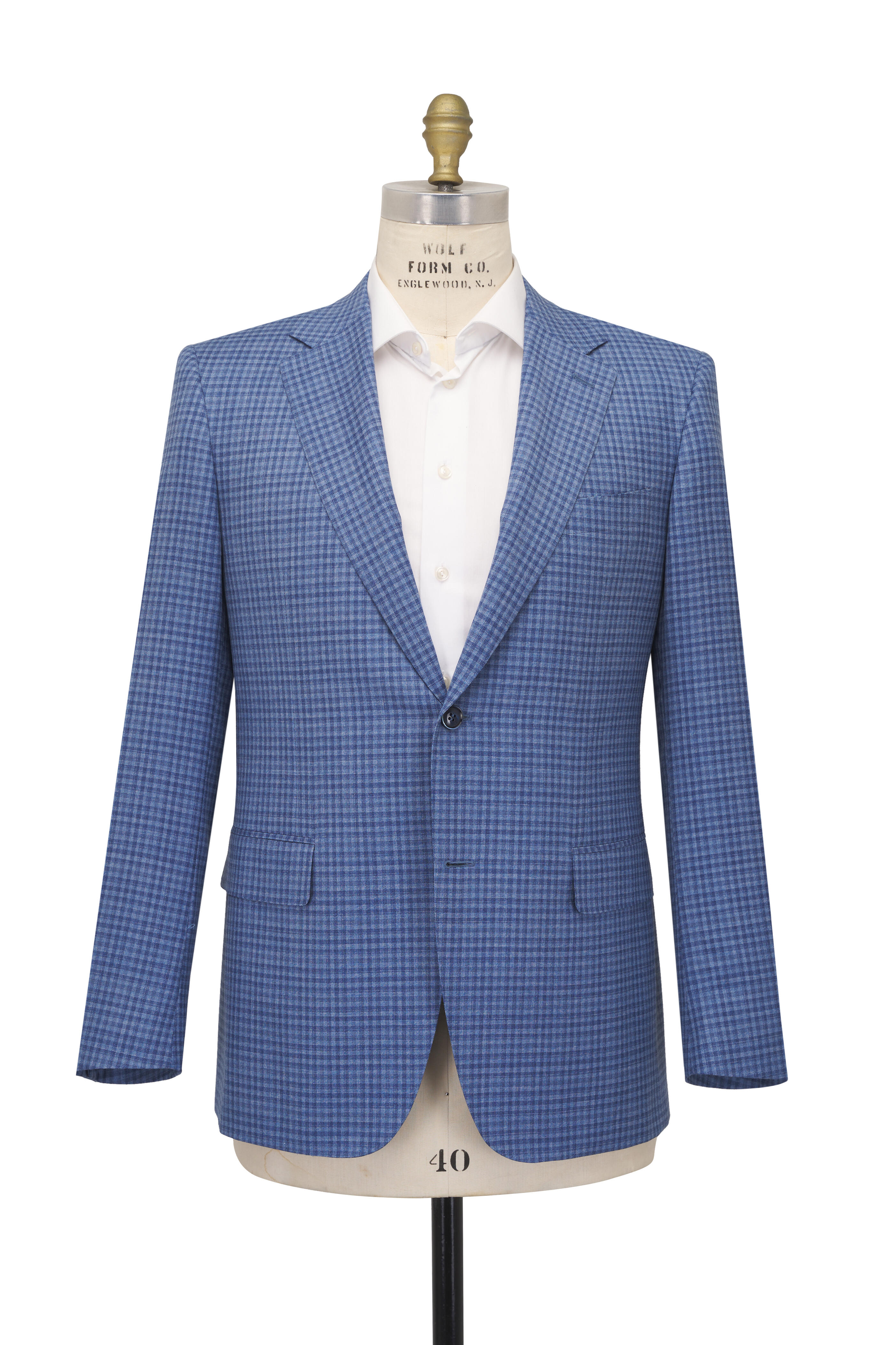 Notched lapels. Front two-button closure. Chest welt pocket; lower flap pockets; interior slip pockets. Unfinished cuffs. Double vent. Made in Italy. 100% wool. Dry clean.