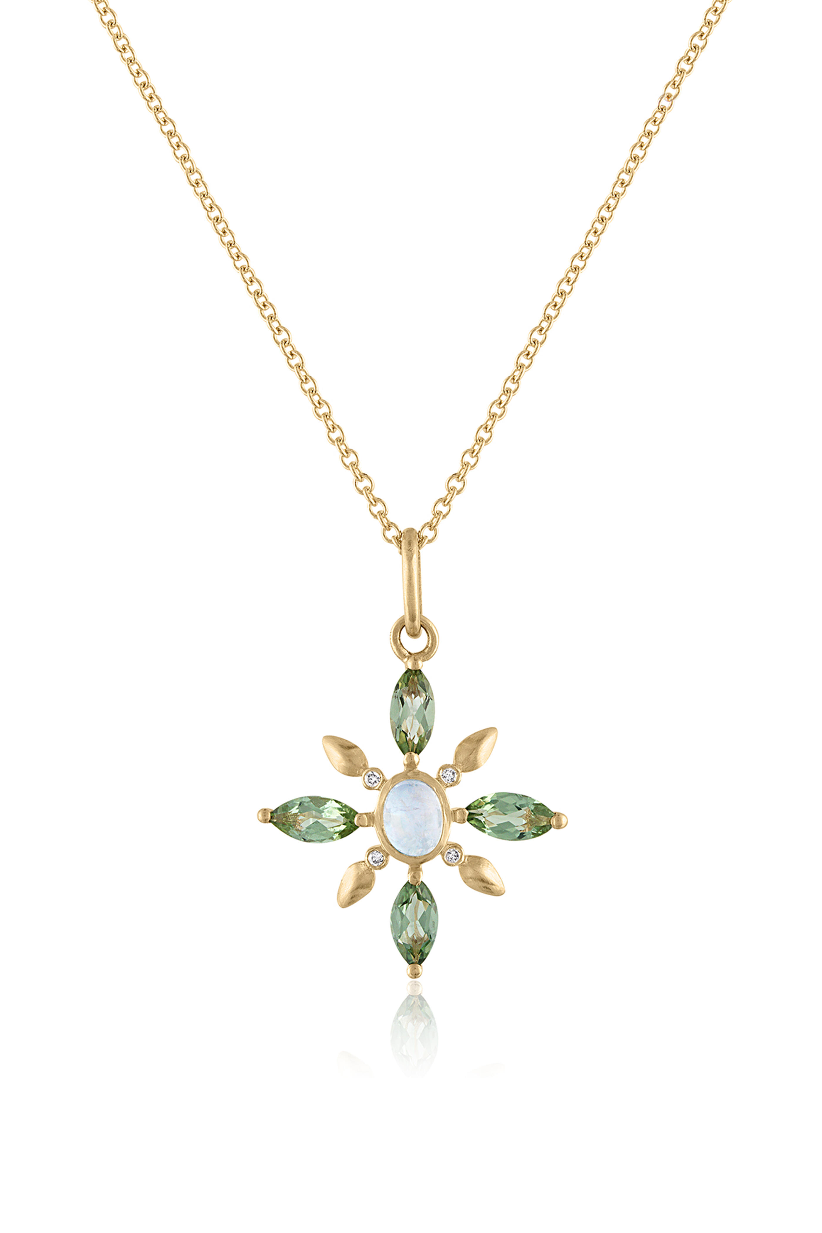 14k Yellow Gold. 1.71 ct Moonstone & Tourmaline. 0.03 ct Diamond.
