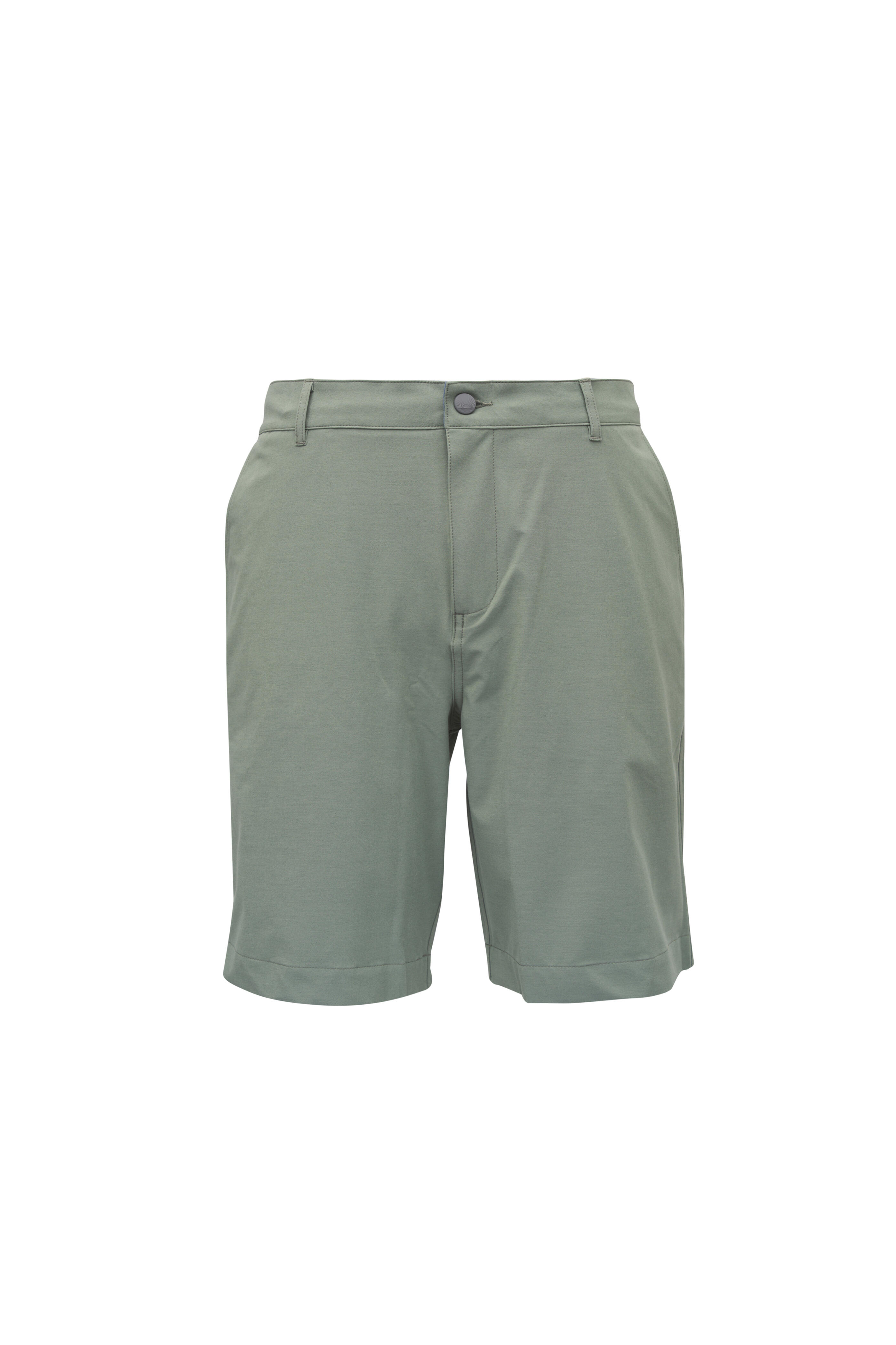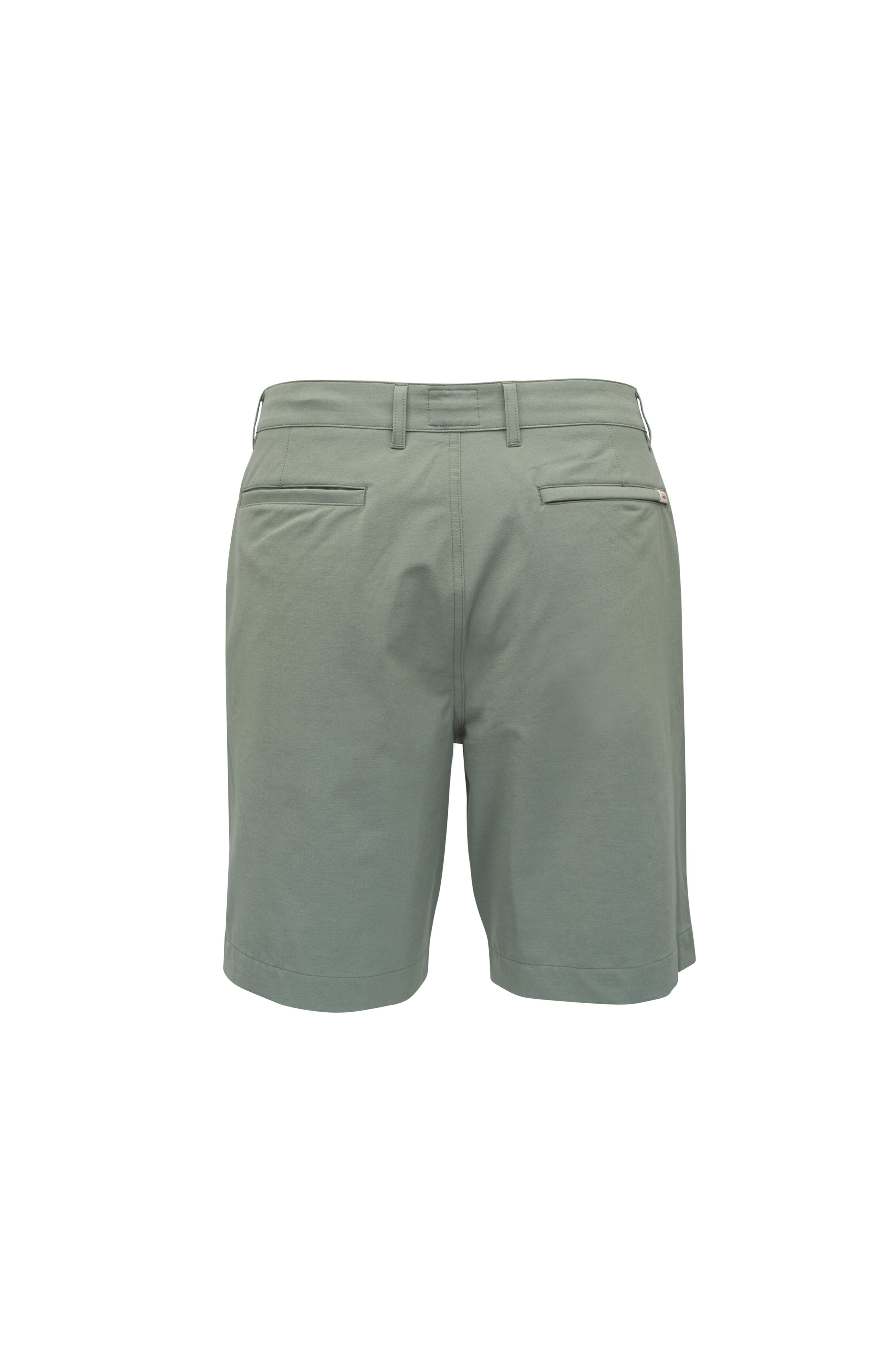Concealed drawstring waist; belt loops. Button closure; zip fly. Front slip pockets; one back concealed zip welt pocket. Imported. 9" inseam. 72% recycled polyester, 20% cotton, 8% spandex. Machine wash.
