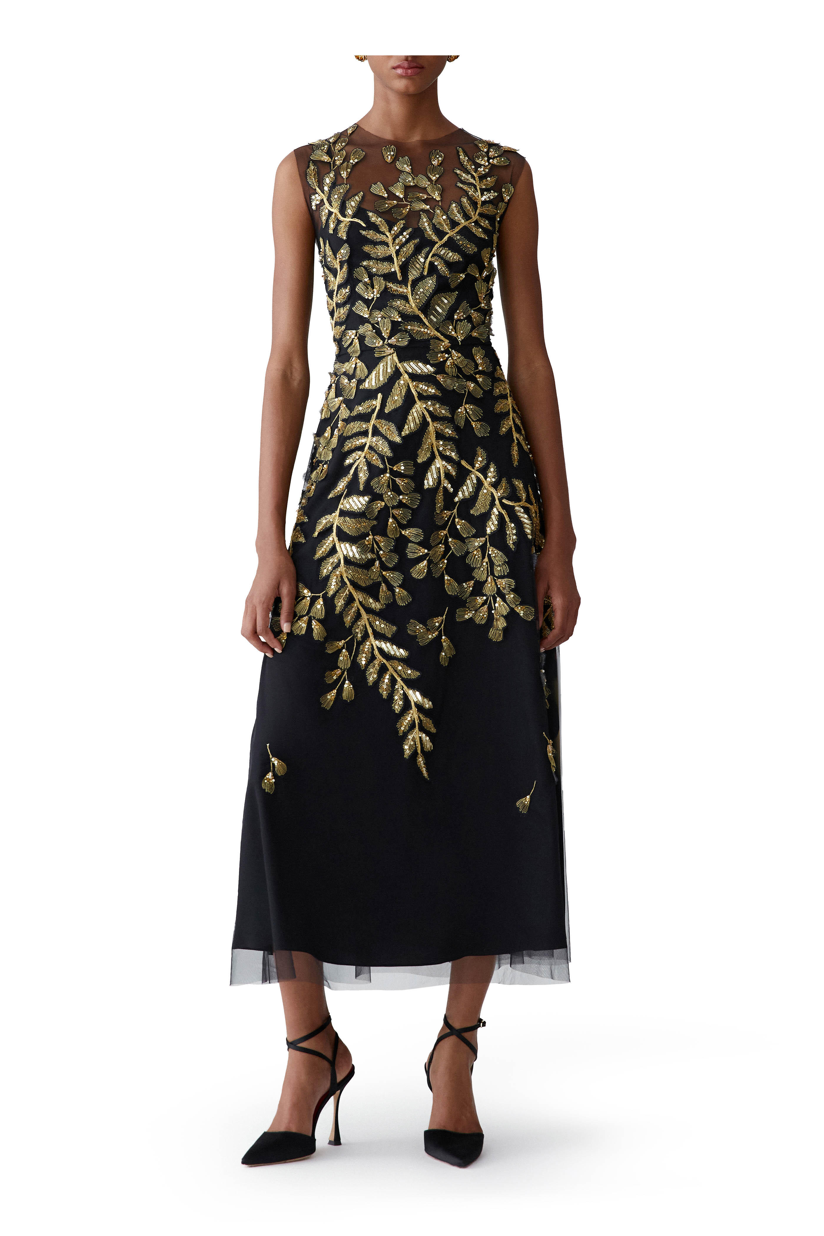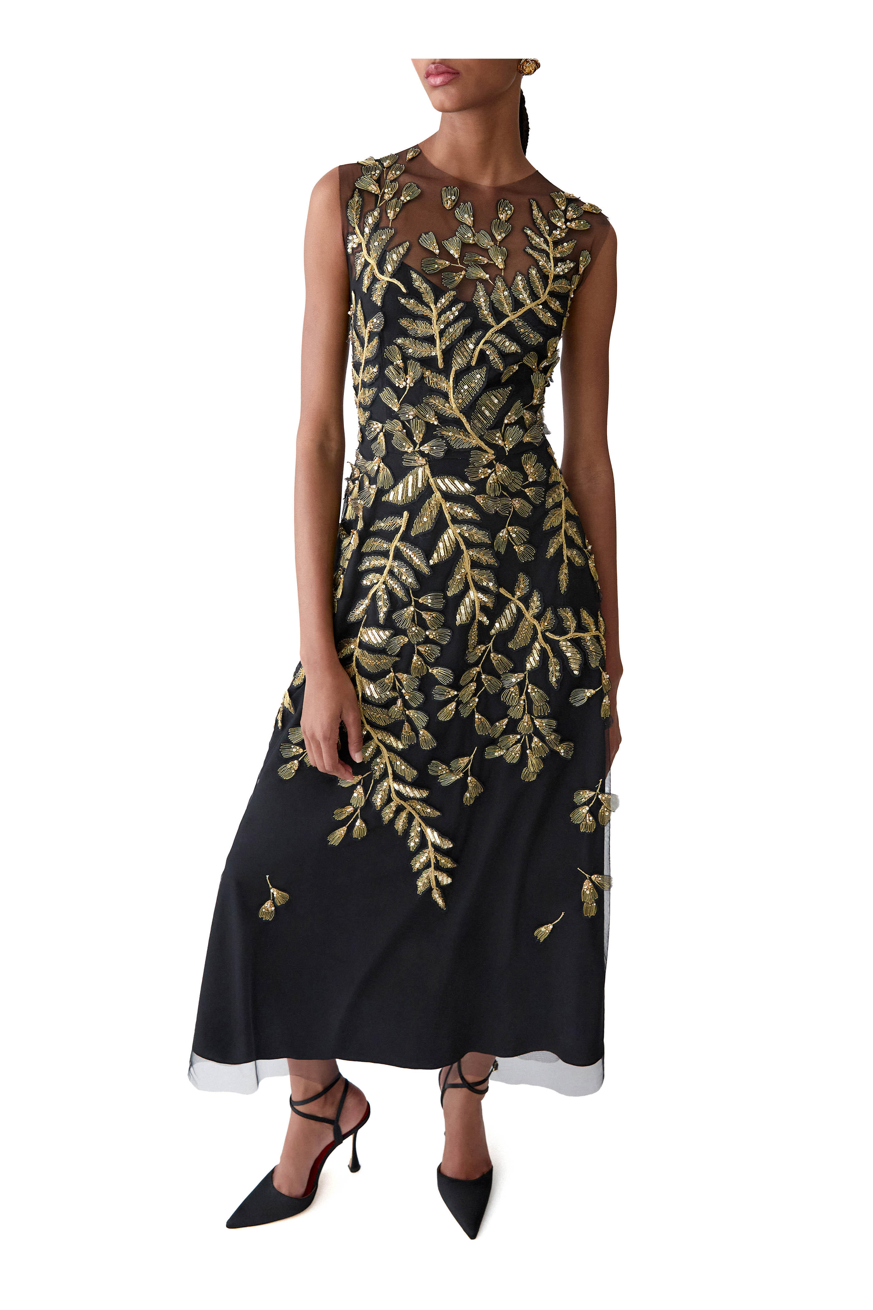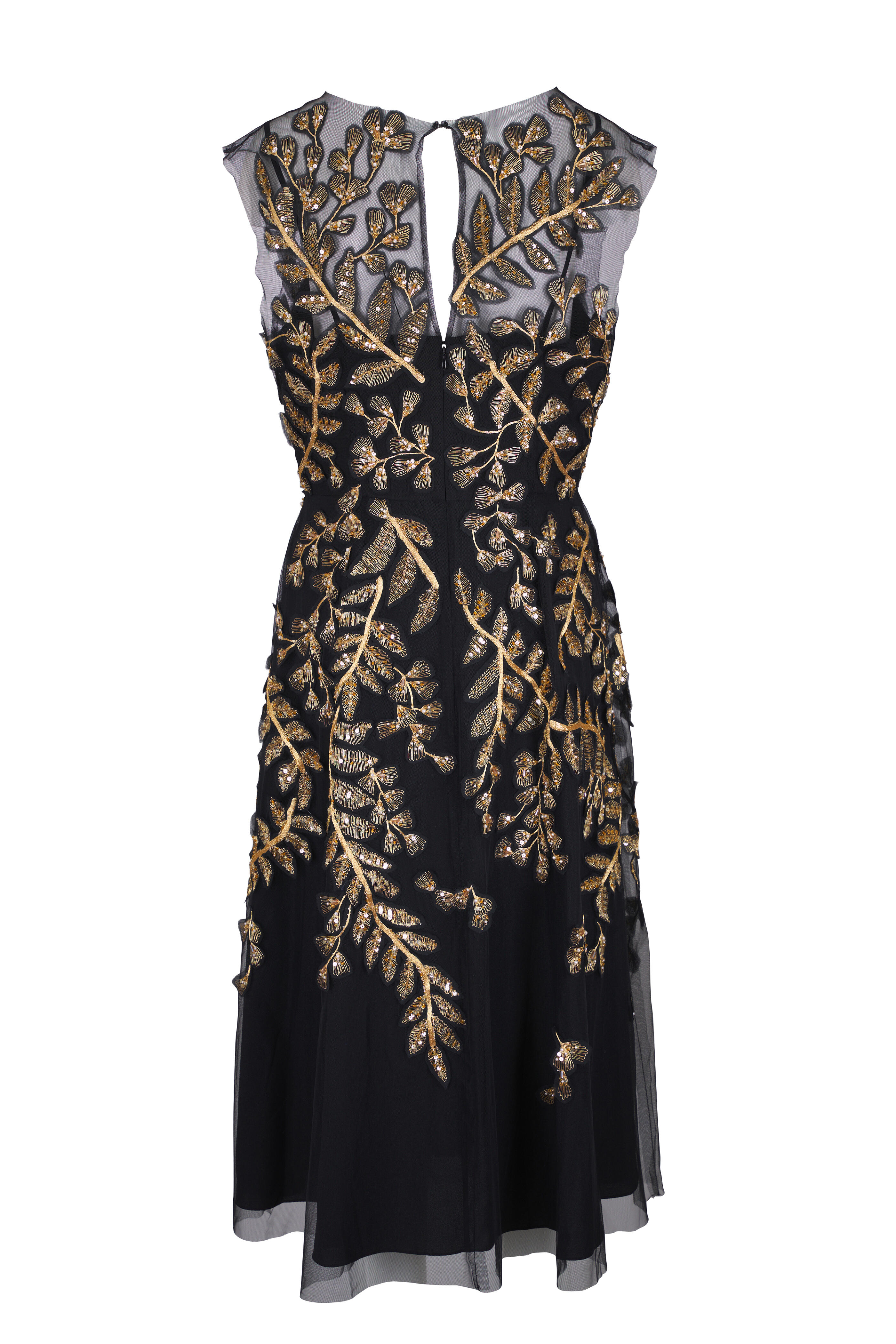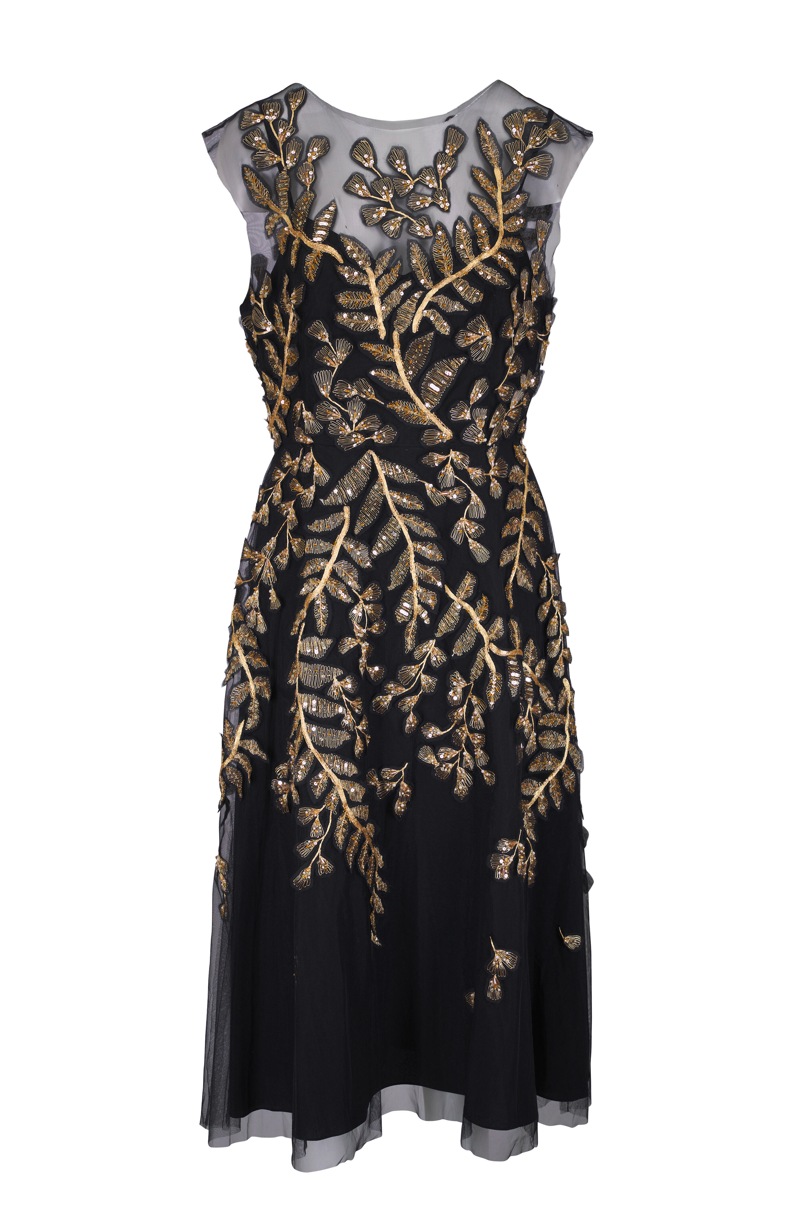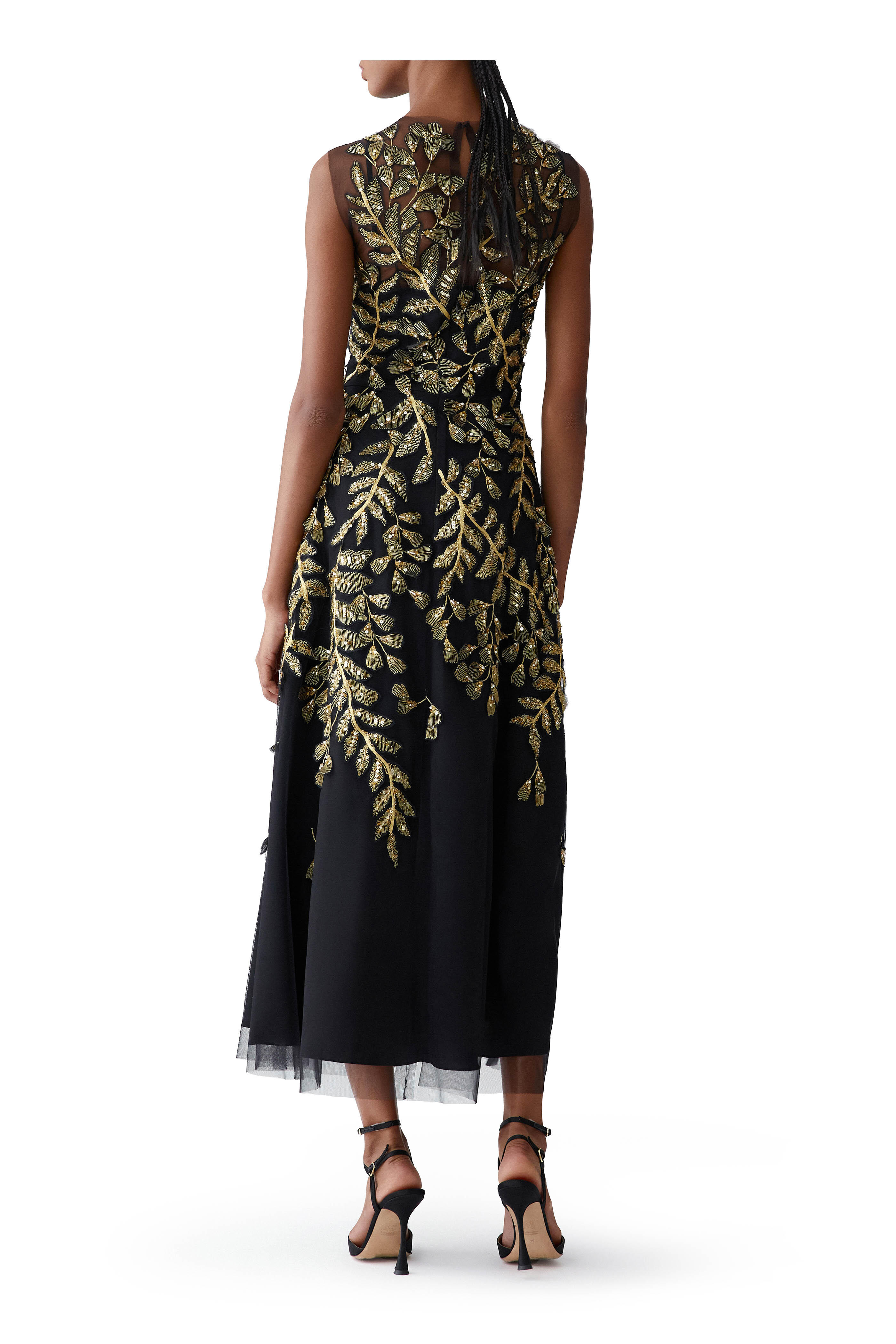 Black Leaf-Embroidered Embellished Tulle Dress
