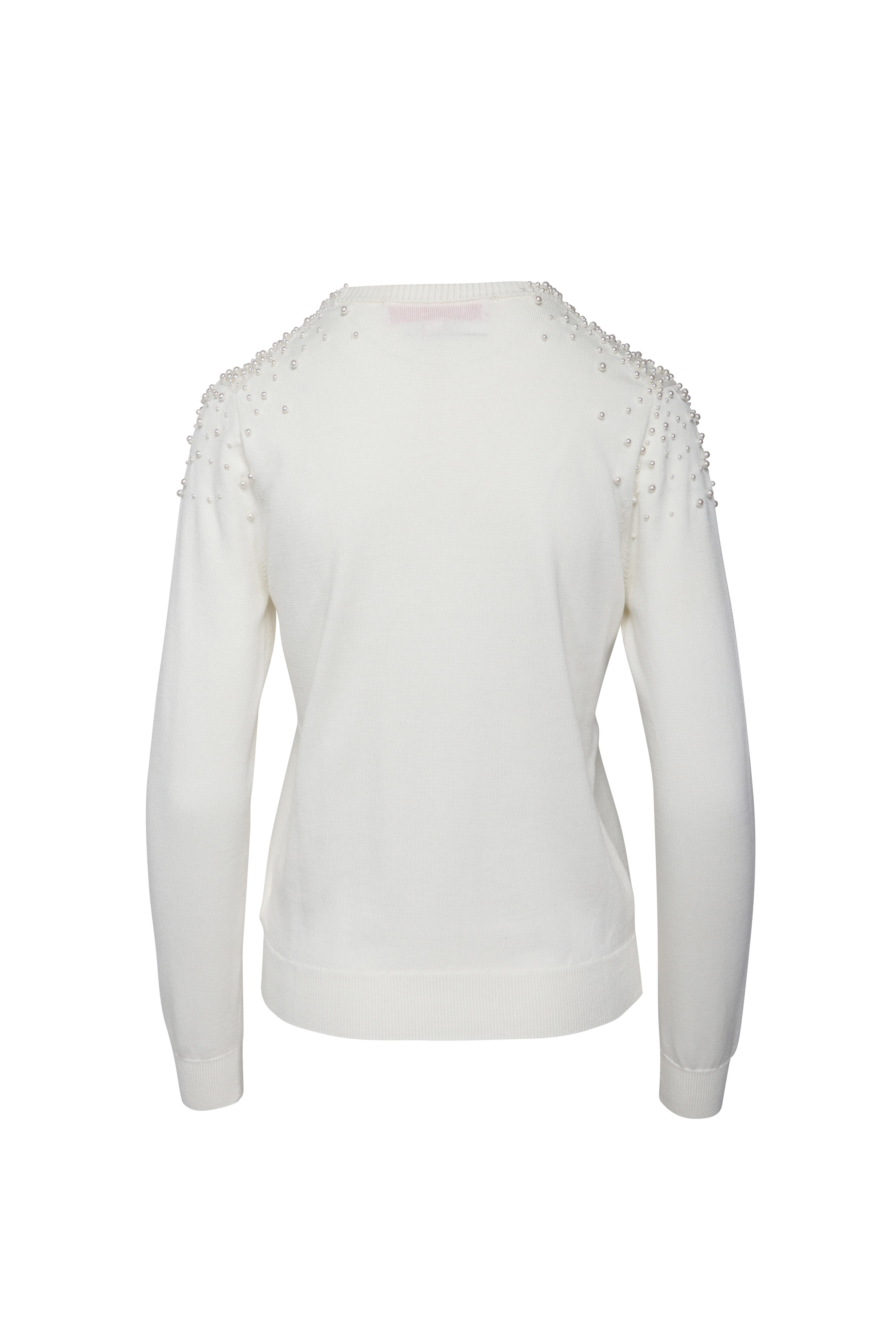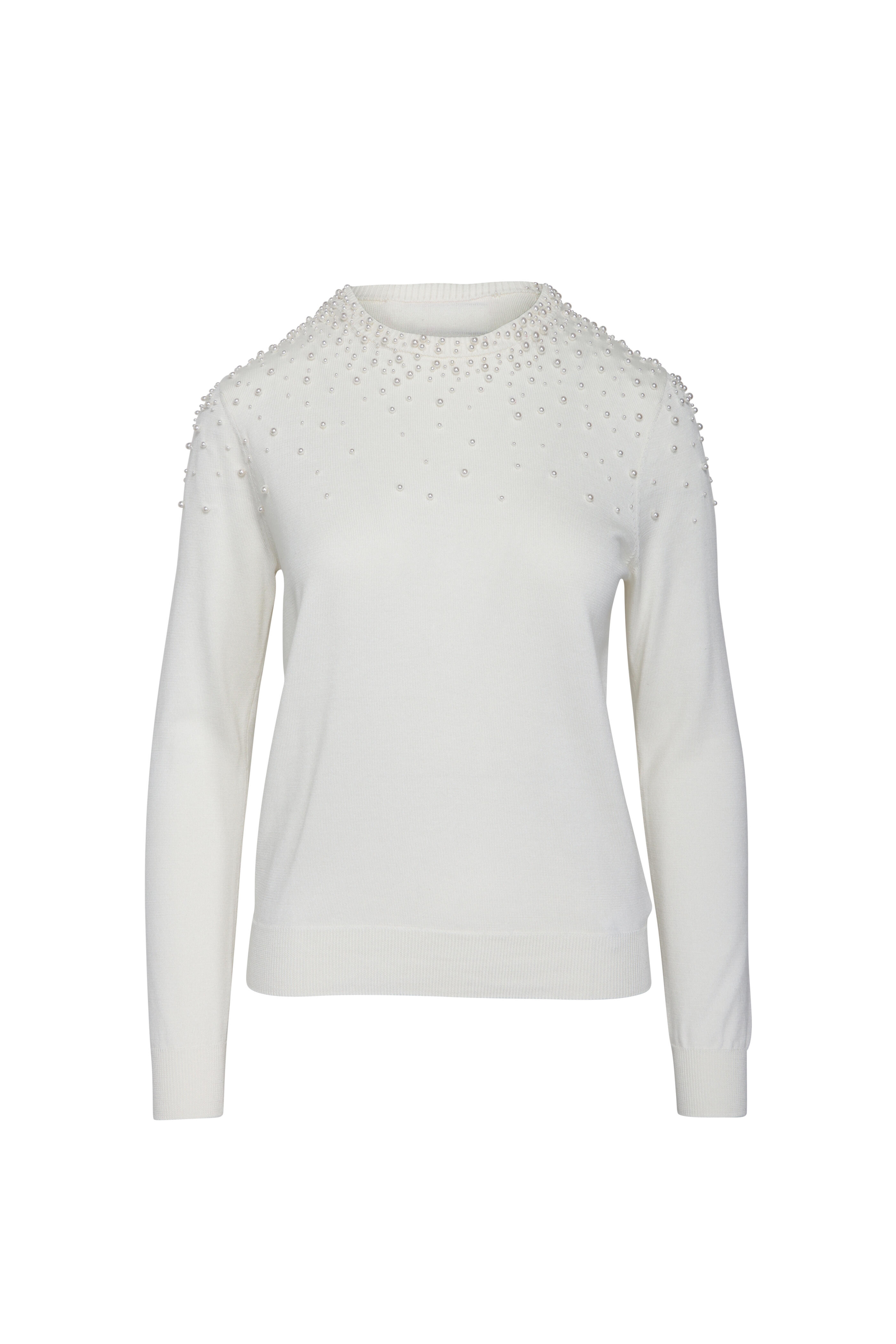 Crewneck. Long sleeves. Pearl embellishment throughout. Relaxed fit. Straight hem. Ribbed neck, cuffs, and hem. Imported. Bust 29.5” (US 2). Waist 23” (US 2). Hip 33.5” (US 2). 55% silk, 45% cotton. Dry clean.