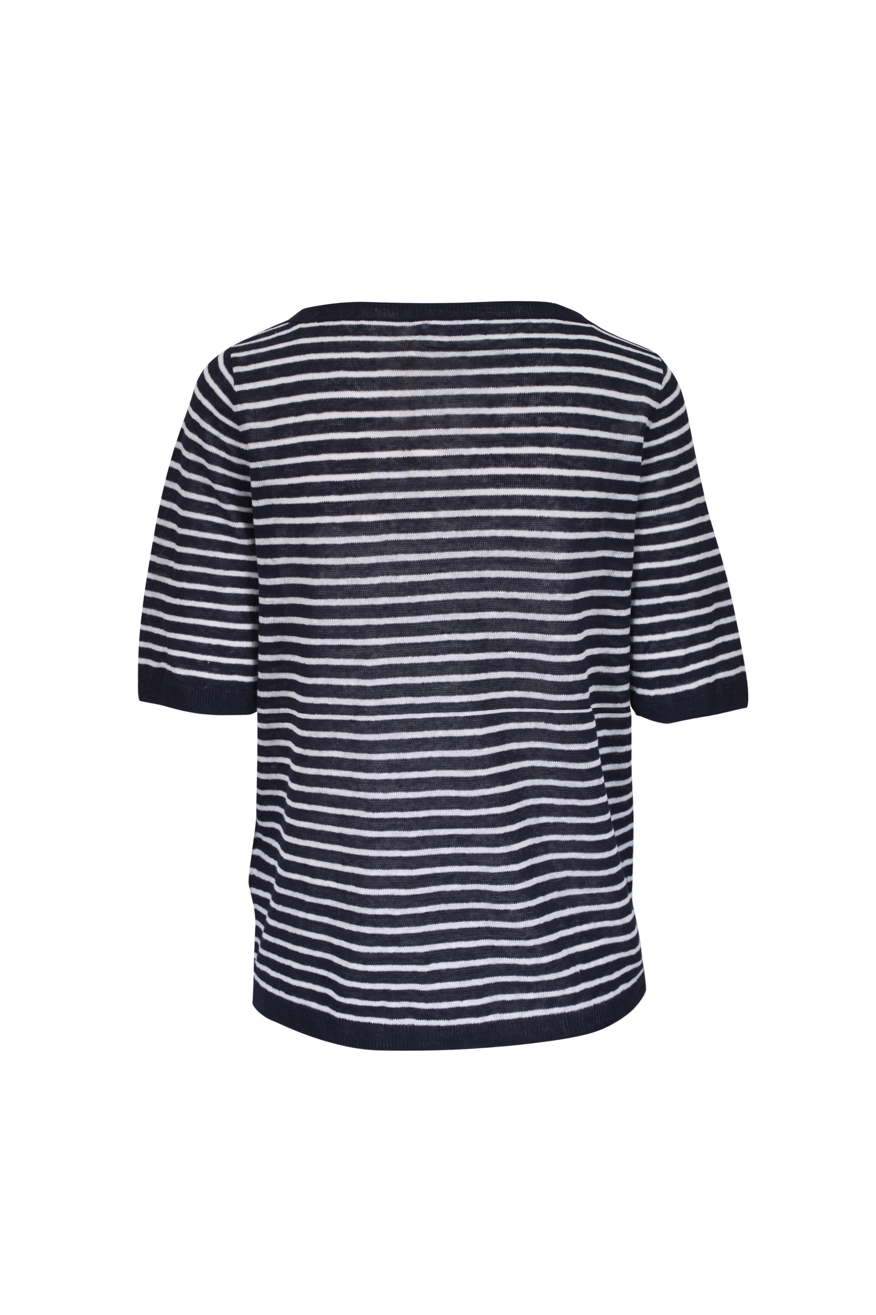 Marine Blue & White Stipe Linen Crewneck T-Shirt
