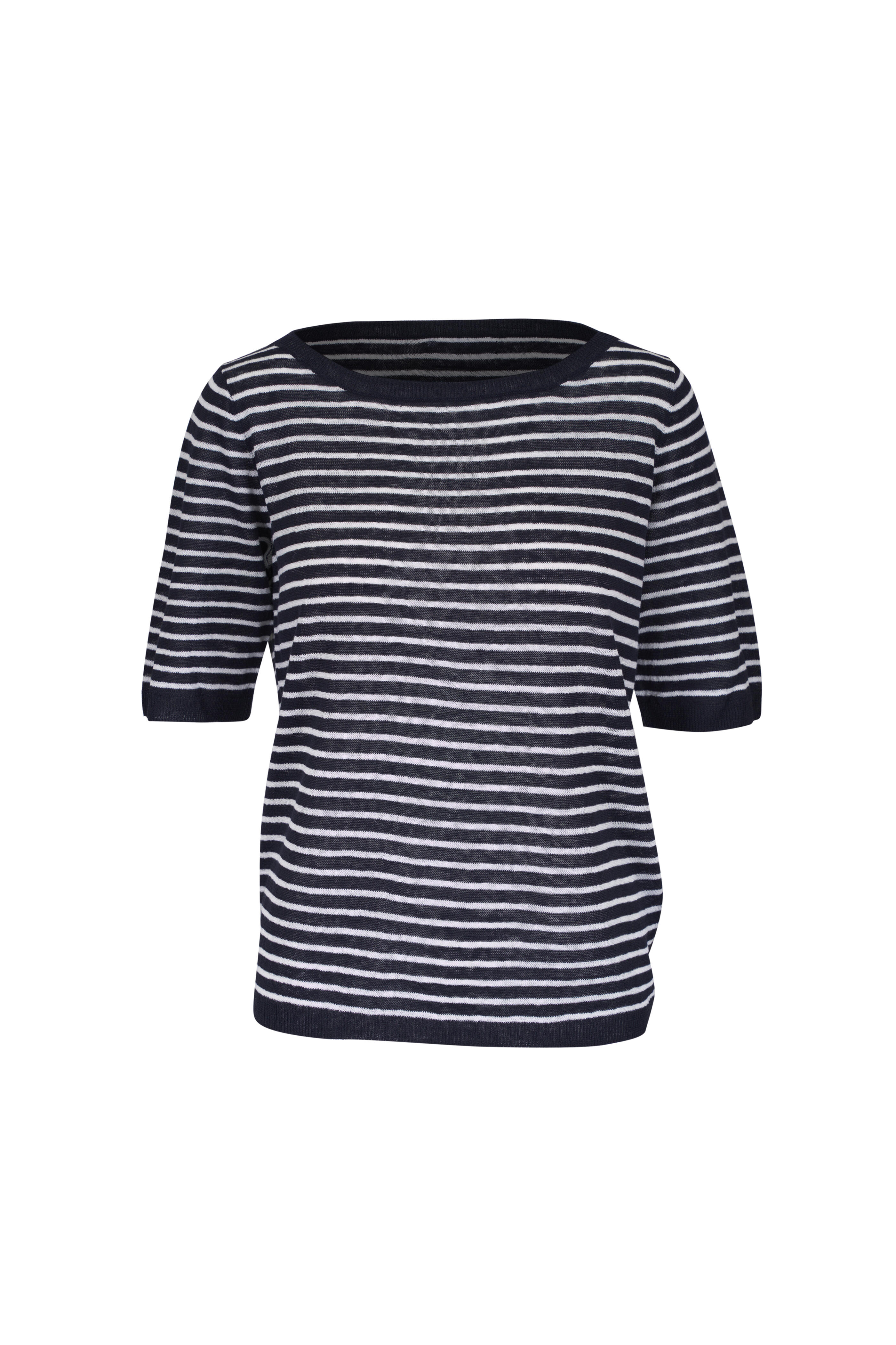 • Majestic - Marine Blue & White Stipe Linen Crewneck T-Shirt