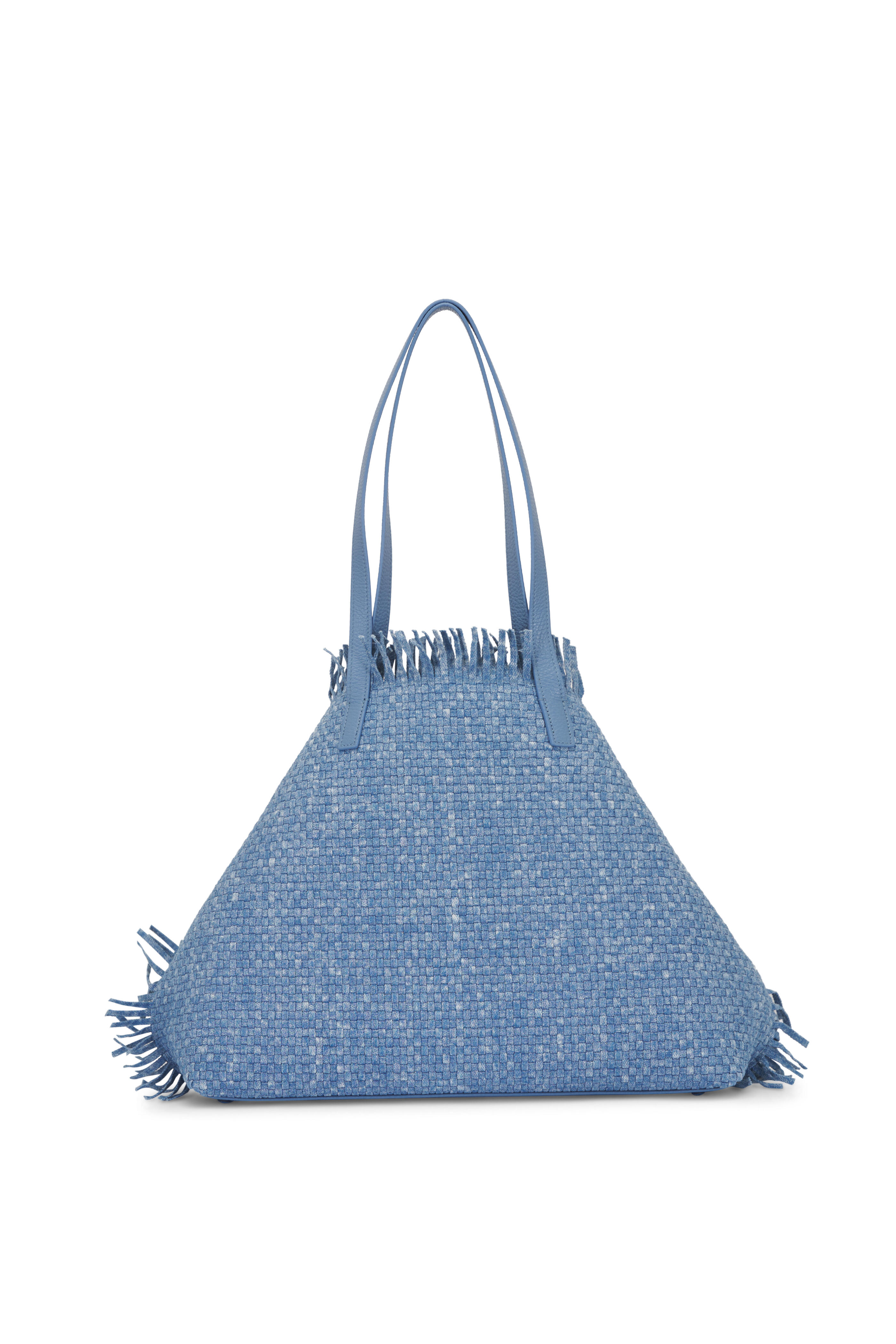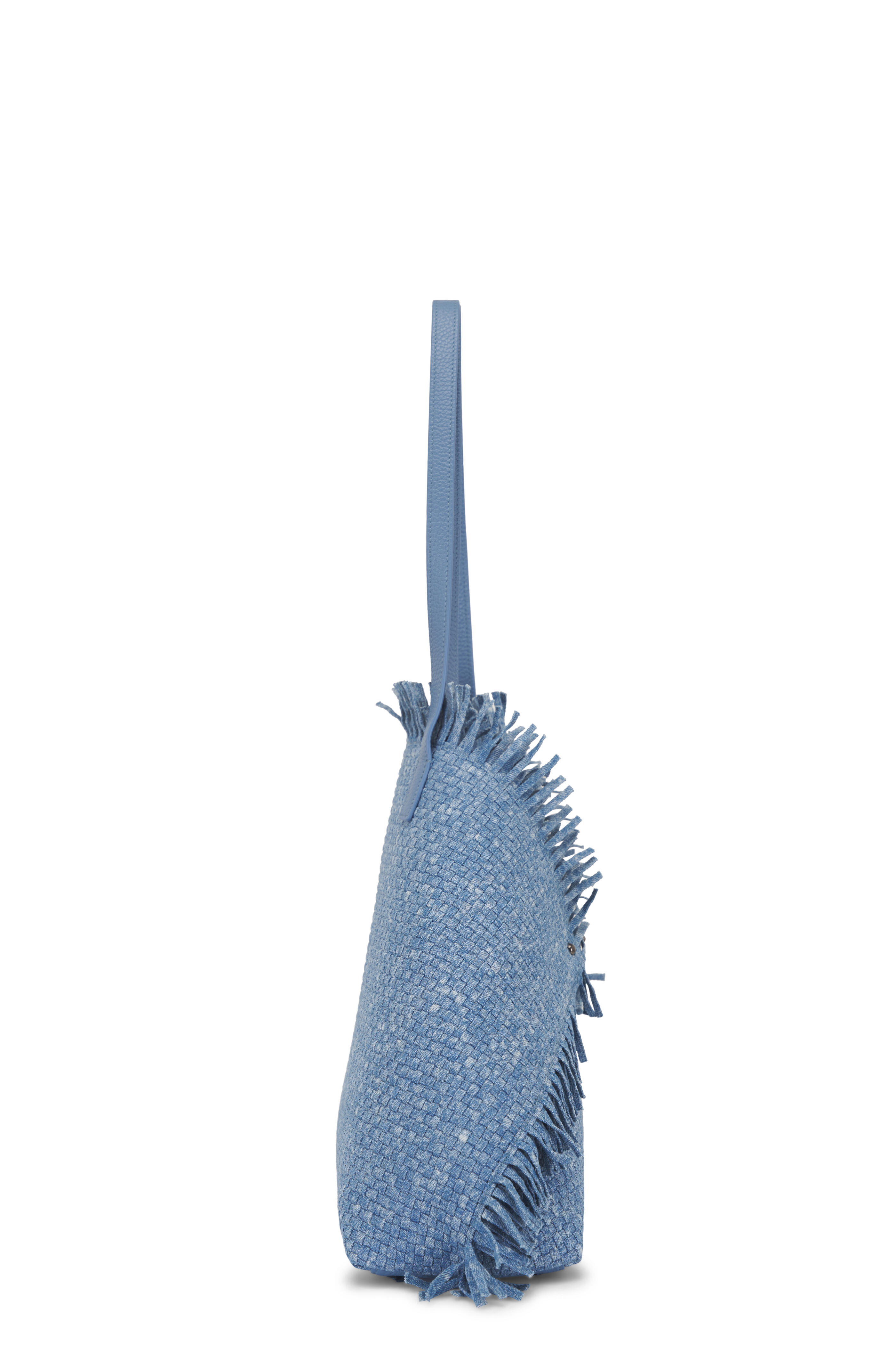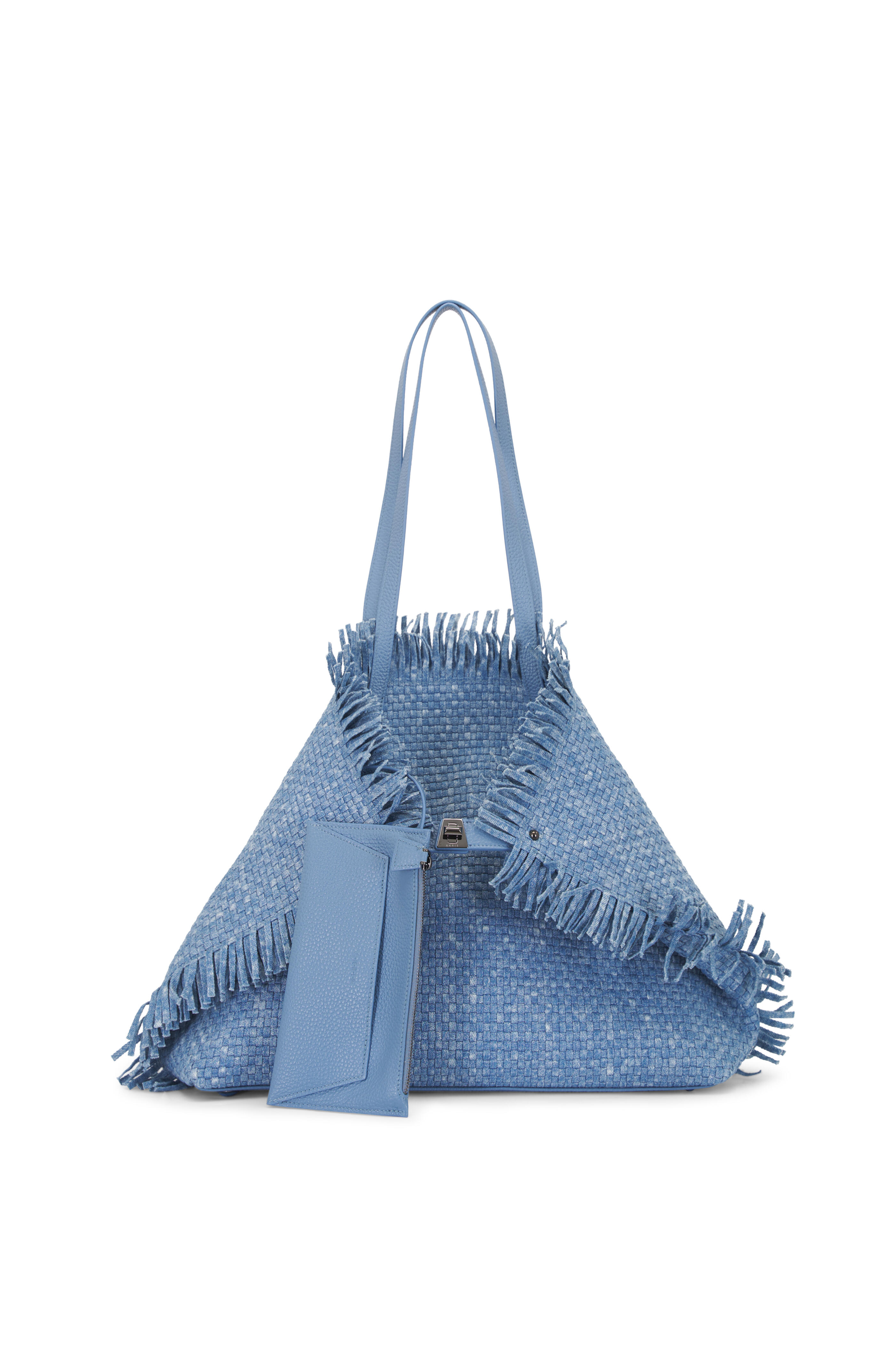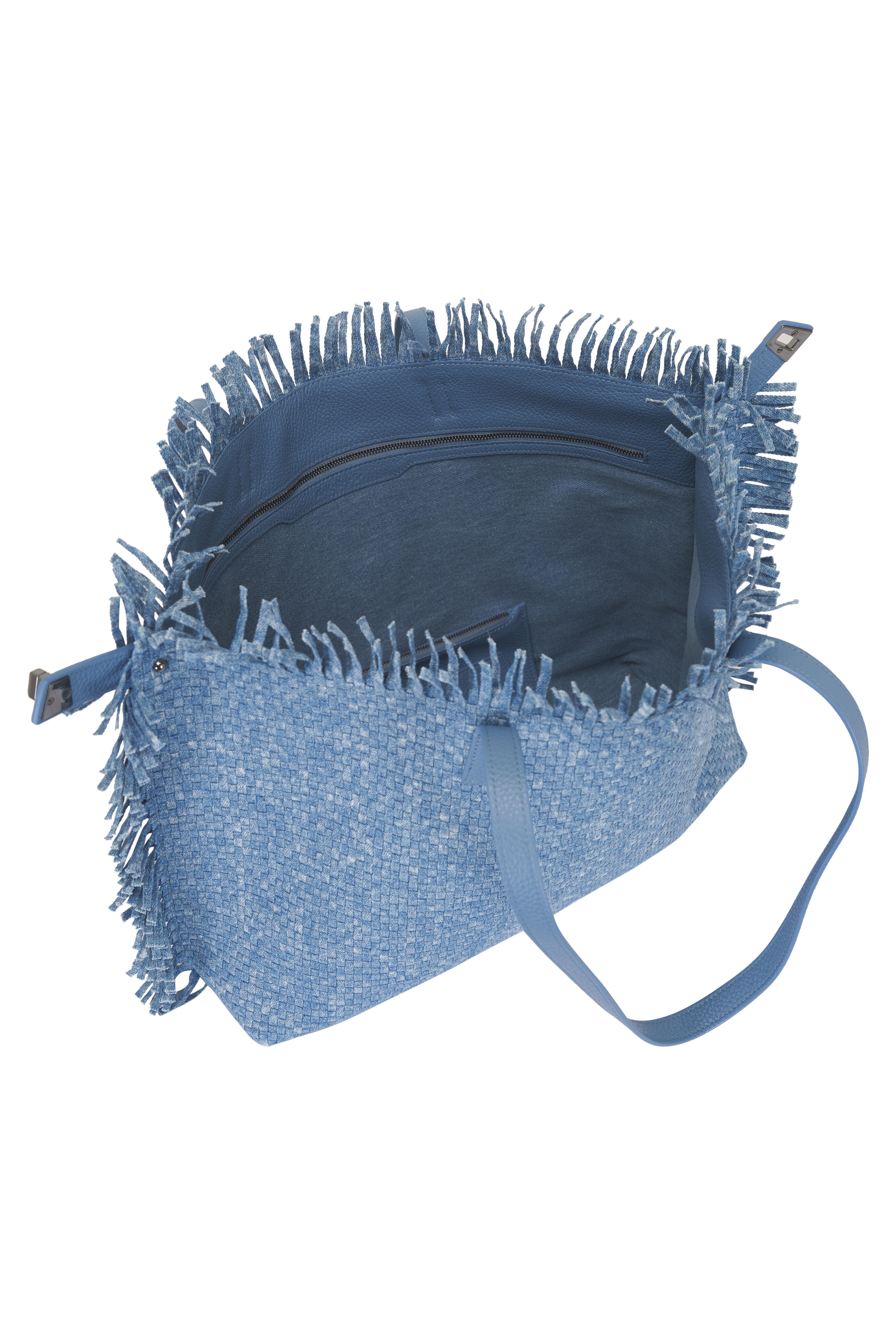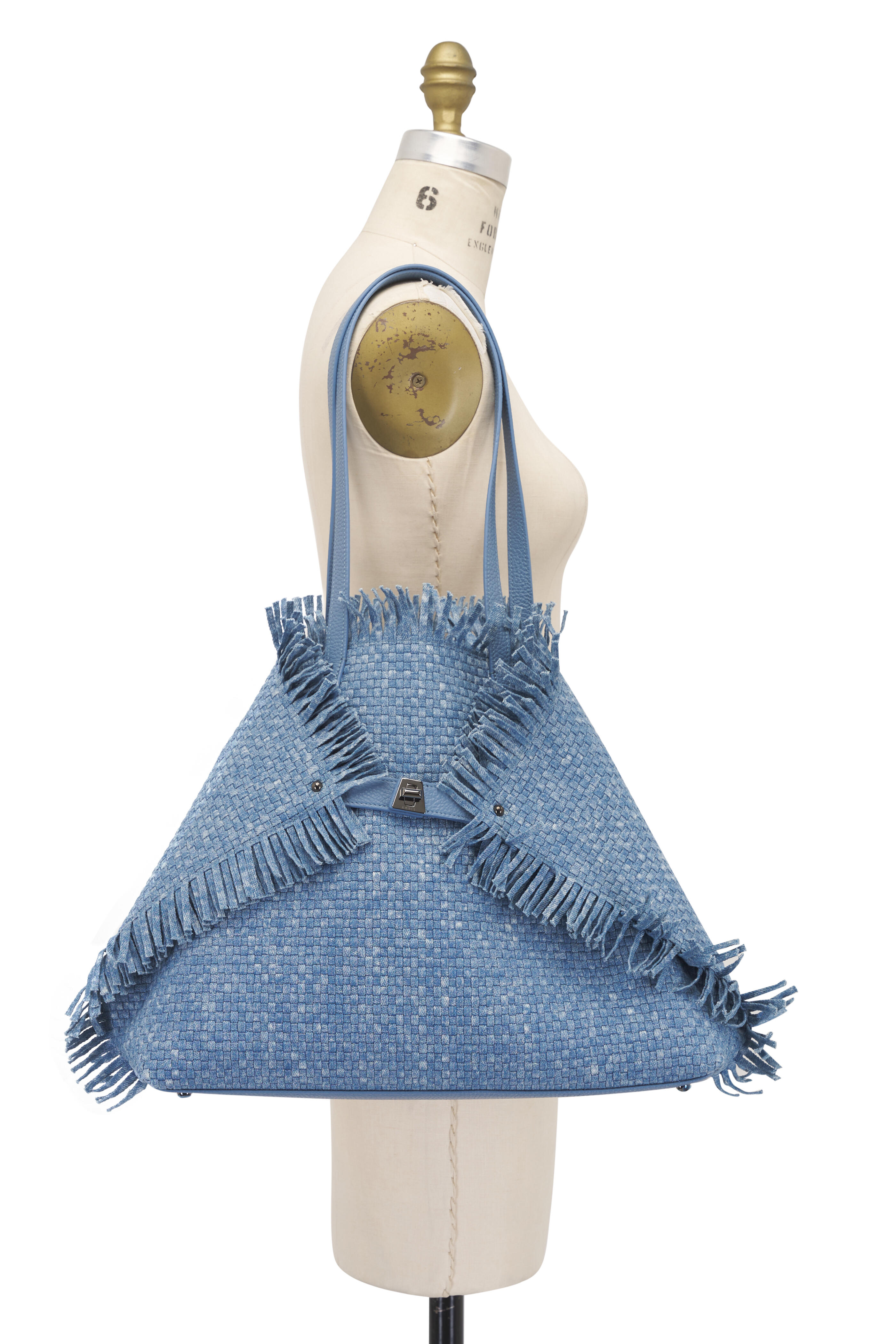 Denim & leather outer. Textile lining. Dual top handles. Open top. Latch closure. Interior zip pocket. Interior slip pockets. Detachable zip pouch. Protective metal feet. Imported. Width: 15". Height: 12". Depth: 4". Strap drop: 11".