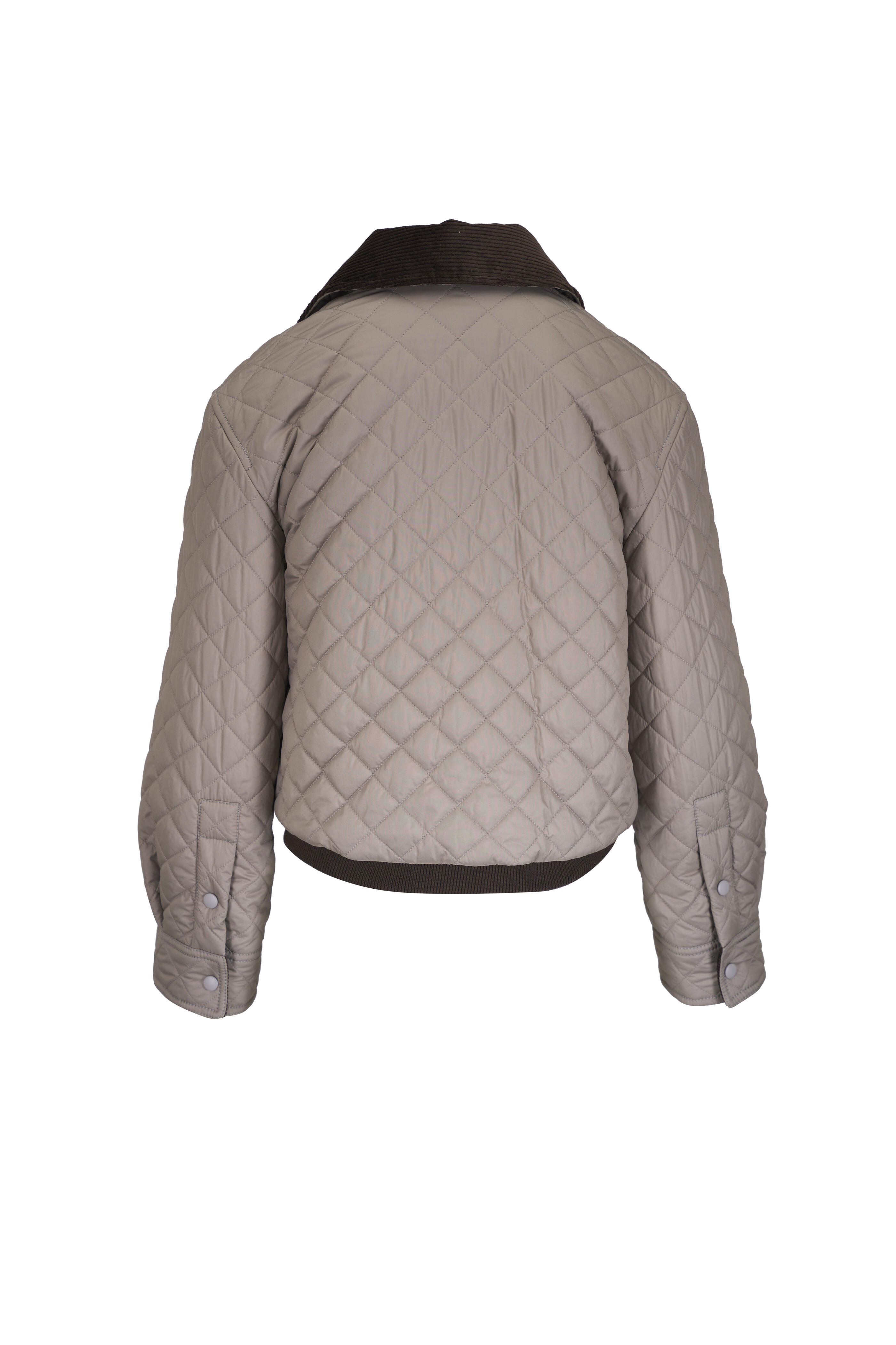 Corduroy collar. Zip front closure. Chest anagram embossed leather patch pocket. Vertical welt pockets, inside welt pocket. Contrast rib knit hem. Interior corduroy cuffs; snap cuffs. Diamond quilted. Made in Italy. Regular fit, short length. 100% polyester. Dry clean.