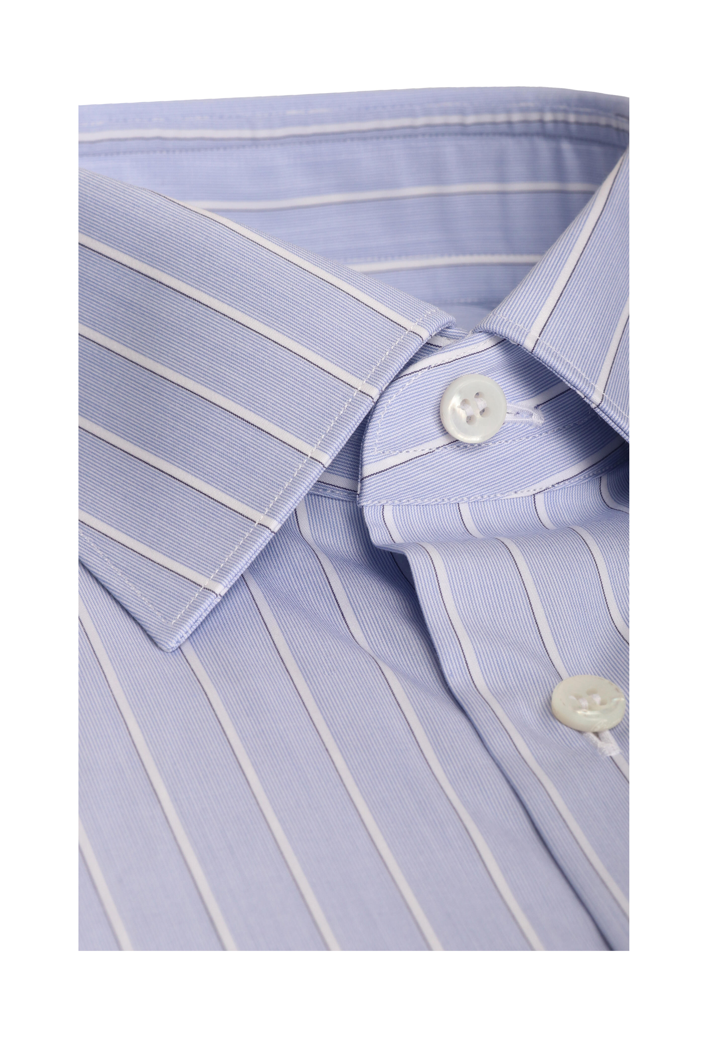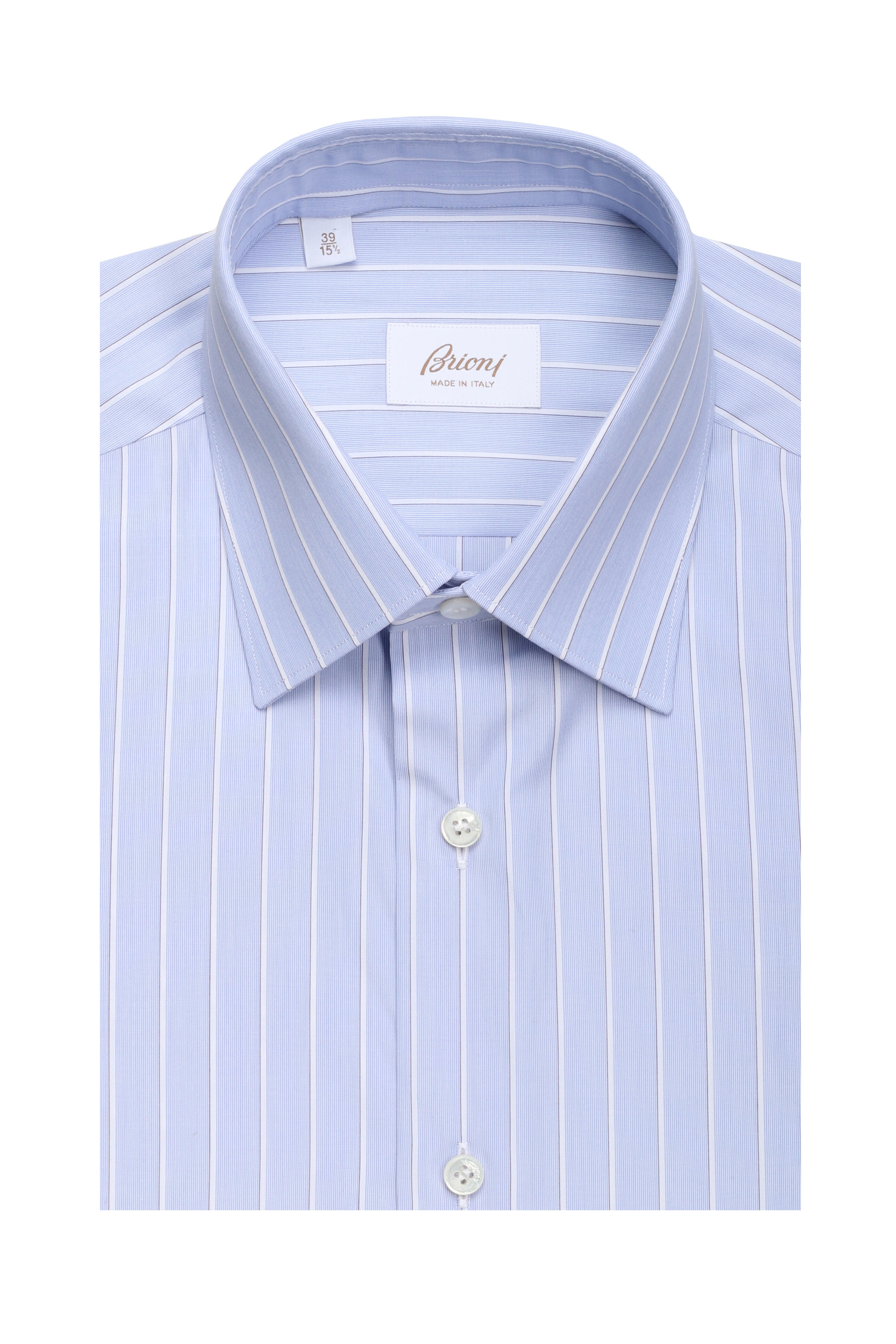 Spread collar. French front button placket. Single button barrel cuffs. Made in Italy. 100% cotton. Dry clean.