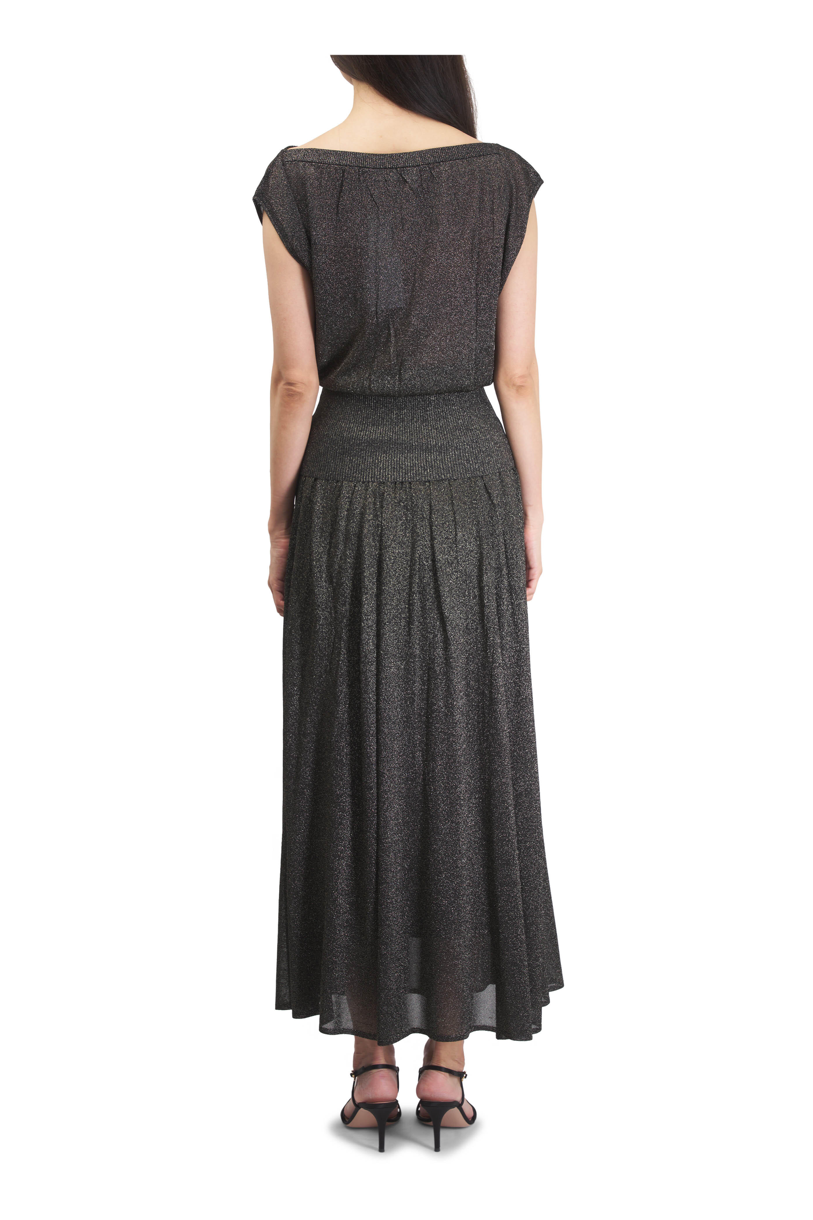 Boat neckline. Elasticized waist. Imported. 88% viscose, 7% metallicized fibers, 5% polyamide; lined. Dry clean.