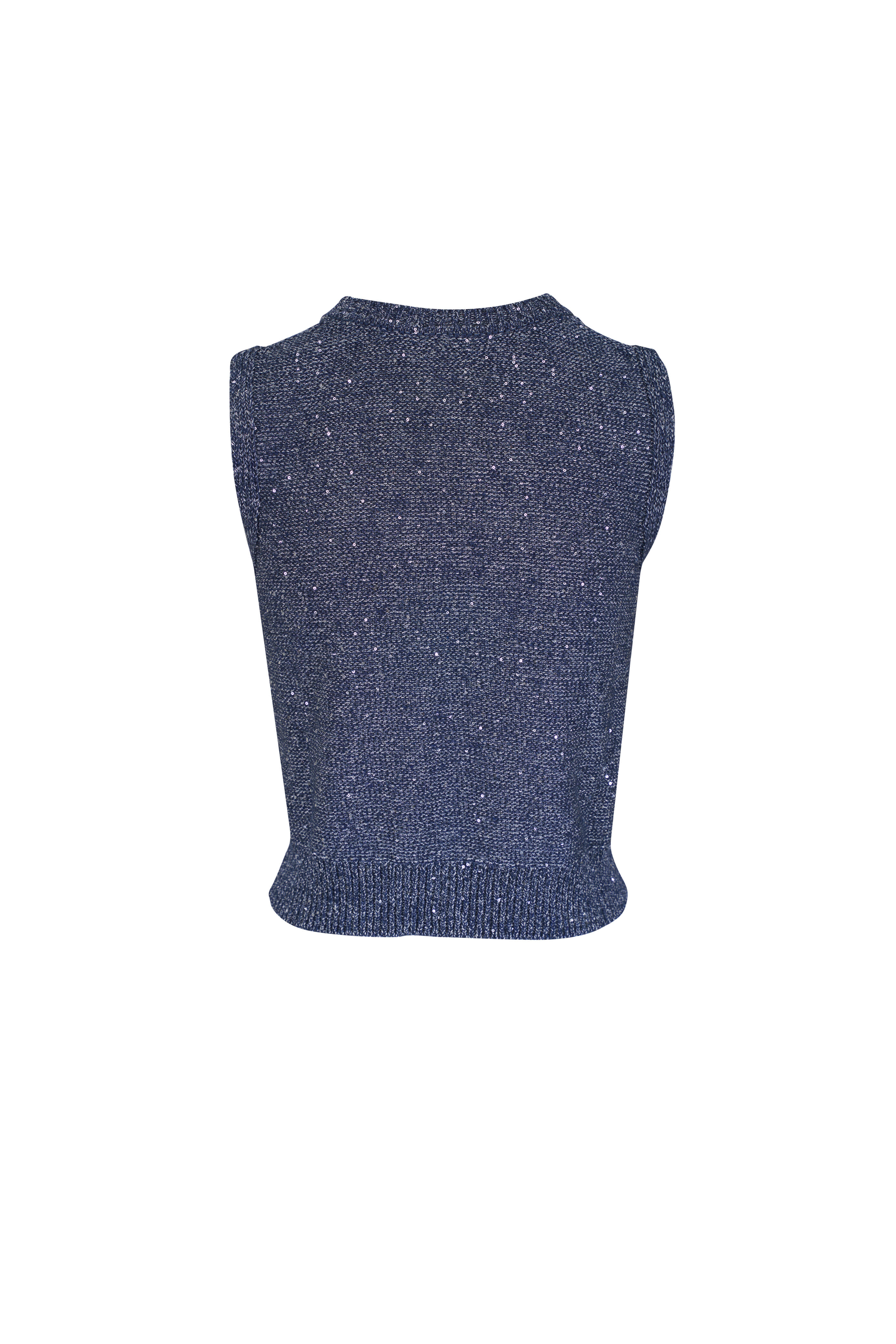 Crew neckline. Ribbed knit trim. All over sequin detailing. Fabric from Italy. Approximately 19" shoulder to hem (measurements taken from size 4). 56% linen, 28% polyester, 16% cotton. Dry clean.