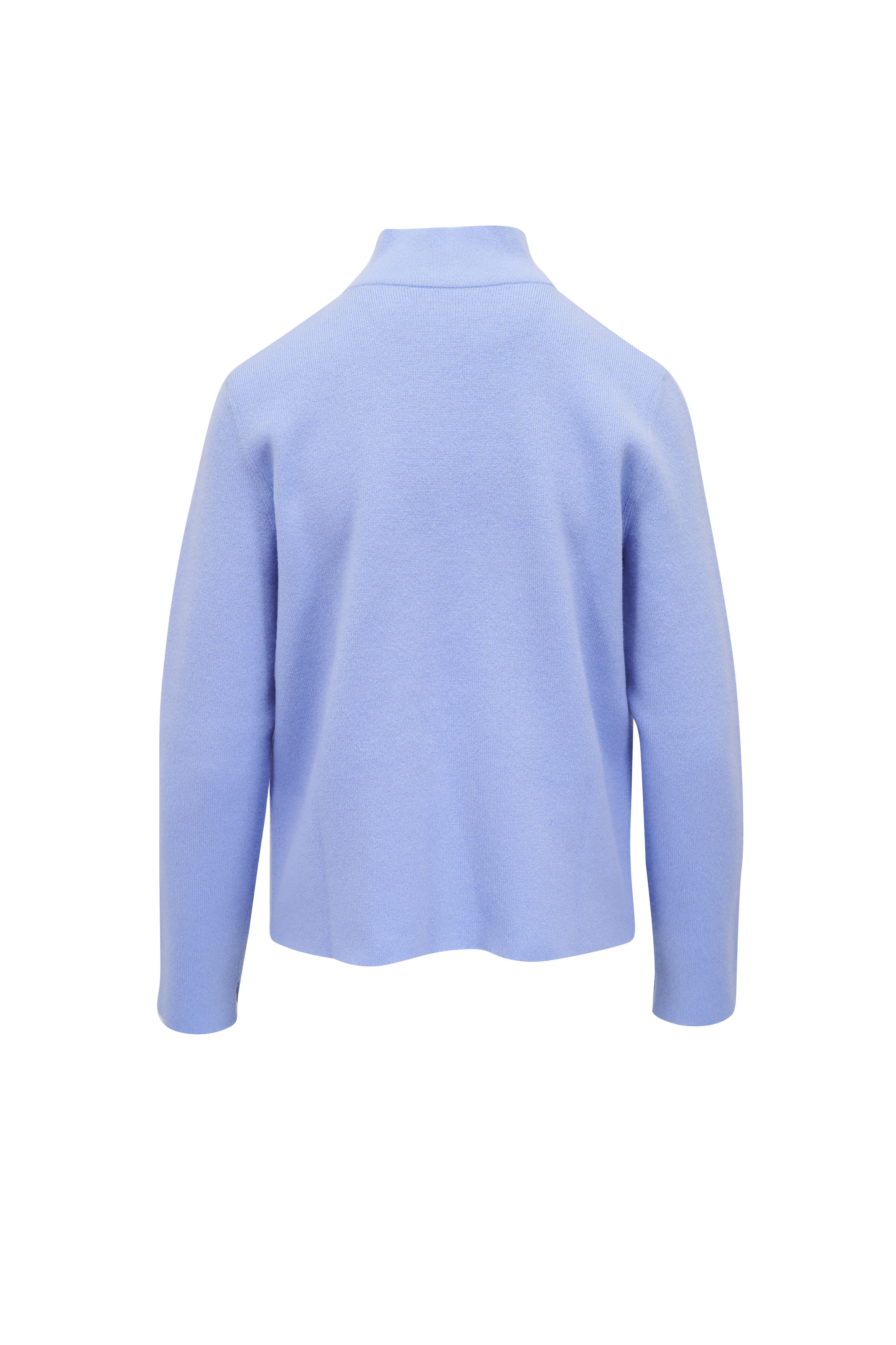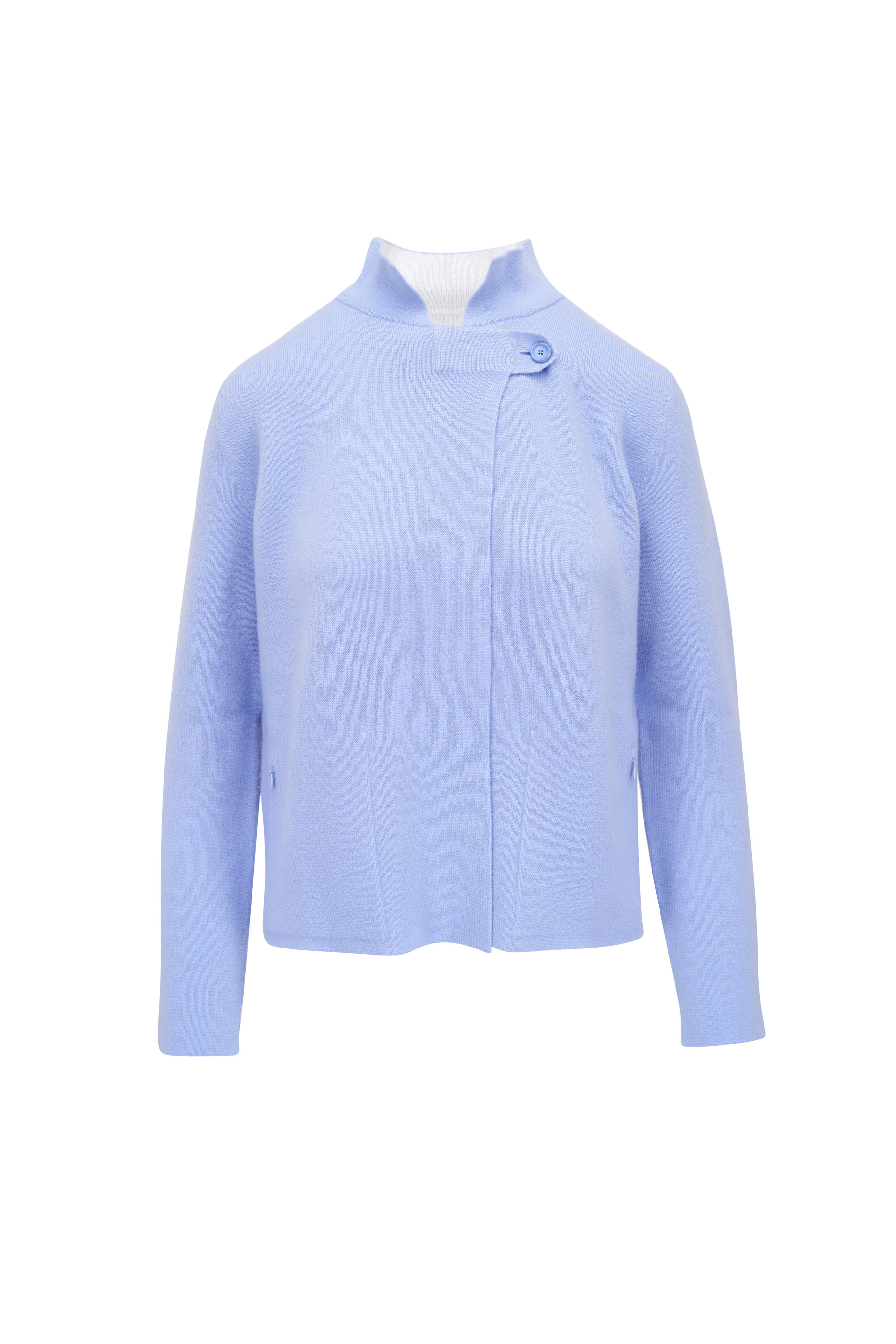 Stand collar. Front button-and- loop closure. Reversible. Lower waist zip pockets; reverse: lower slip pockets. Straight hem. Imported. Shoulder to hem 24" (size 6). 95% Cashmere, 5% elastane. Dry clean.