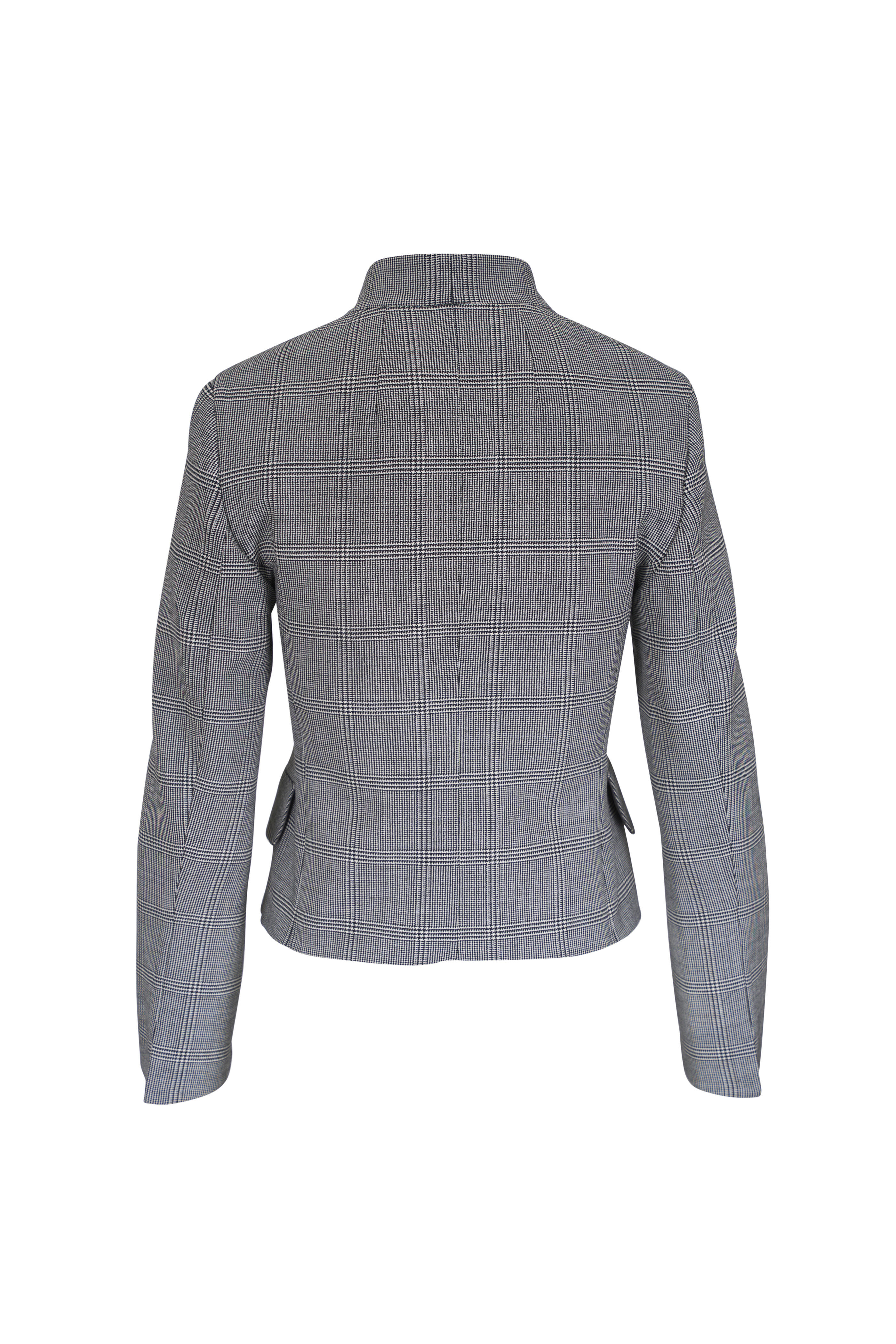 Mandarin collar. Front button placket. Vented cuffs. Lower flap pockets. Imported with Italian fabric. 96% virgin wool, 4% elastane; unlined. Dry clean.