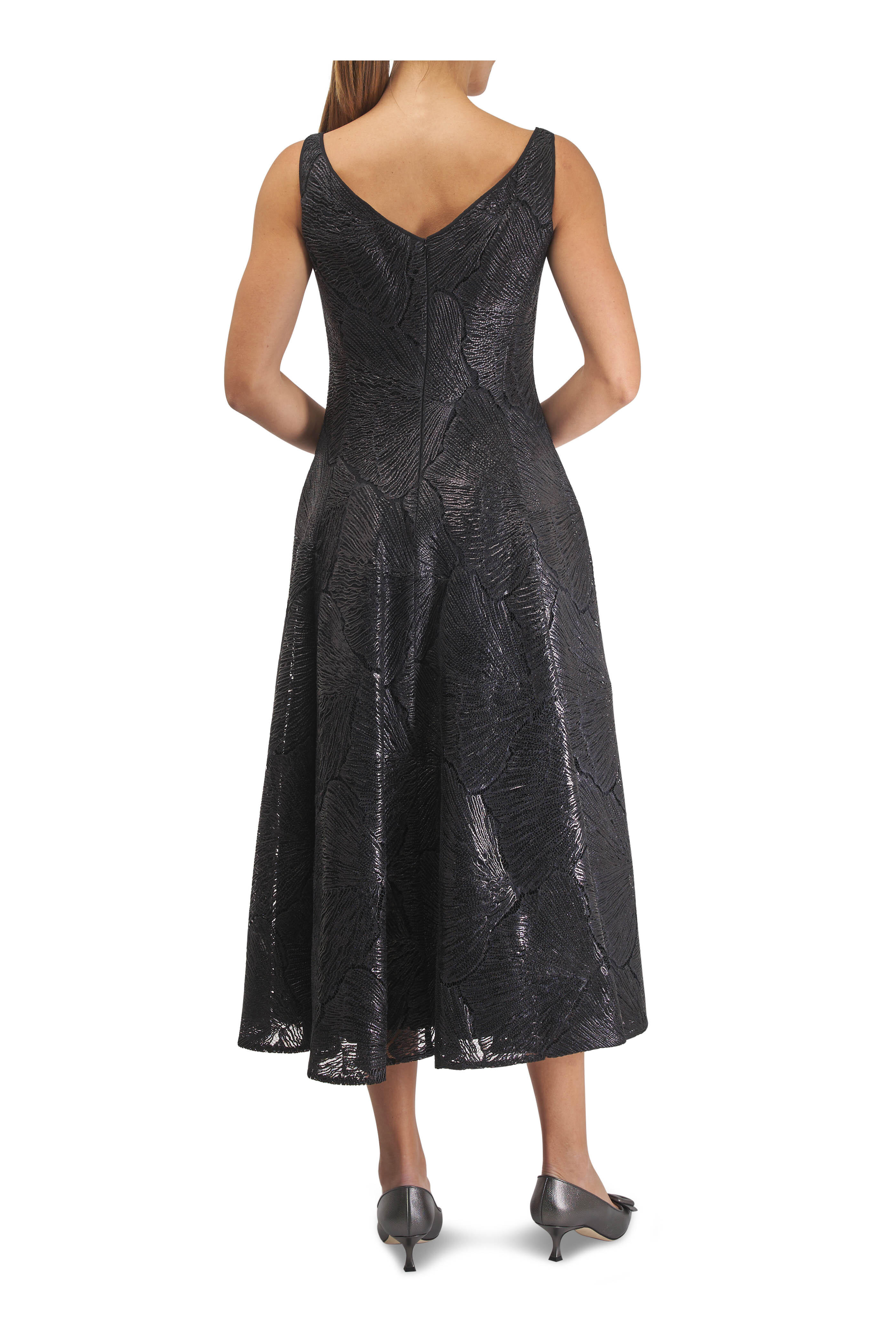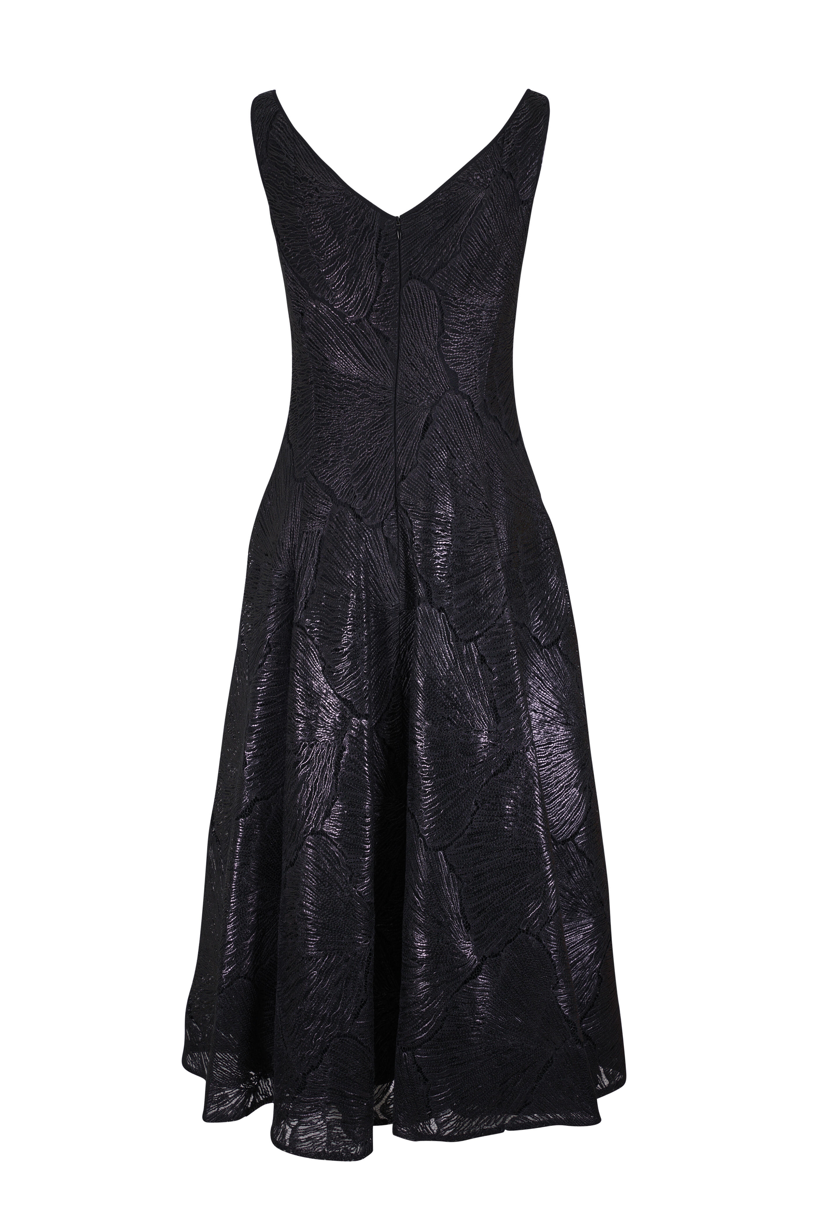 V-neckline. Concealed back zip. Fabric from France. Approximately 51" shoulder to hem (measurements taken from size 6). 100% polyamide; contrasting fabric: 100% mulberry silk; lined. Dry clean.